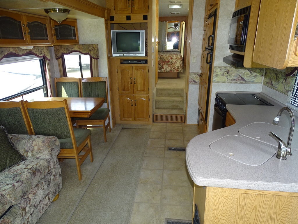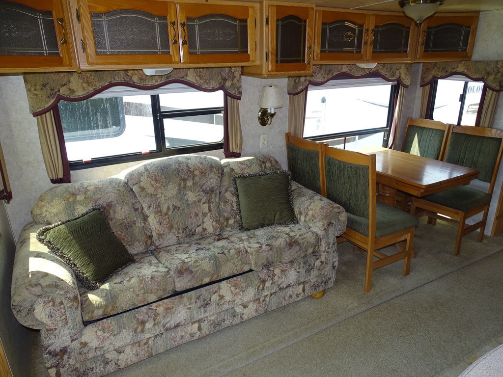 Features Include 2 Slides Ducted A/C Awning 10 Gal. Gas/Electric Water Heater w/DSI 8 cu. Ft. Refrigerator Arctic Package Power Jacks 16" Aluminum Wheels Microwave DVD TV 2 Fantastic Fans Pleated Shades Solid-Surface Counter Tops Free Standing Dinette Hide-A-Bed Weight 8930 lbs