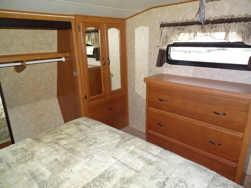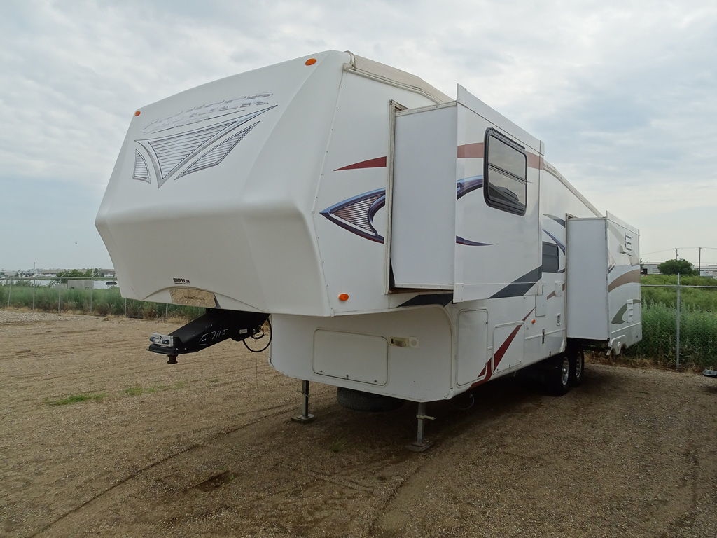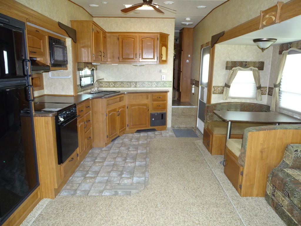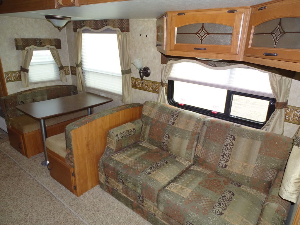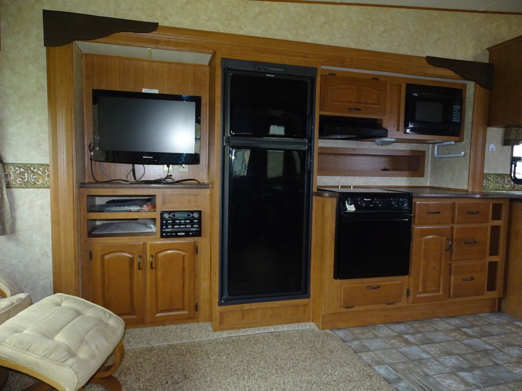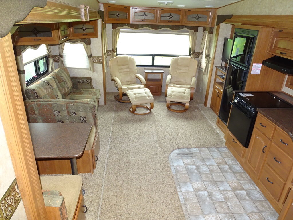 Features Include 3 Slides Ducted AC Power Awning 10 Gal Gas/electric Water Heater w/DSI 8 Cu. Ft. Refrigerator Arctic Package Front Power Jacks Rear Stabilizer Jacks Aluminum Wheels Microwave DVD/CD Home theatre LCD TV Ceiling fan Pleated Shades Hide-A-Bed Outside Speakers Weight 8928 Lbs