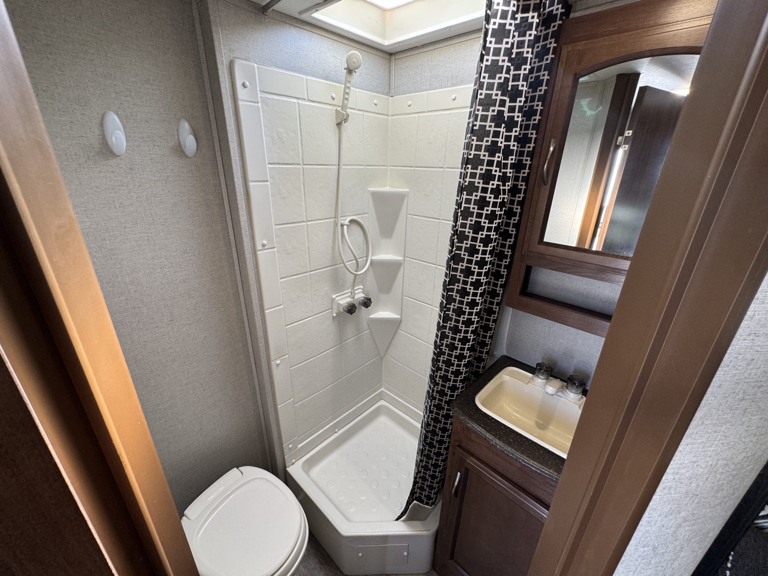 Bathroom: Rear full bathroom with shower, toilet, and vanity