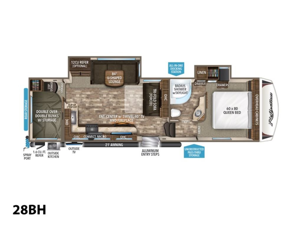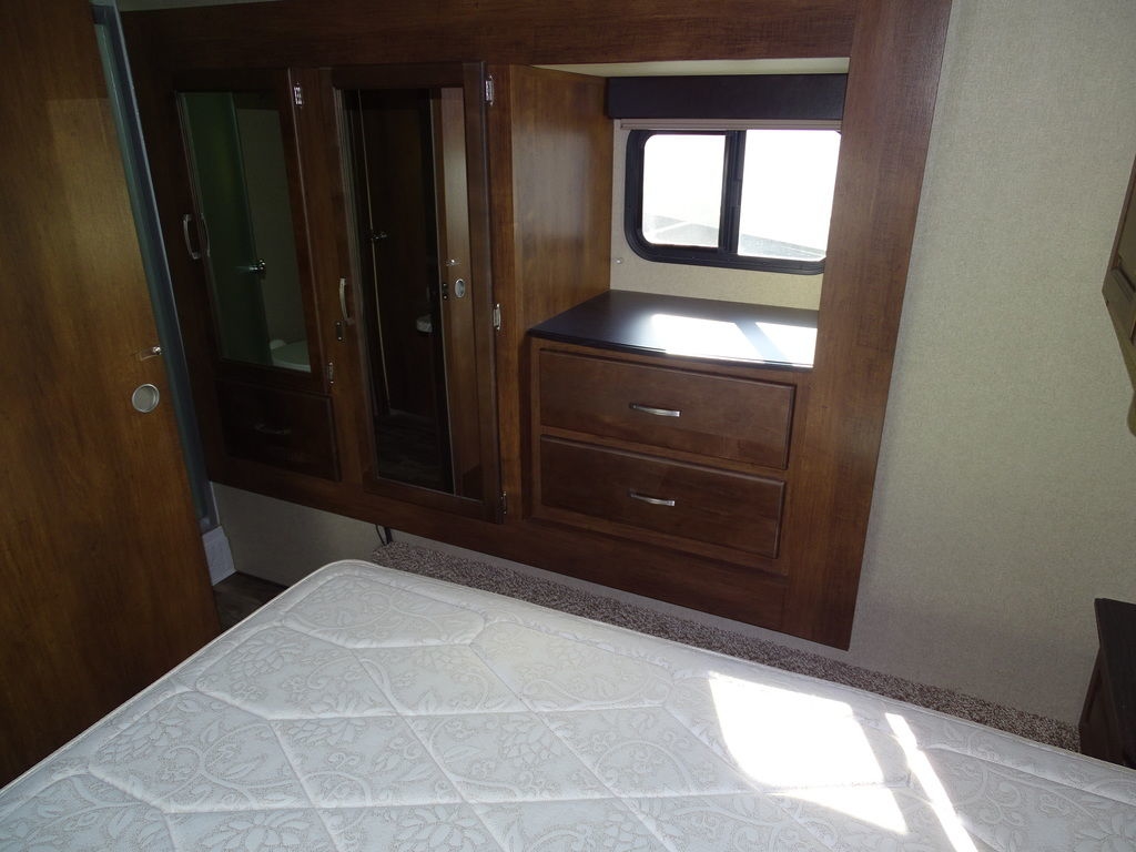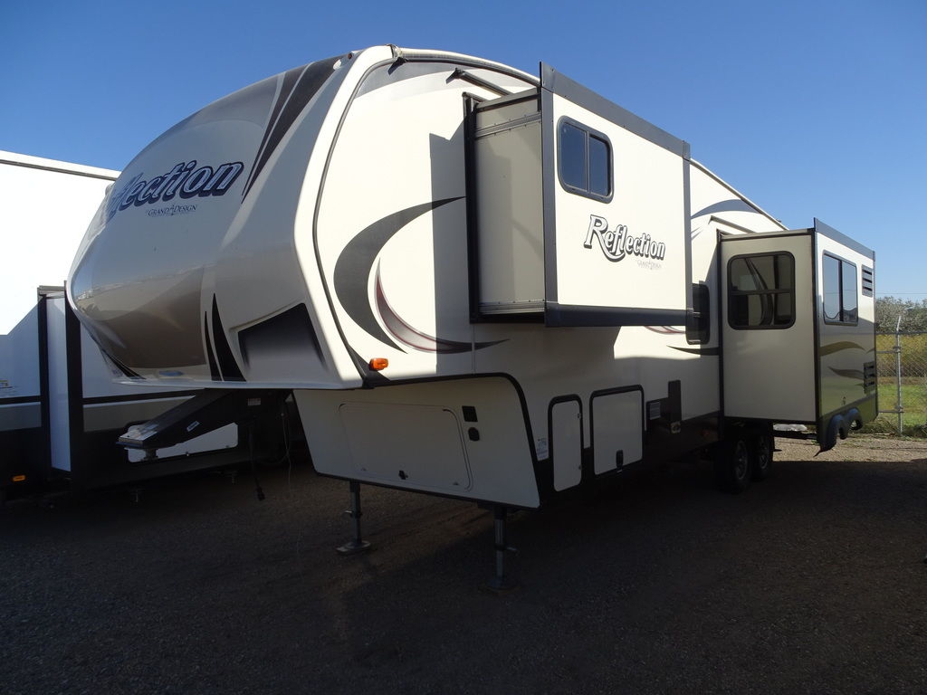 2018 Grand Design Reflection 28BHReflection’s combination of luxury, value, and towability in one amazing package continues to exceed the expectations of our retail customers. Our industry leading pursuit of quality and commitment to building around the needs of our retail customers is what drives Reflection to the top of its class.Features may include:ExteriorAerodynamic Front Cap with Max Turn RadiusMarine Grade LED Hitch LightLED "Night Lights" Under Bedroom SlideEqua-Flex Rubberized Suspension SystemCorrect Track Axle Alignment SystemAluminum Wheels with E-Rated Tires80% Tint Radius Safety Glass WindowsBattery Kill Switch in Pass Thru Storage AreaExtended Pin Box30# LP Bottles (2)30" Radius Entry DoorOutside SpeakersOutside ShowerFactory Installed Roof LadderUnder Carriage Spare Tire and CarrierHigh-Capacity Water Pump with Interior and Exterior Switch"EZ" Winterize Water Heater Bypass Valve"EZ" Siphon Fresh Water Fill FeatureExtra Large Fresh Water Drain ValveInteriorHand Rubbed Maple Cabinet DoorsSolid Hardwood Drawer FrontsLouvered Tread Steps to BedroomSolid Core Cabinet StilesPre-drilled and Screwed CabinetryBall Bearing Full Extension Drawer GlidesTri-Fold Hide-A-Bed SofaWall Hugger Theatre SeatingDeep Overhead Cabinets in Slide OutLarge Panoramic Slide Room WindowsPremium Beauflor Flooring with 7-year WarrantyDuctless Flooring Throughout Living AreaResidential Style Window TreatmentLED Lighting Throughout with Motion Sensors (Key Areas)KitchenSolid Surface LG Brand CountertopsGunstock Fixtures and HardwareDeep, Undermount Kitchen SinkResidential Style MicrowaveHardwood Galley Slide Trim Moldings and End CapsMaxxAir 12v with Rain SensorBathroomNeo-Radius Shower DoorsWide View Skylight Over ShowerHeat Duct and A/C Vents in BathroomCustom Designed Shower Pan and SurroundPower Vent FanExtra Large Lav Top with Acrylic SinkLarge Medicine Cabinet with MirrorBedroomKing Size WardrobeBlack Label Pillowtop MattressOversized Underbed StorageResidential BedspreadBedroom Heat RegistersCloseable A/C VentsTV and Cable PrepConstructionGel Coated Tan Fiberglass ExteriorResidential 5" Truss Rafters (16" O.C.)Walk On Roof DeckingFiberglass and Thermofoil Roof and Front Cap InsulationOne-Piece TPO Roof Membrane with 12 Year WarrantyEasy Access Low Point Drain ValvesLaminated Aluminum Framed Rear Wall (R-9)Laminated Aluminum Framed Side Walls (R-9)Laminated Aluminum Framed Roof and End Walls in Slide Rooms (R-9)Aluminum Framed Main Floor (R-30)Residential Wood Framed Roof (R-40)HVAC & Plumbing2nd A/C Low Profile 13.5k BTU DuctedUtilitiesOne Touch Auto Leveling Features Include 2 Slides Ducted A/C Power Awning Gas/Electric Water Heater w/DSI 12 Cu. Ft. Refrigerator