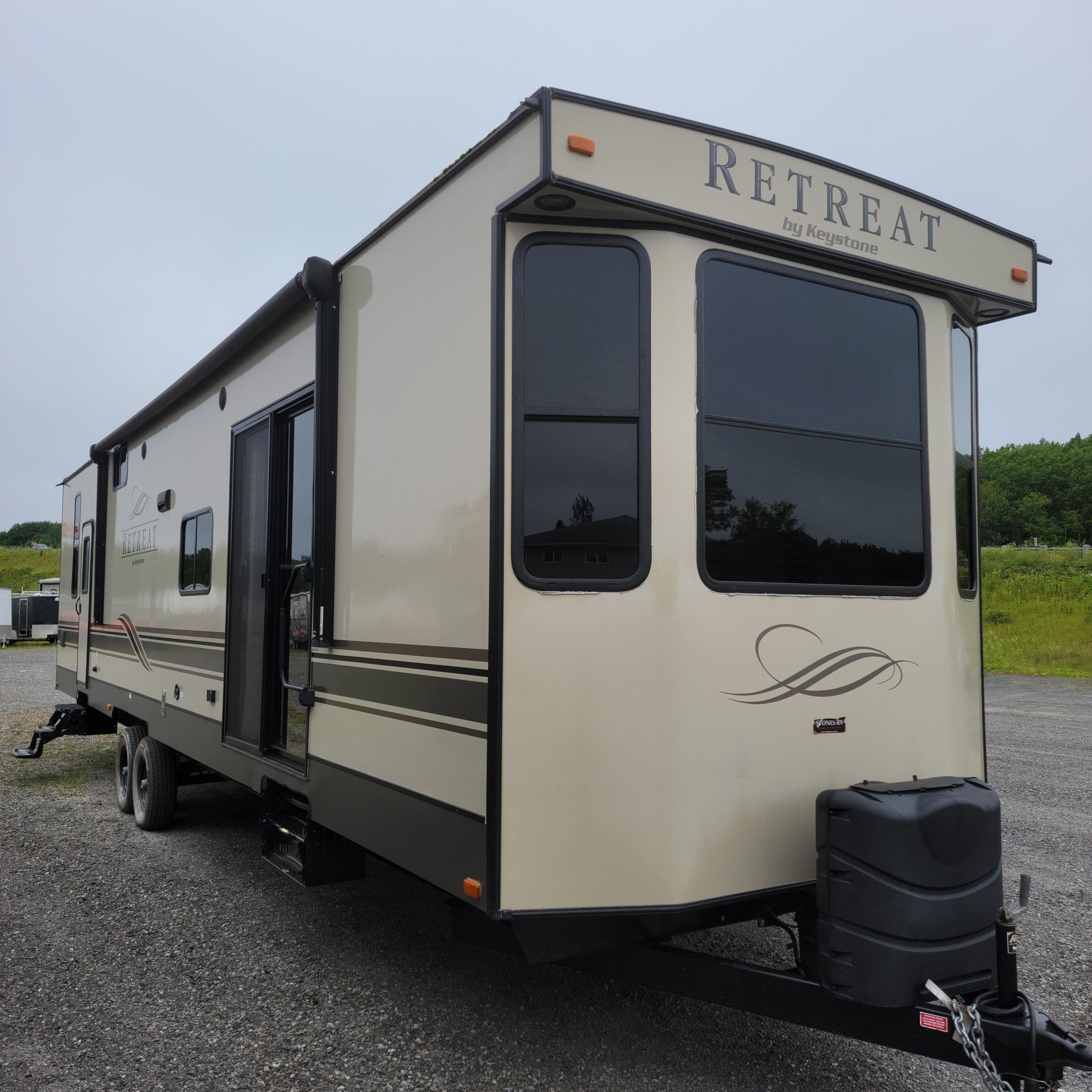 Available at Stone’s RV, this pre-owned 2018 Keystone Retreat 391FDEN is a 41′ destination trailer that sleeps 4 people. With a dry weight of 10,618 lbs, the Retreat 391FDEN is designed to stay put at your seasonal site.
