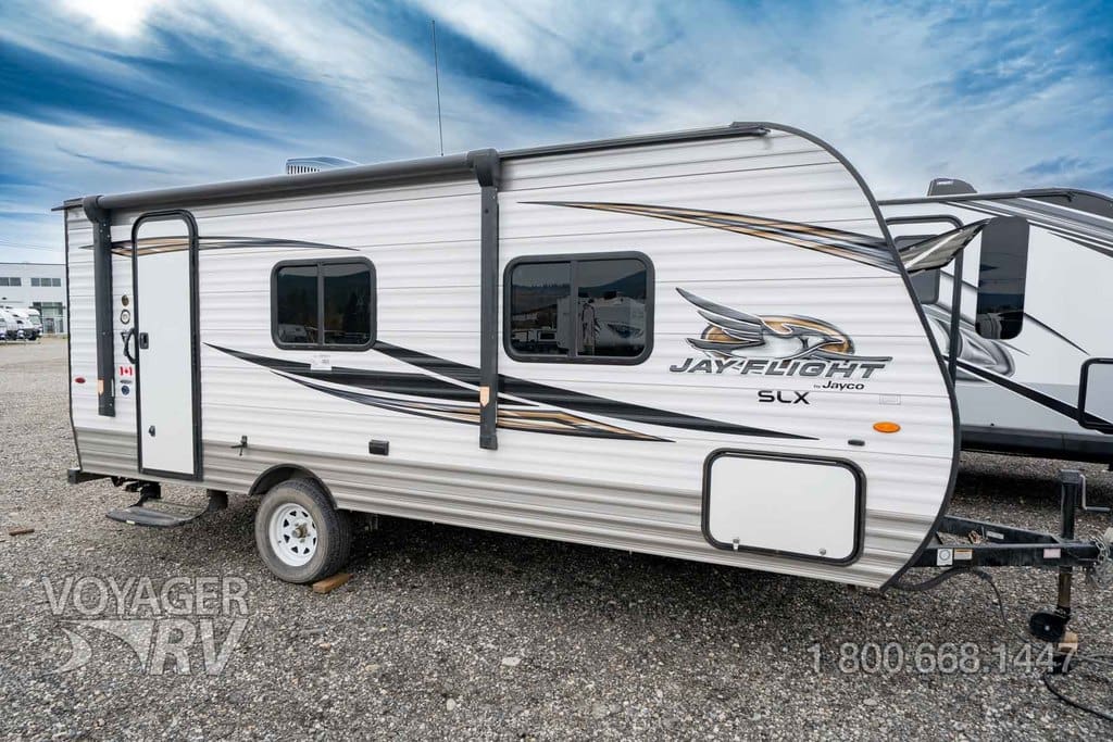 The Pre-owned 2019 Jayco Jay Flight 195RB, measuring approximately 21′ 8in in length, a no bunks floorplan, sleeping up to 3 people, queen bed, and a face to face dining area.