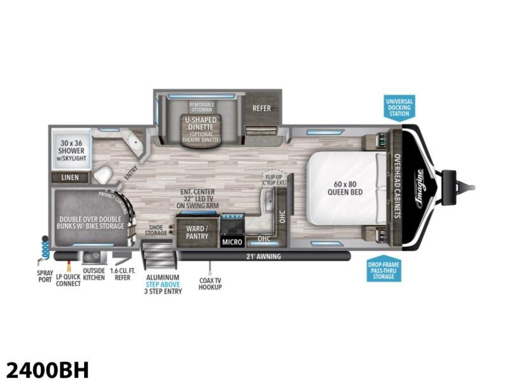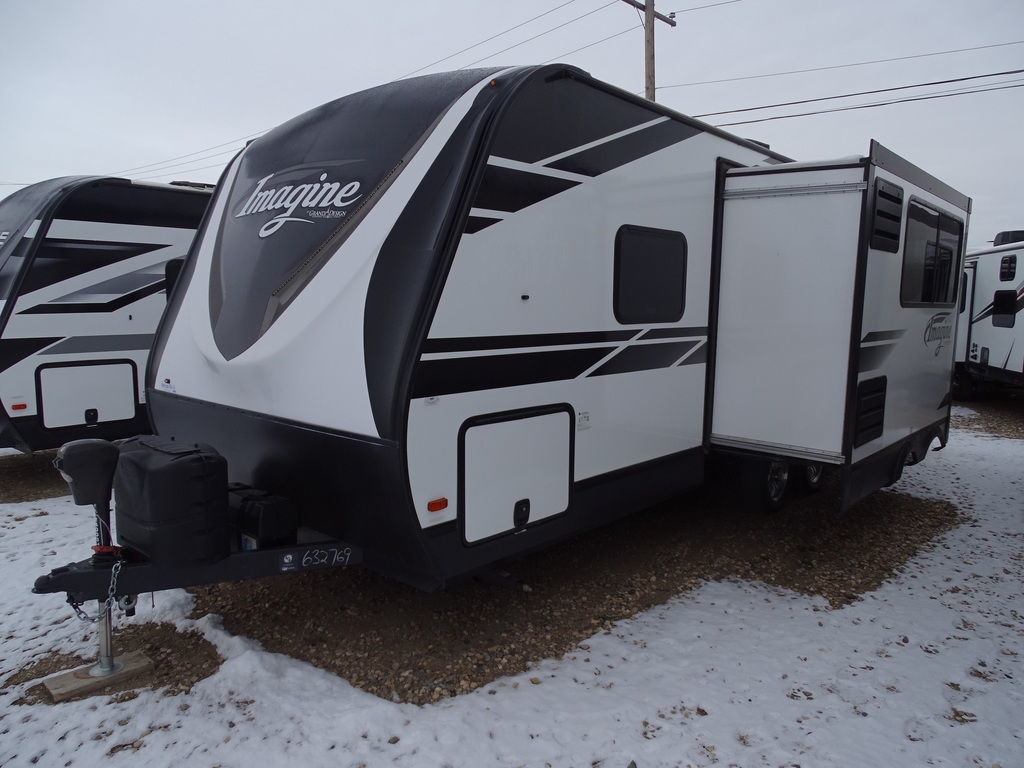 2021 Grand Design Imagine 2400BHTake Off. Imagine the Places.Imagine leaving the world behind for the weekend…maybe a family stay-cation. Imagine, you just want to get away, now. Packing up and starting out is as easy as “tow and go.” Imagine your delight with every unique detail. An experience for today, tomorrow, and from sunrise to sunset, in every climate you visit. Imagine reaching today’s destination, and the comfort of relaxing for the night, surrounded by the many special Grand Design-only quality touches. You’re towing light, without compromise, and reaching your every imagined on-the-road milestone.Features may include:InteriorSolid Drawer FrontsSolid Core Cabinet StilesPre-Drilled and Screwed Face FramesBall Bearing Full Extension Drawer GlidesLarge Panoramic WindowsUpgraded Residential FurnitureRadius Ceiling with 81" Tall HeadroomExteriorRoof LadderPower Tongue JackSolar Power InletBackup Camera Prep6' Coily Hose Breakaway CableBlack Tank Flush80% Tint Radius Safety Glass Windows20 lbs LP Bottles (2)28" Radius Entry DoorExterior SpeakersHigh-Capacity Water PumpBattery Kill Switch (Pass Thru)Extra Large 2” Fresh Water Drain ValveOversized Tank Capacities Features Include 1 Slide Ducted A/C Power Awning Gas/ Electric Water Heater w/DSI 8 Cu. Ft. Refrigerator Arctic Package Jack & Jack bunks Power Tongue Jack Front Stabilizer Jacks Rear Stabilizer Jacks Diamond Plate Rock Guard Aluminum Wheels Microwave DVD/Cd Home Theatre LED TV LED Lighting Roller Shades U-Shaped Dinette Outside Shower Outside Kitchen Weight 5956 Lbs.