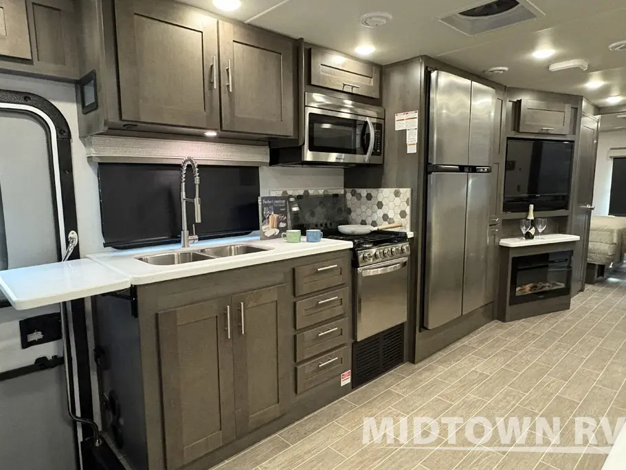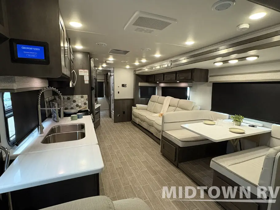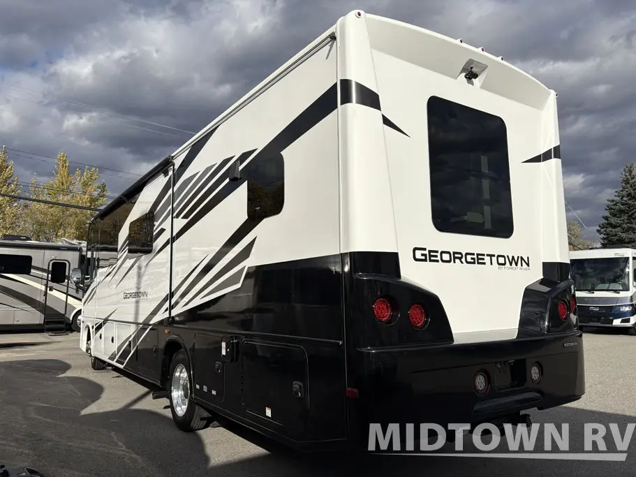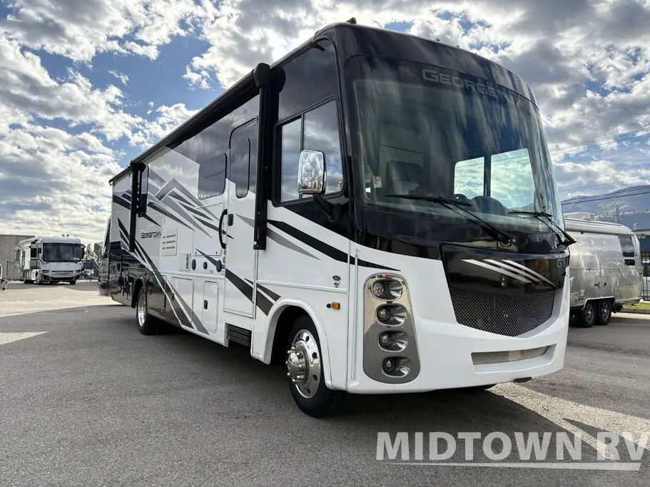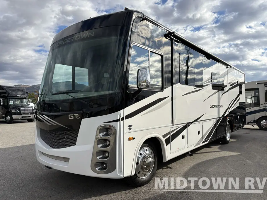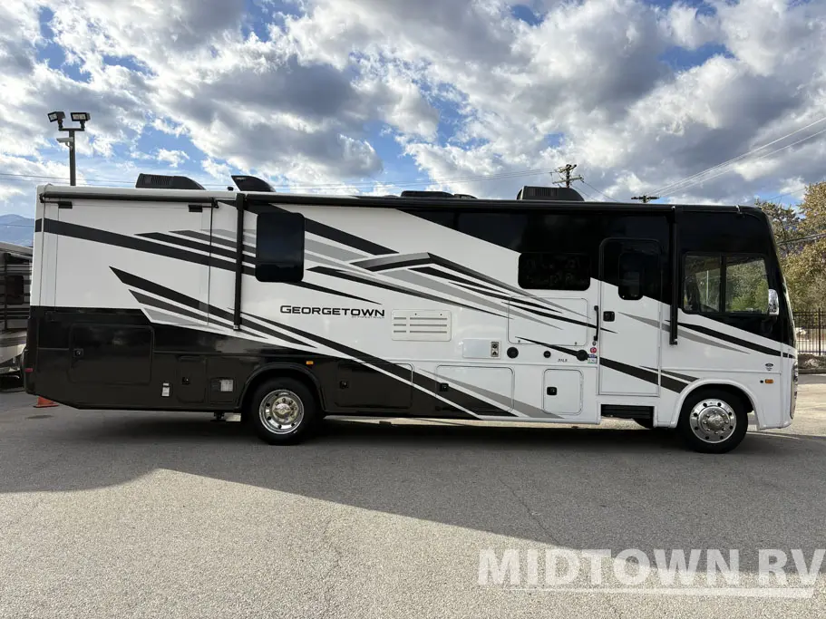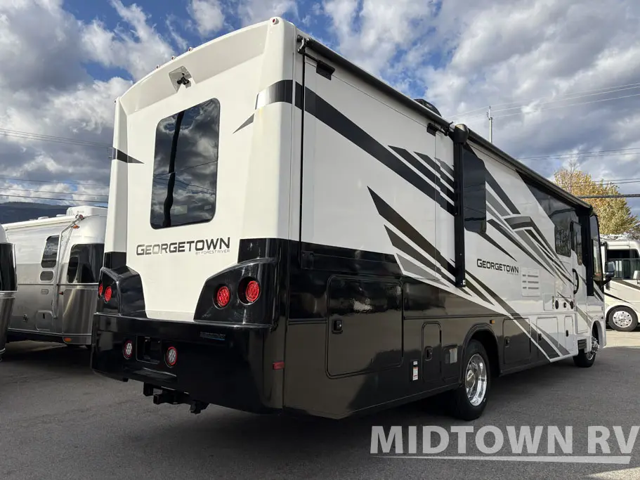 This very well-kept 2022 Georgetown G5 31L combines comfort, style, and modern amenities in a manageable 34-foot Class A motorhome. Designed for both weekend getaways and extended adventures, it offers the ideal balance of luxury and drivability. Powered by a reliable Ford V8 chassis, the Georgetown delivers smooth handling and plenty of power for highway cruising or mountain driving. The exterior features clean modern styling, generous storage compartments, an automatic leveling system, and a large power awning with LED lighting for effortless outdoor living. The gourmet kitchen is equipped with solid-surface countertops, residential style appliances, and ample storage. A comfortable seating arrangement faces the entertainment center with fireplace and TV, while the booth dinette easily converts for extra sleeping space. The private rear bedroom features a king bed, wardrobe storage, and its own TV, while the bathroom offers a large shower and modern finishes. With sleeping for up to six, this coach is perfect for couples or families. For additional information please contact us at 1-800-667-4667, or come down and see for yourself at our Midtown RV location, 310 Industrial Ave. West, Penticton, BC. During business hours please call or text us at 250-492-5705, for all after-hour sales inquiries email us at [email protected]. Dealer VSA#5114. Pricing excludes $599 documentation fee and applicable taxes.