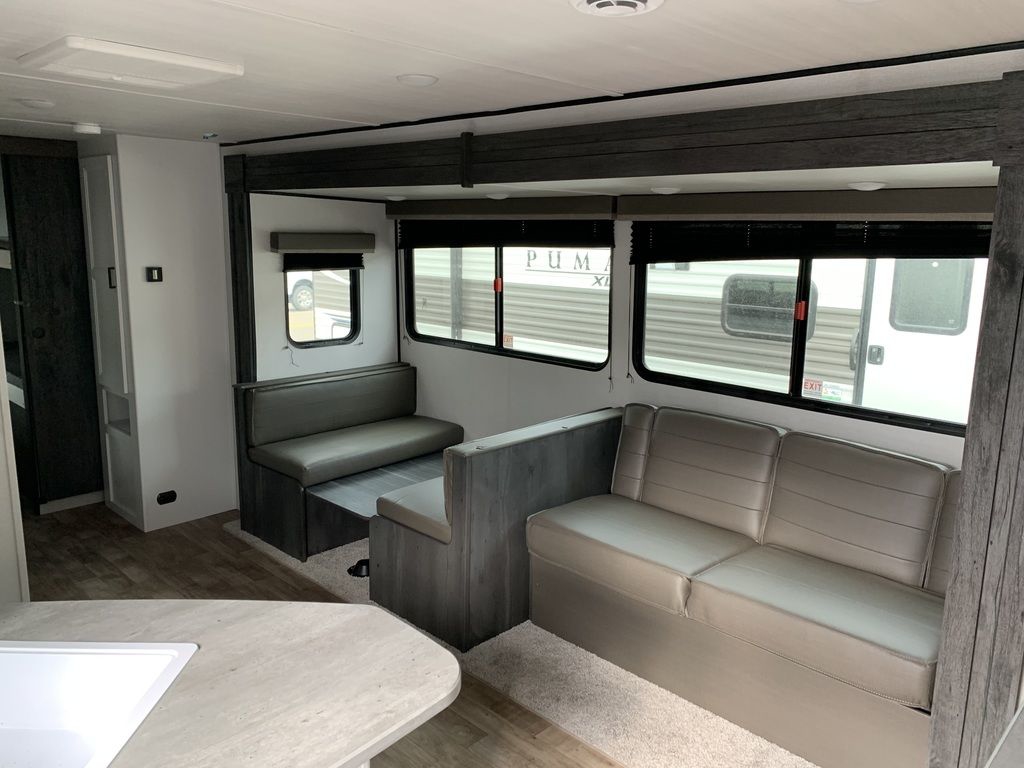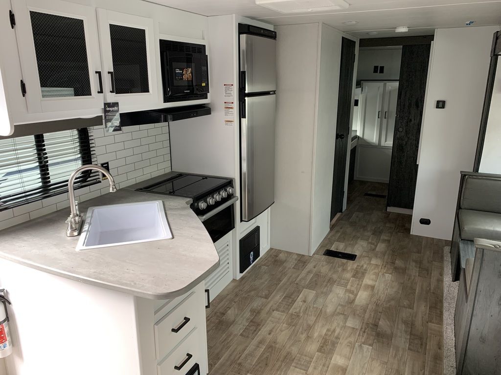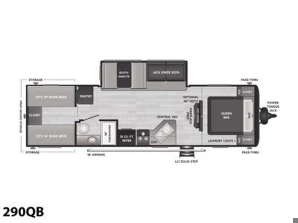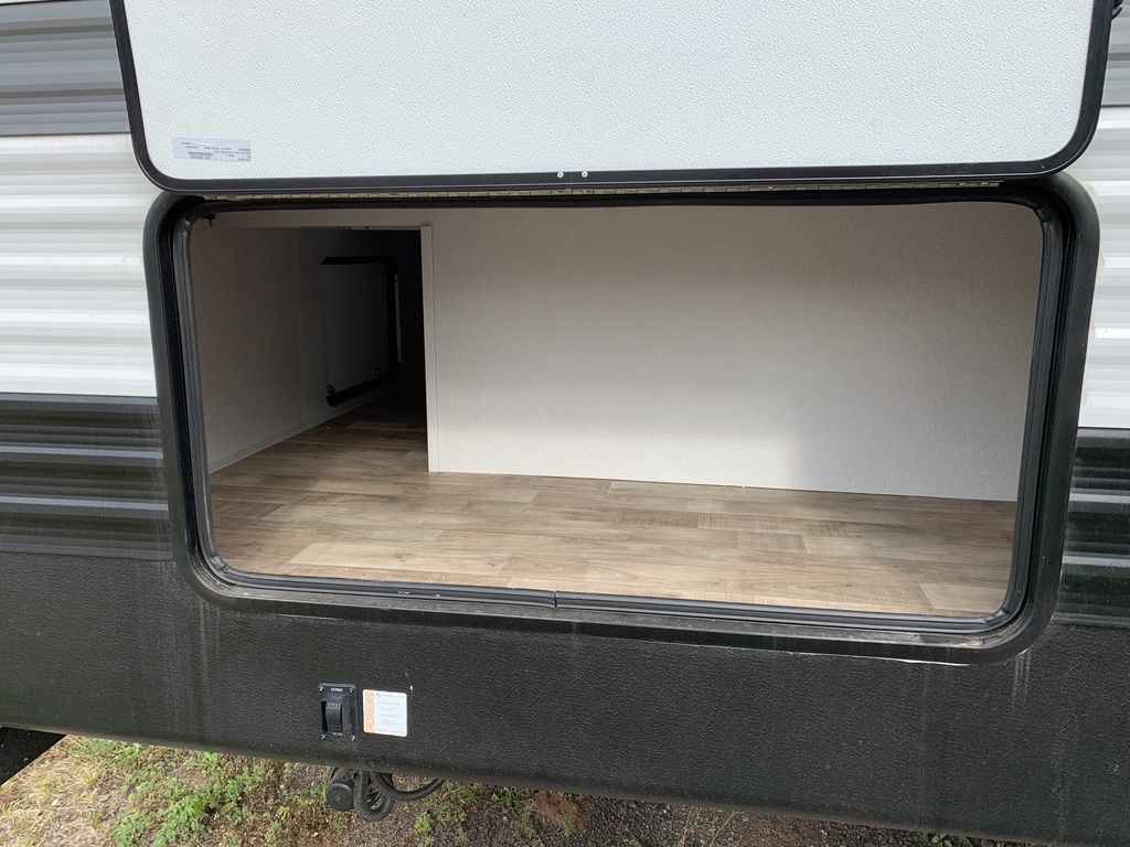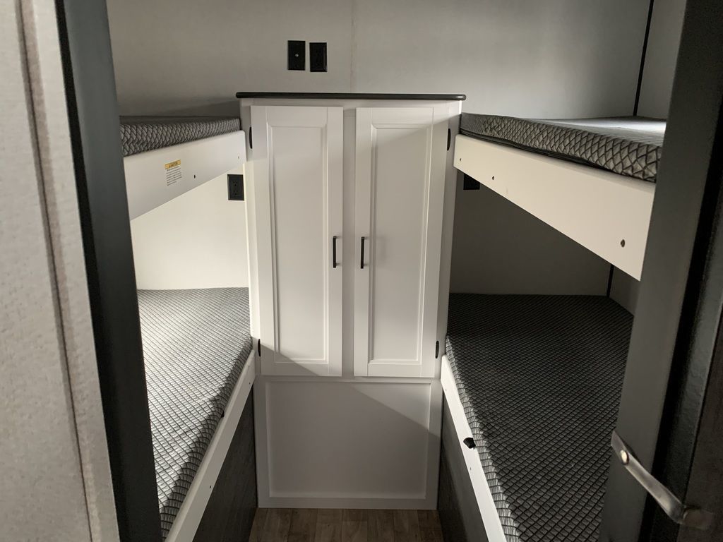 Solar powered for battery charging, huge outdoor storage compartment, and convenient 4-bed bunk room Shipping Weight 6,678 lb. Carrying Capacity 2,972 lb. Hitch 875 lb. Length 33 ft 3 in Height 11 ft 1 in Tire-Size ST225/75R15D Fresh Water 43 gal Gray Water 39 gal Waste Water 39 gal Sleeping Capacity 8 Number of Propane Tanks 2 LPG 40 lb. Refrigerator Size 10 cu ft