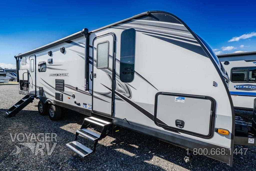The Pre-owned 2022 Jayco White Hawk 29BHS, measuring approximately 34′ 7in in length, a bunks floorplan, sleeping up to 10 people, king bed, equipped with 1 slide-outs, and a u-shaped dining area.