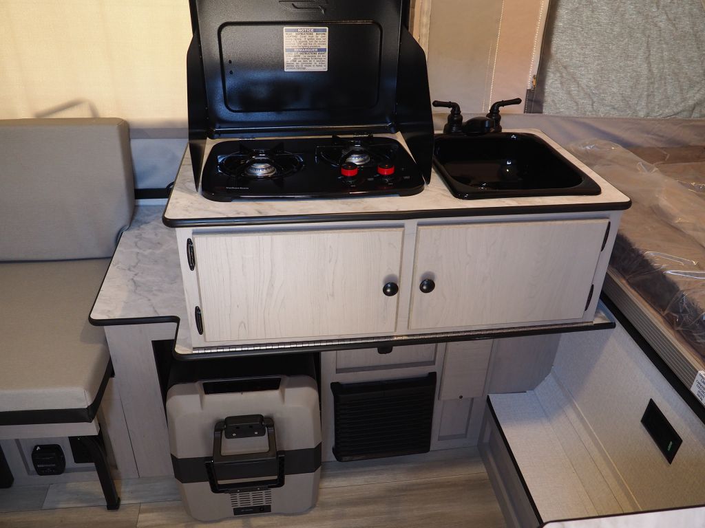 Compact Yet Functional Kitchen – Equipped with a two-burner cooktop, stainless steel sink, and a 3 cu. ft. refrigerator to make meal prep easy.