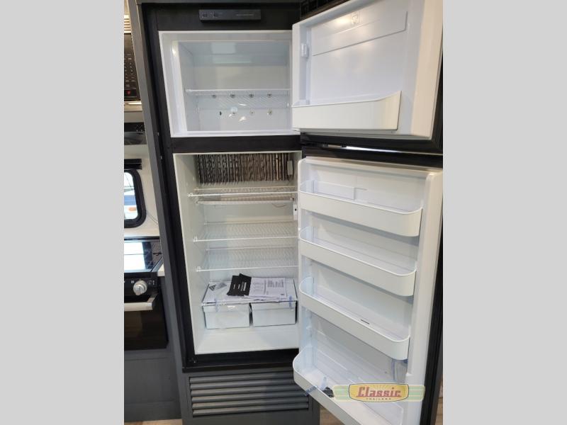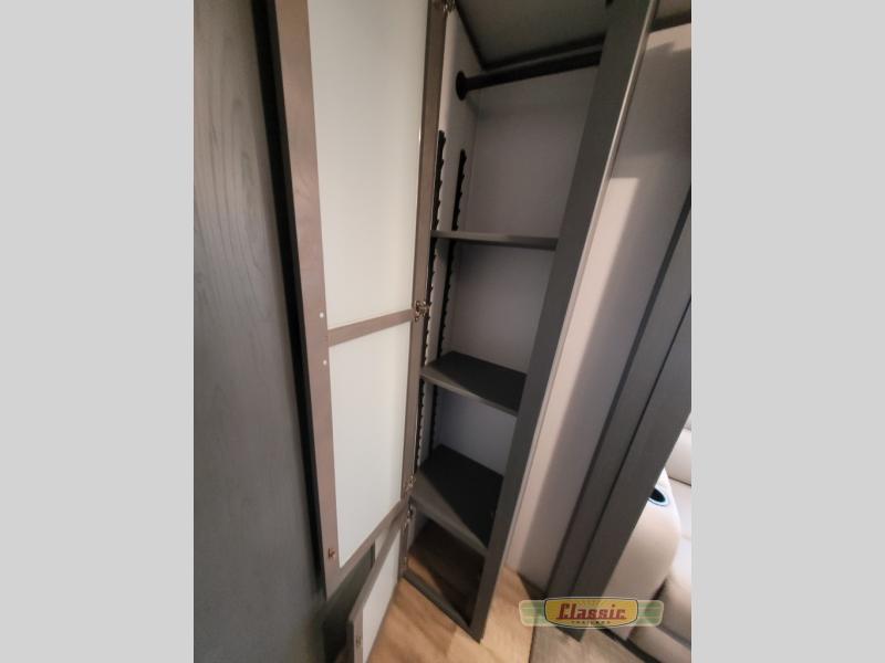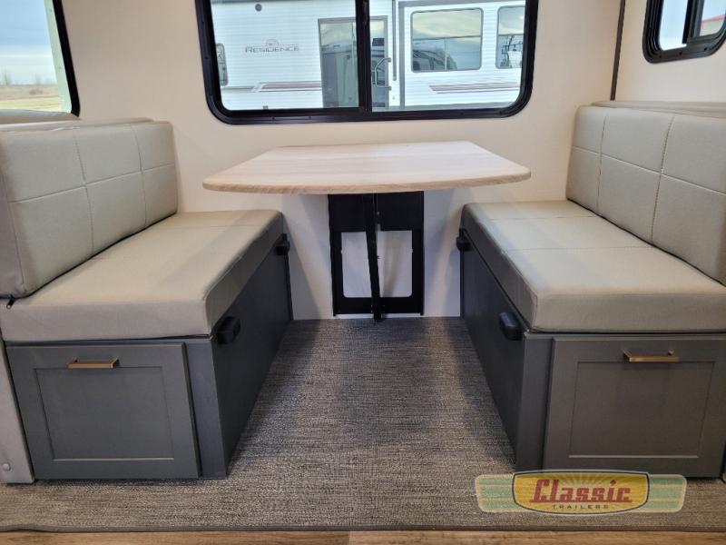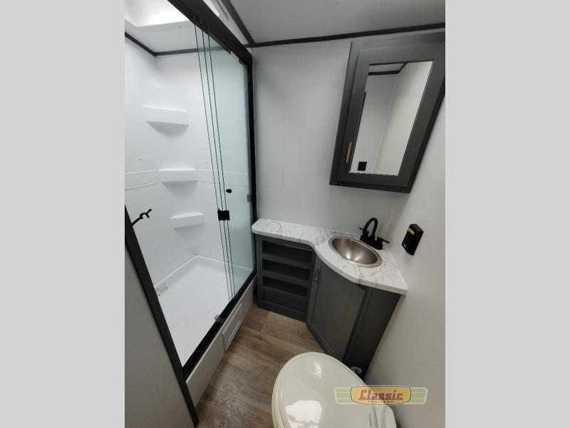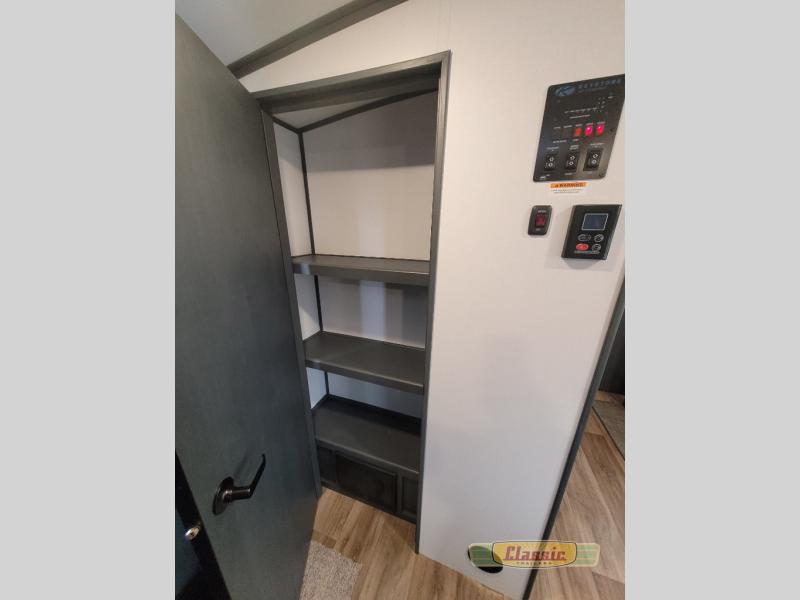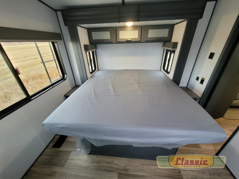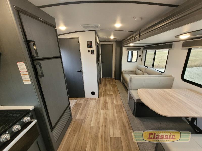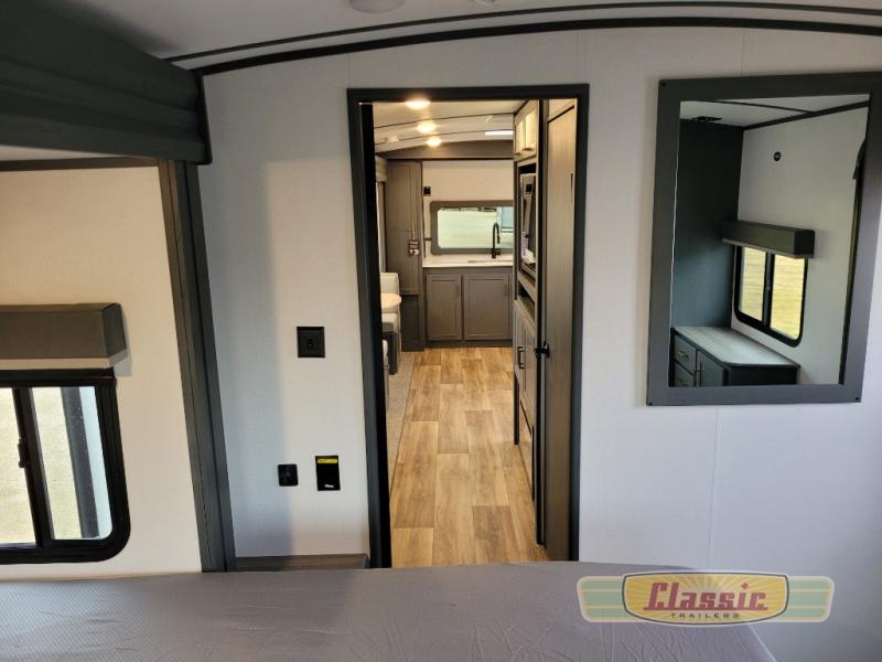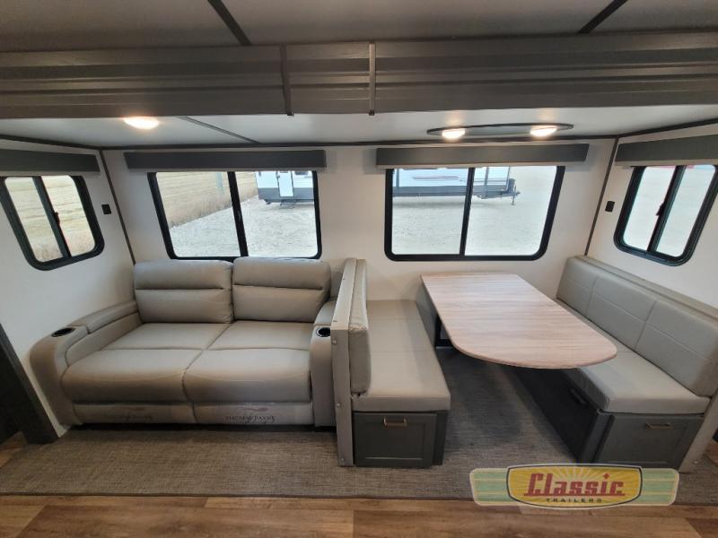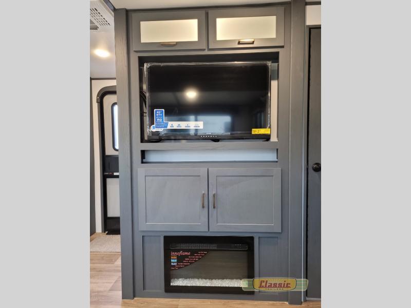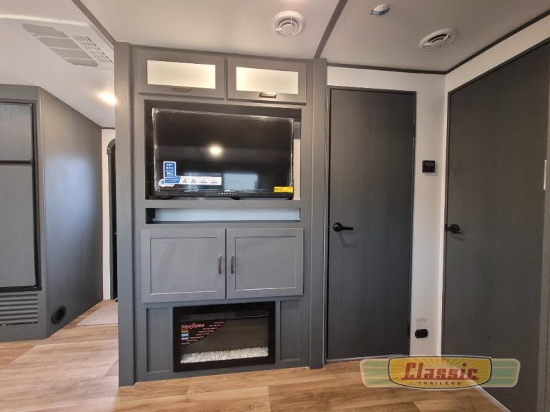 The chef will love cooking in the front kitchen of this travel trailer! It has plenty of countertop space to prepare their best meals, two pantries for the canned goods, a three burner cooktop, and a 8 cu. ft. refrigerator to keep the perishables fresh. Enjoy your meals at the dream dinette then play a card game or two and even transform it into an extra sleeping space. The 68″ tri-fold sofa also offers a comfortable place to sleep when you aren’t relaxing on it while watching a movie and enjoying the fireplace at the entertainment center. You could even switch out the sofa for optional luxury cinema recliners. Freshen up in the full bathroom with the full tub/shower surround with built-in shelves and then lay down on the comfortable king bed slide in the rear private bedroom which conveniently has one of the dual entry doors to the unit!
