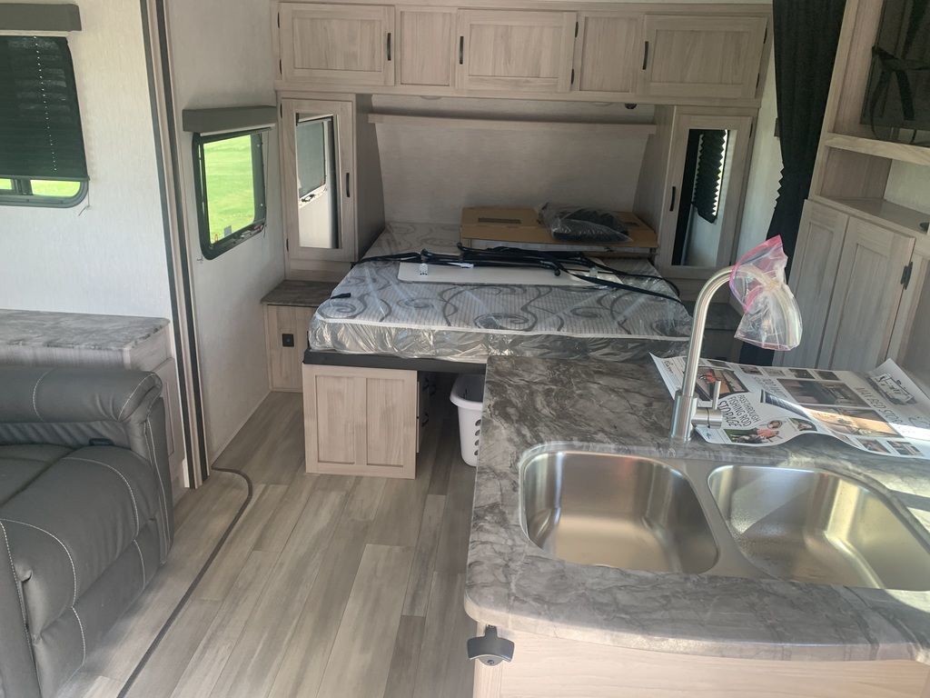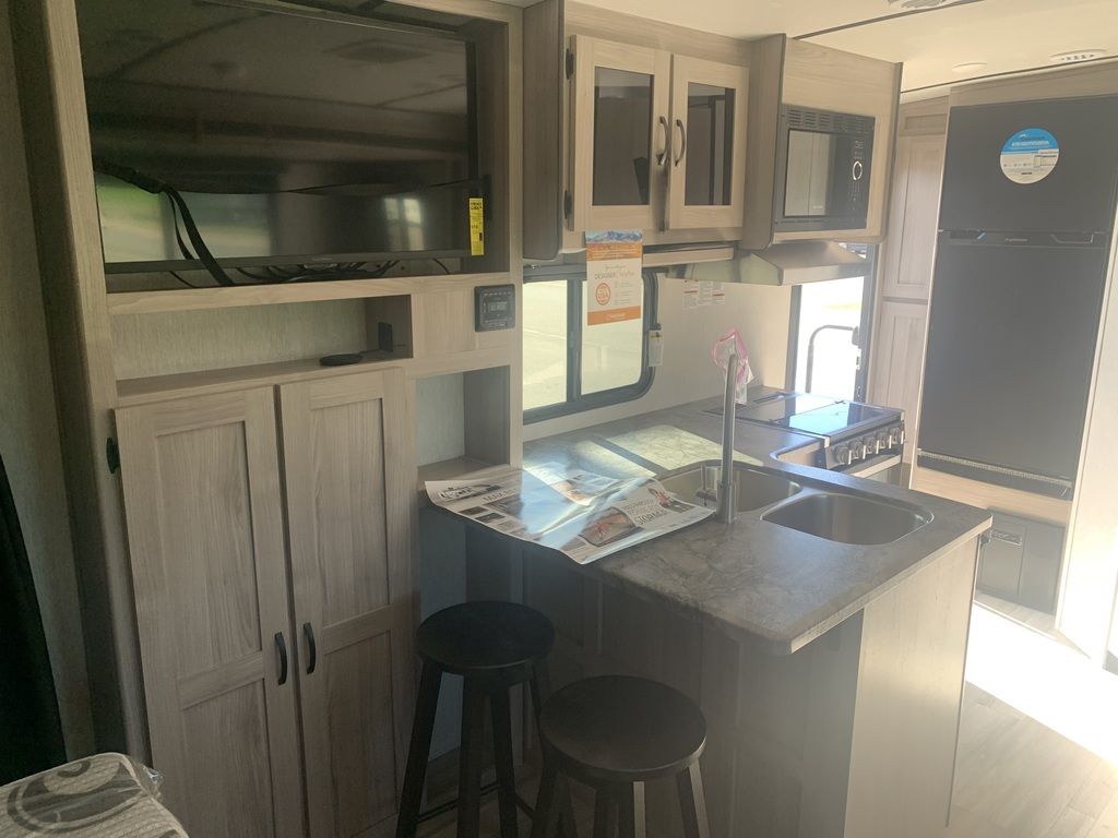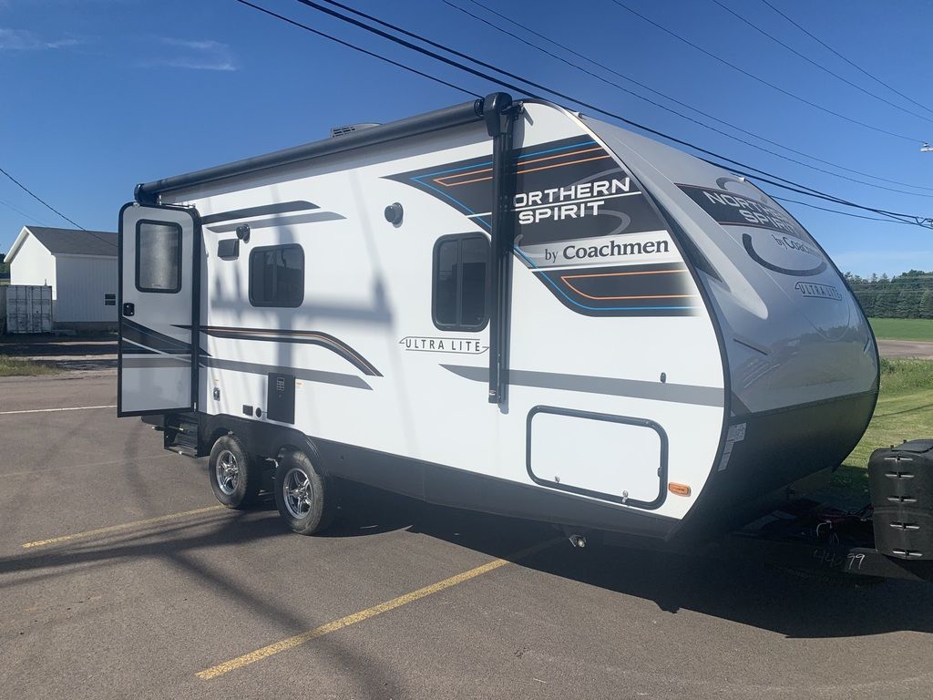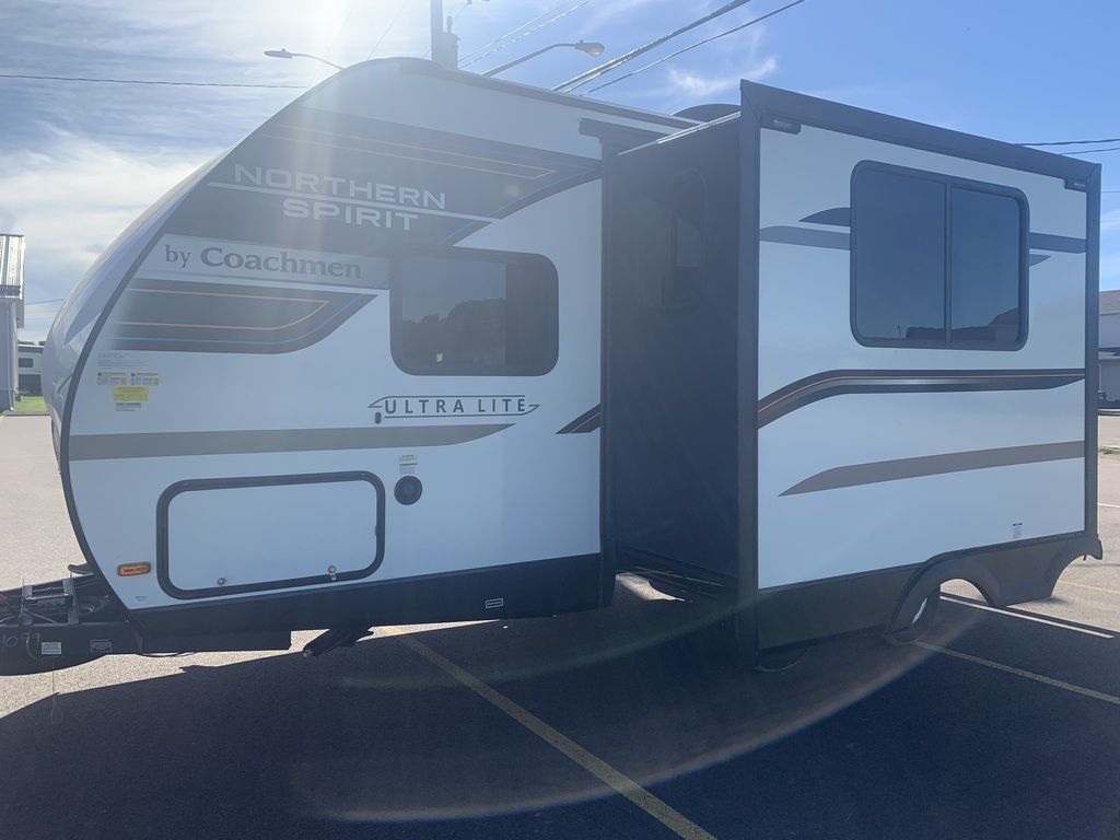 Cozy, convenient, and well laid out. Cool bar top eating area plus table. Check out the awesome under-bed storage! 2023 Coachmen Northern Spirit 1943RBCamping Simplified.Welcome to the all-new Northern Spirit Ultra Lite. The Northern Spirit was designed with one question in mind: How can we make your camping experience more enjoyable? We think the way to accomplish this is to simplify the camping experience. We call this back to the basics approach Camping Simplified. What is Camping Simplified? It’s providing all of the little things, in the right places, to give you the best camping experience possible. Whether it’s a laundry hamper and tooth brush holder in the bathroom, a place to hide your valuables, or a convenient storage area for your sink covers and fishing poles Camping Simplified is there to make your life easier.Campers love to take their pets. We think the Northern Spirit is the most pet friendly travel trailer on the market. You will love these pet friendly Camping Simplified features… Pet Center, Dog Wash and even an Exterior Dog Leash Clip! Camping is about relaxation and having fun. Let Northern Spirit be your guide to more of both!The perfect couple’s floorplan features a rear bathroom, L-Shaped kitchen counter top, an entertainment center with a sofa or theater seating, and our famous Max Bed Storage!Features may include:InteriorSeamless Thermo Foil Wrapped CountertopMicrowaveOven w/ 3 Burner Cooktop and Folding Glass Cover6 Cu. Ft. Gas/Electric RefrigeratorAM/FM Bluetooth StereoDeluxe High Rise FaucetDouble Bowl Stainless Steel SinkUnder Dinette Storage DoorsLighted USBDucted Furnace6 Gallon Gas/Electric Water Heater w/ 17.3 Gallon Recovery55 Amp Power ConverterLED TVBunk Privacy Curtains13.5 BTU Air Conditioner2 Interior SpeakersSink CoversDesigner Shower CurtainMedicine CabinetTowel HooksTub SurroundPower VentSkylightSeamless Thermo Foil Wrapped CountertopBedside Night StandsShirt ClosetsLighted USBsOutletsAbove Bed ShelfDesigner ComforterReading Lights60” X 80” Queen BedLaundry CenterExteriorMagnetic Door CatchesDrip Rails w/ DownspoutsHeated and Enclosed UnderbellyCable / Satellite PrepSolid Entry StepsExtended Grab HandleBack-up Camera PrepAngled Stabilizer Scissor JacksBlack Tank FlushExterior SpeakersWide Stance AxlesPower AwningSolar PrepDog WashFront Rock GuardPower Tongue JackSpare TireDetachable Power Chord20 lb. LP TanksWater Heater By PassAluminum Rims