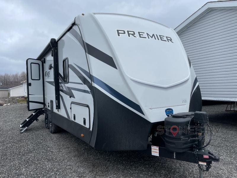 The 2023 Premier 23RBPR by Keystone RV is an ultra-lite travel trailer with a spacious layout and several features. It includes a front private bedroom, a U-shaped dinette, an outside kitchen, and a walk-in shower.