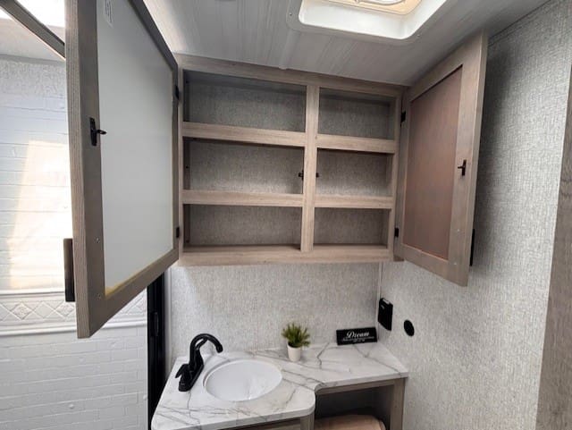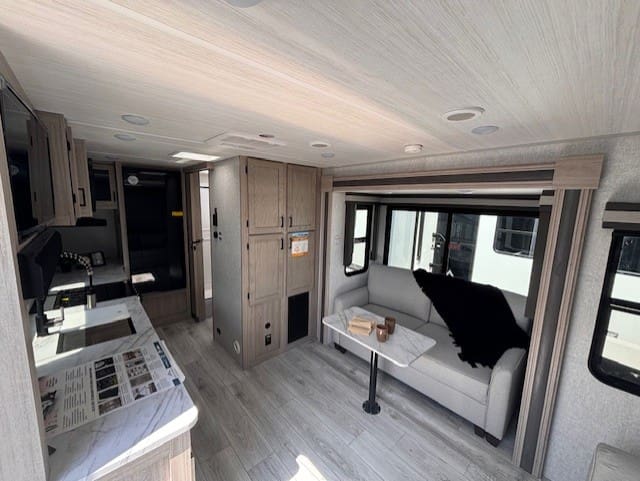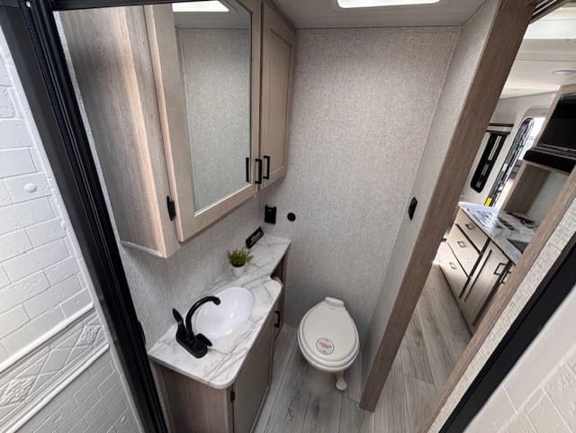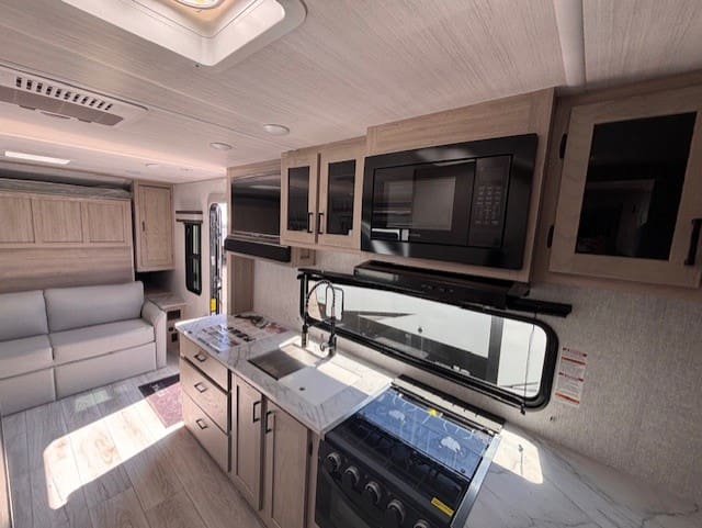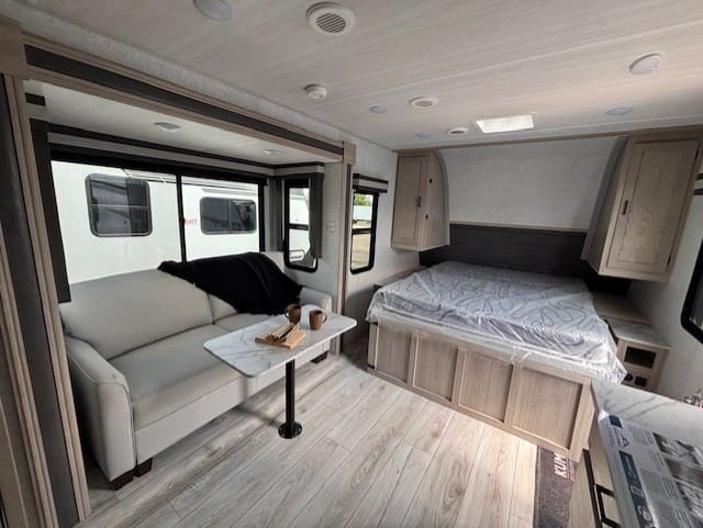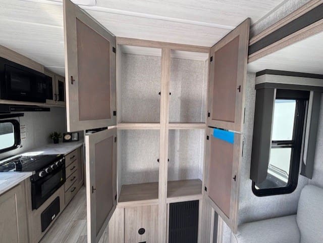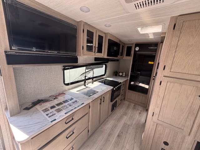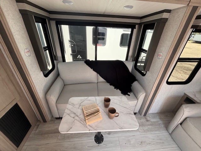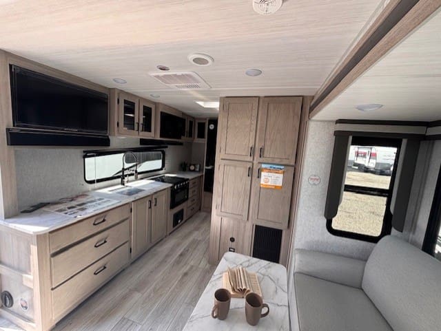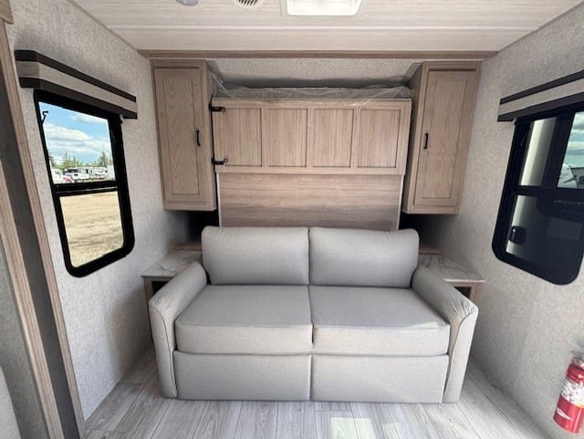 The 2024 Alta 1900MMK is meant for the solo traveller or couple that find comfort in cooking. You will be in awe when you first lay eyes on the immense amount of counter space that extends throughout the length of the trailer with immense amount of cupboard space. The kitchen also includes a full sized 12V fridge, a large sink, and a 3-burner stove. Some other charming features include theatre seating, a murphy bed, and a removable table that easily stores away when not in use.