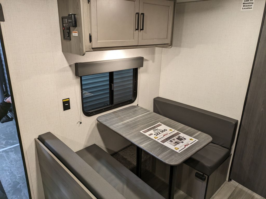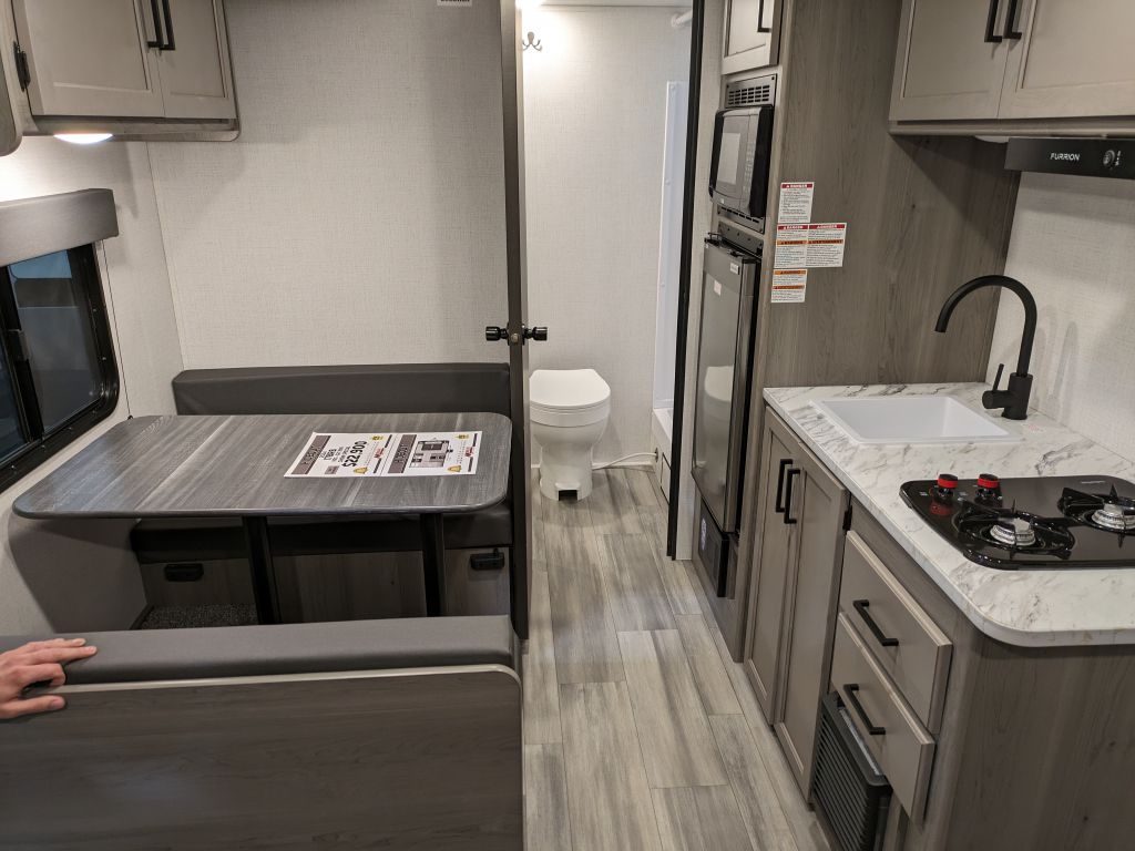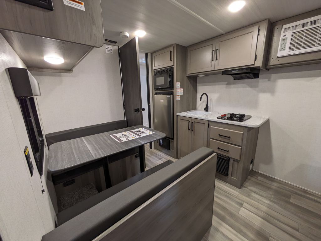 The kitchen in this Keystone Hideout trailer is designed to make cooking in the wild easy and enjoyable, featuring a two-burner stove and a prep-ready microwave. With the booth dinette, you have a comfortable space to enjoy meals, which also converts to an extra sleeping area, maximizing functionality.