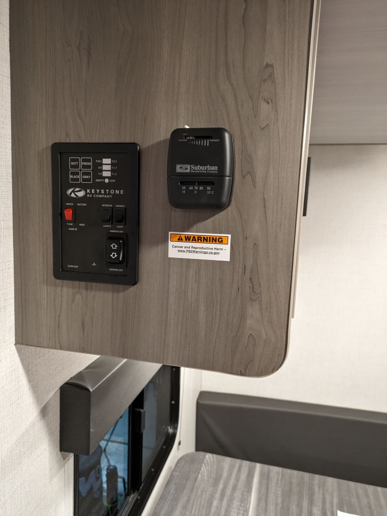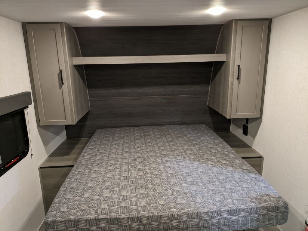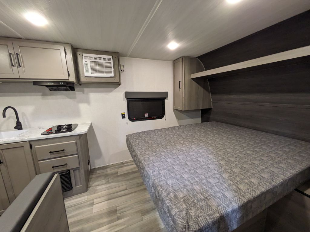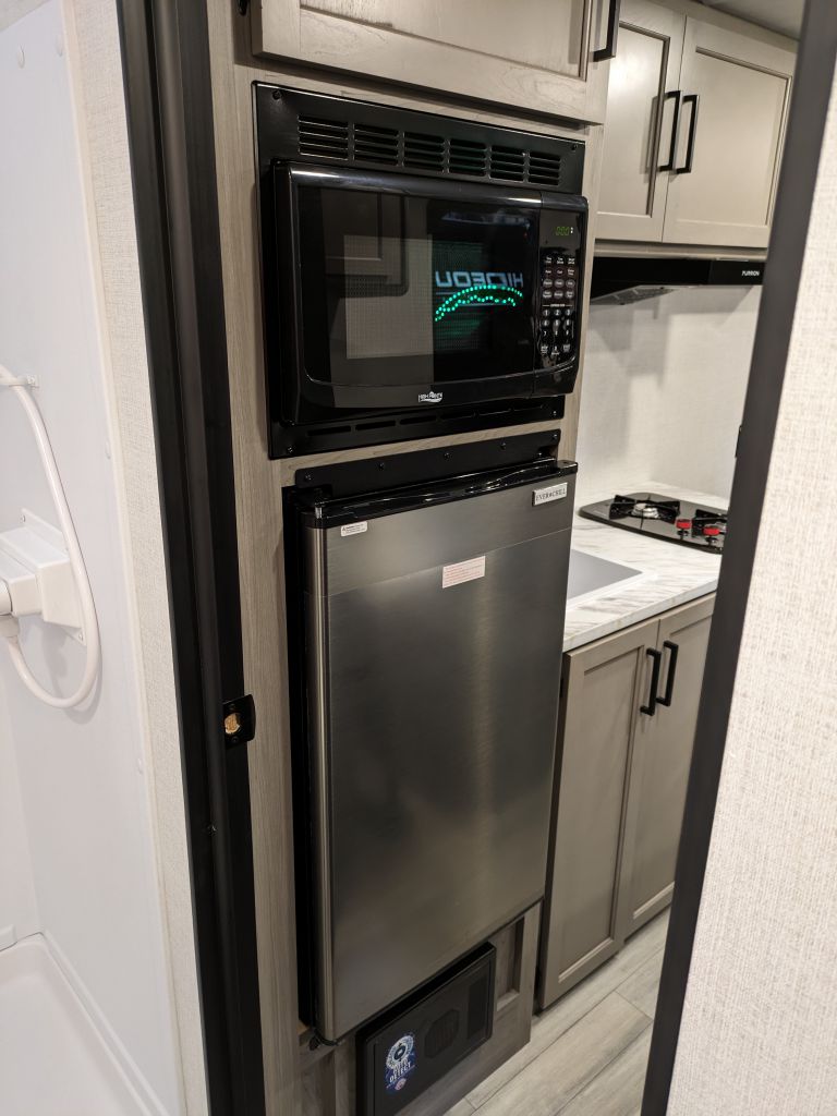 The 12V Furrion refrigerator keeps all your food and drinks cool and fresh, while the power awning with LED lighting extends your outdoor living space, letting you enjoy shaded comfort at any time of day. The solid entry step provides stability for easy access.