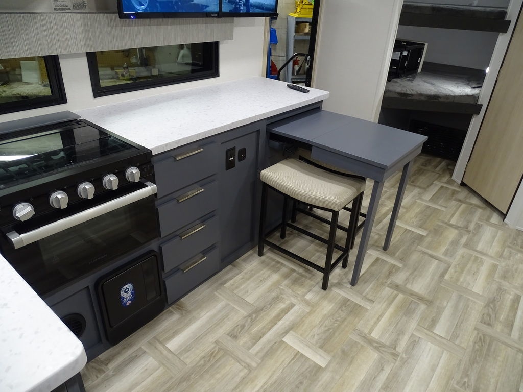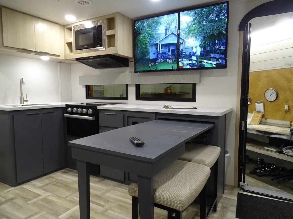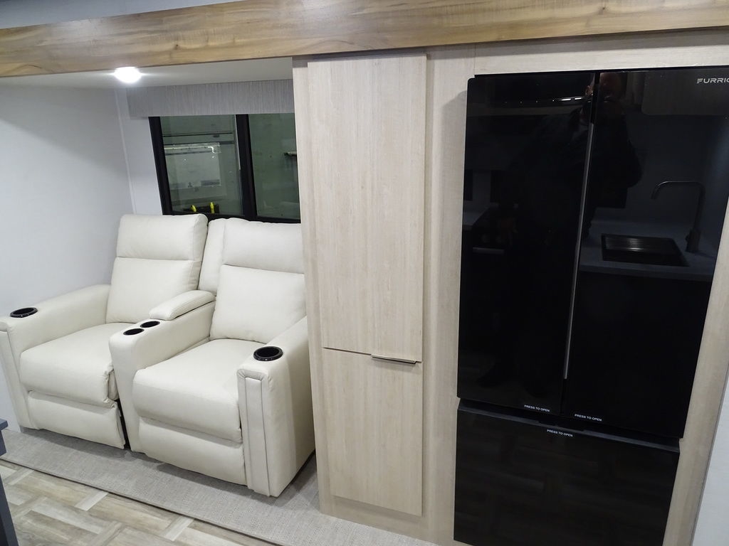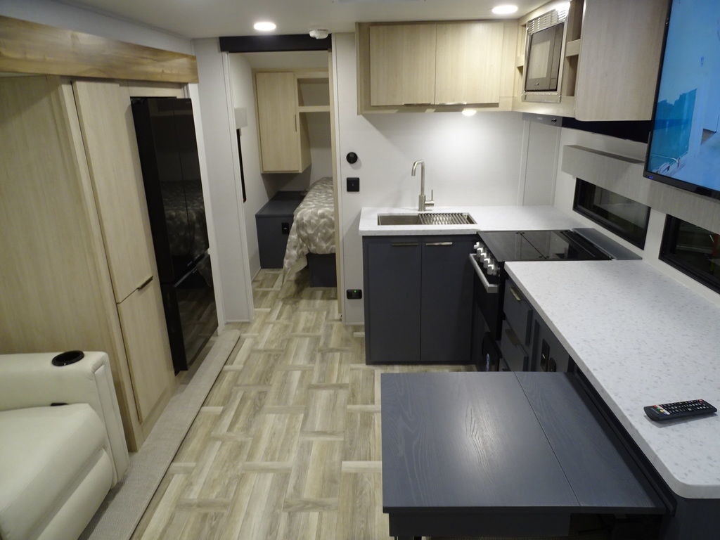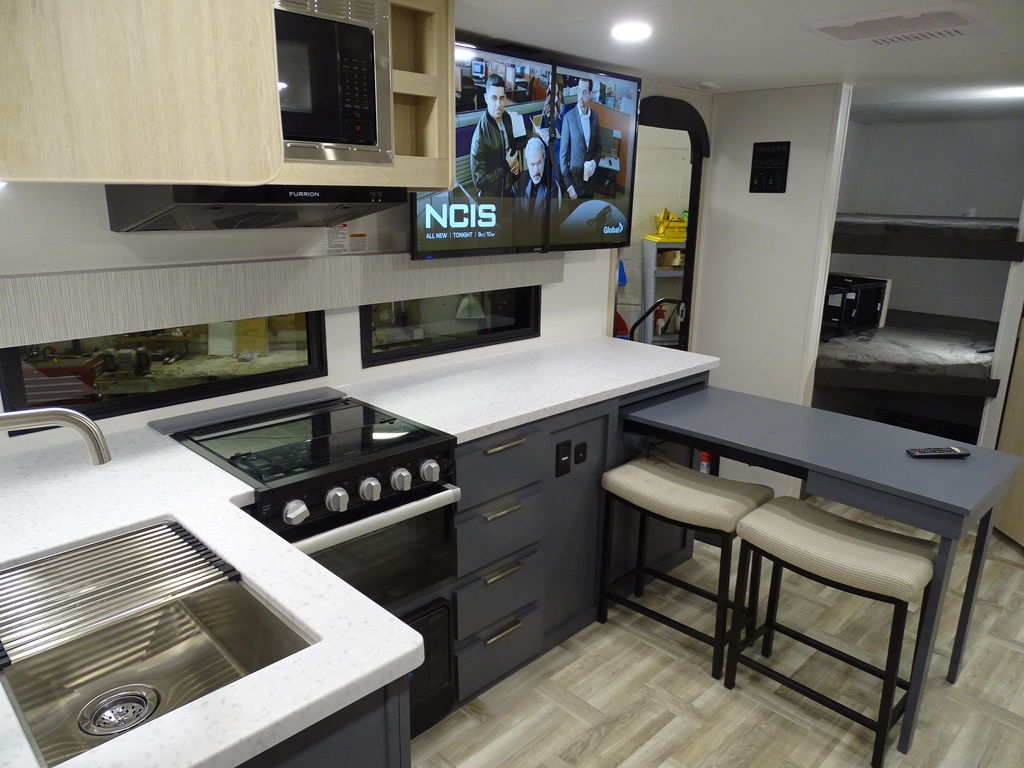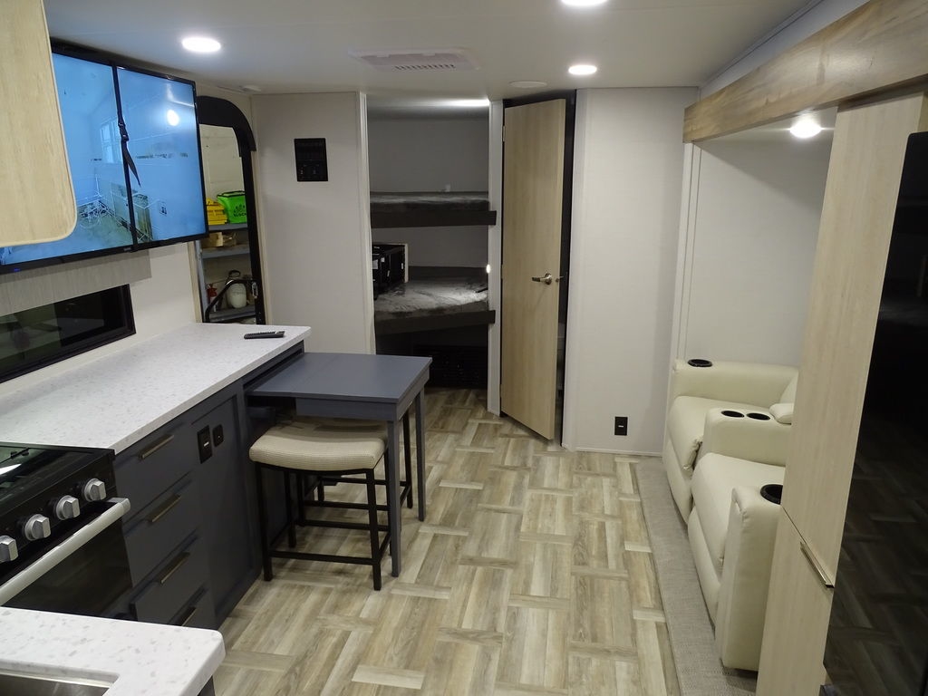 Features Include 1 Slide Ducted A/C Power Awning On Demand Water Heater 10 Cu. Ft. Refrigerator Jack & Jack Bunks Power Front Tongue jacks Front Power Stabilizer jacks Rear Power Stabilizer jacks Diamond Plate Rock Guard Aluminum Wheels Microwave Stereo LED TV LED Lighting Pleated Shades theatre Seating Outside Fridge Solar Panel 200 Watts Weight 5894 Lbs.