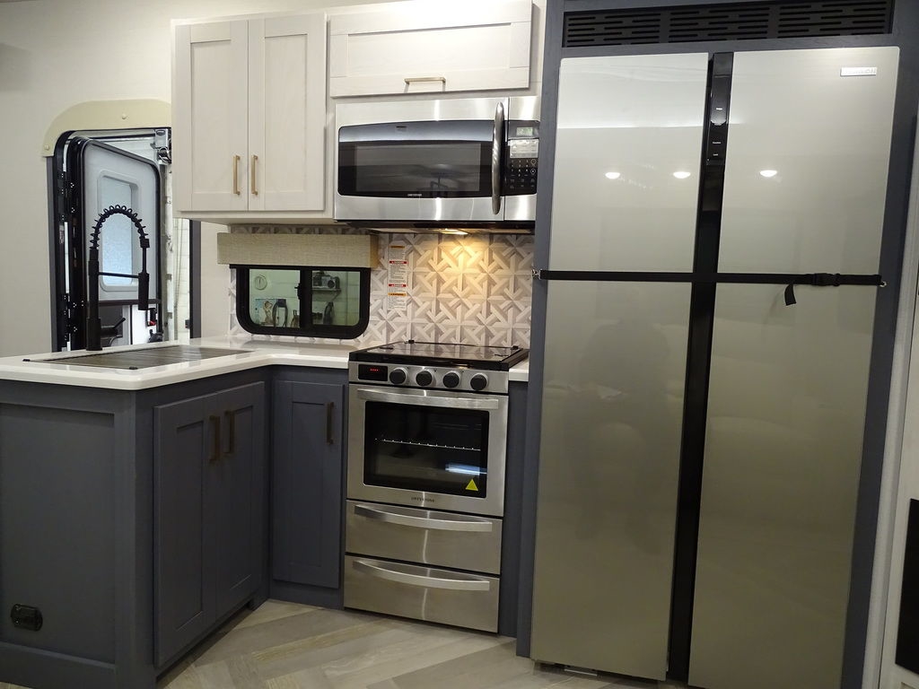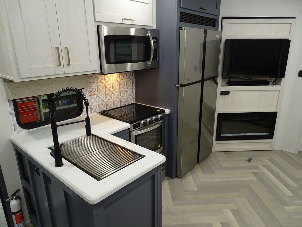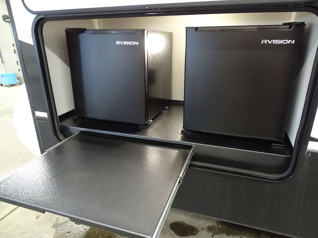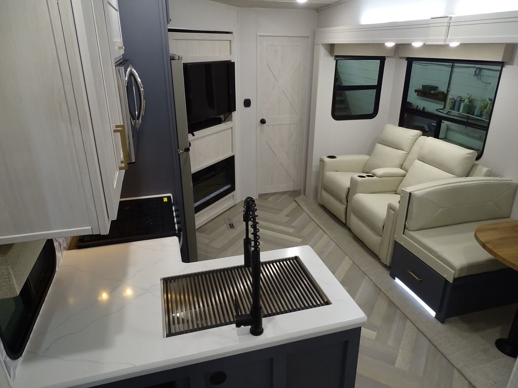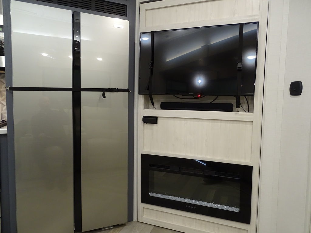 Features Include 2 Slides 2 A/C's Power Awning On Demand Water Heater 16 Cu. Ft. Refrigerator Arctic Package Jack & Jack Bunks Power Leveling Jacks 16" Aluminum Wheels Microwave Home Theatre LED Tv LED Lighting Roller Shades Theatre Seating Fireplace Outside Kitchen Outside Speakers 200 watt Solar panel Weight 9491 Lbs.