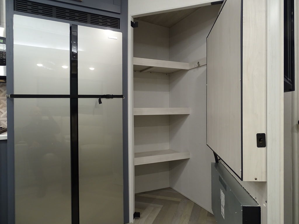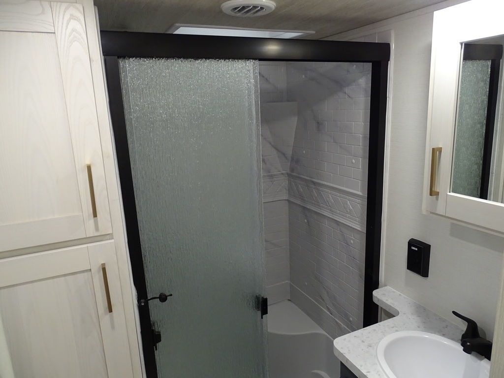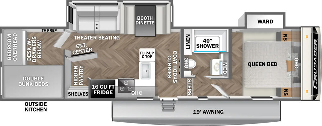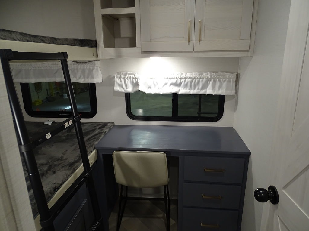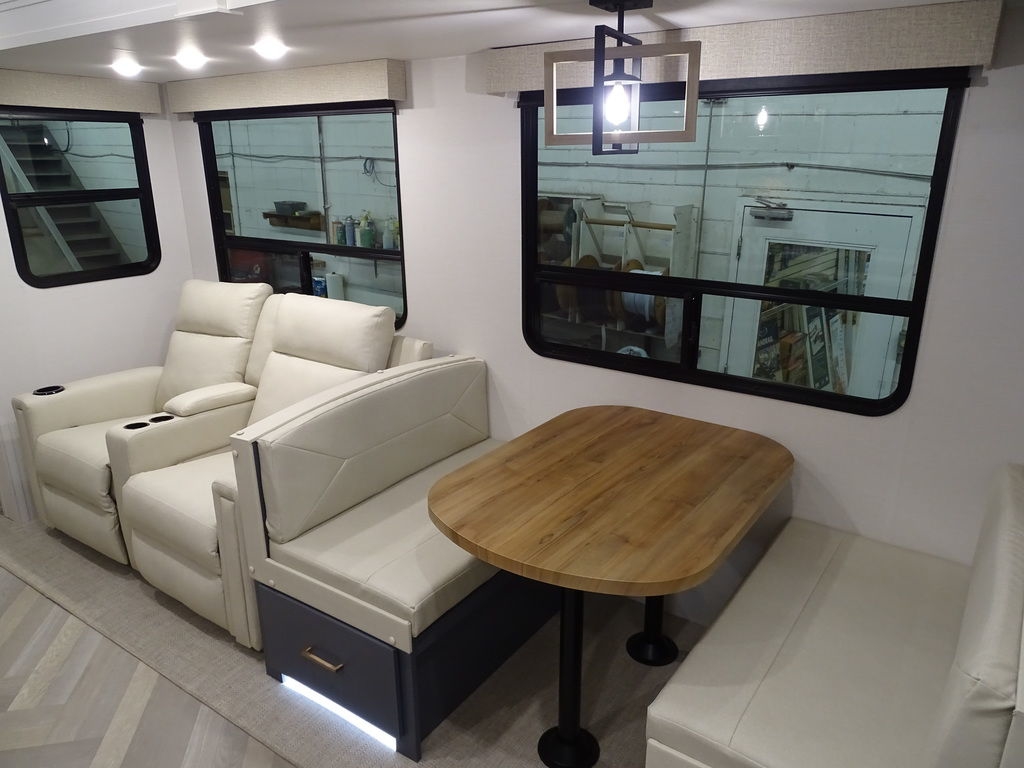 Features Include 2 Slides 2 A/C's Power Awning On Demand Water Heater 16 Cu. Ft. Refrigerator Arctic Package Jack & Jack Bunks Power Leveling Jacks 16" Aluminum Wheels Microwave Home Theatre LED Tv LED Lighting Roller Shades Theatre Seating Fireplace Outside Kitchen Outside Speakers 200 watt Solar panel Weight 9491 Lbs.