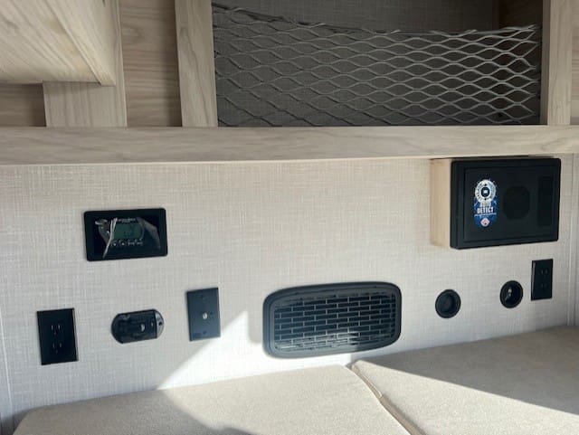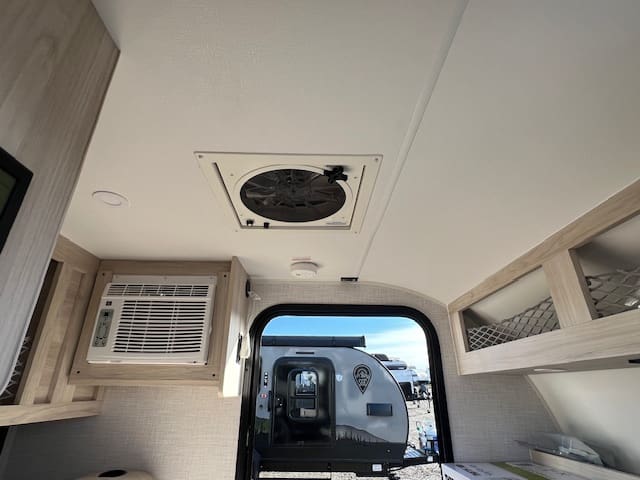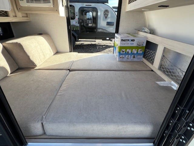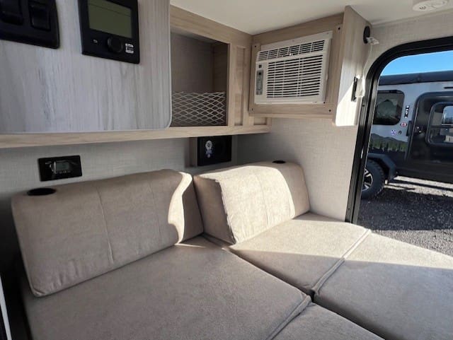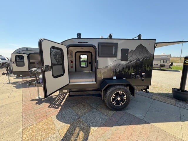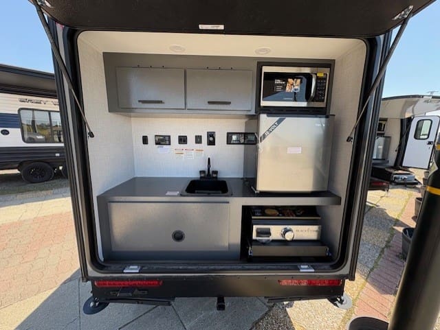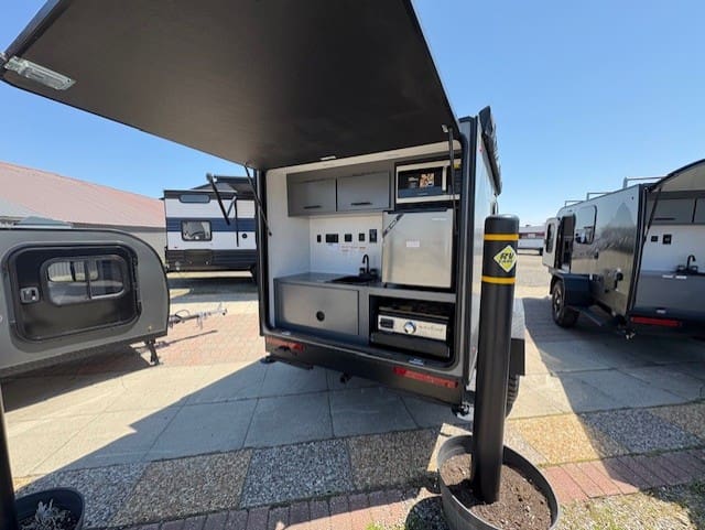This unit provides a comfortable foldable bed with cup holders, plenty of storage with a TV hookup, USB charging ports and GFI so that you can still enjoy your electronics. There are also dual entrances for convenience, as well as a portable AC and porta potti with a hold down kit to make your trip extra comfortable. On the outside, is an impressive full kitchen accompanied with a blackstone griddle, a mini fridge, a sink, microwave, and plenty of storage so that you can still enjoy delicious meals on the road.
