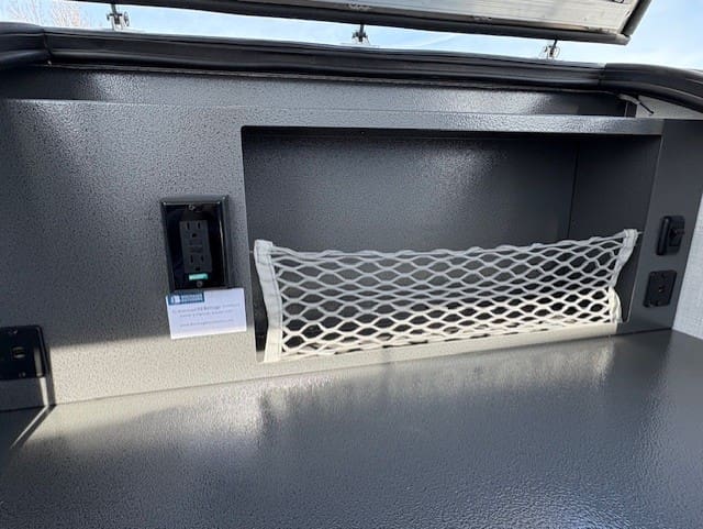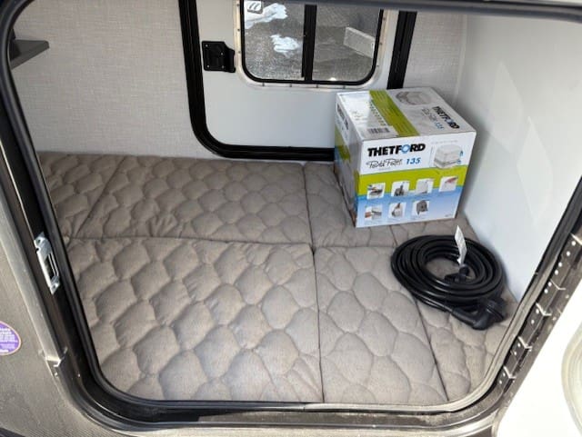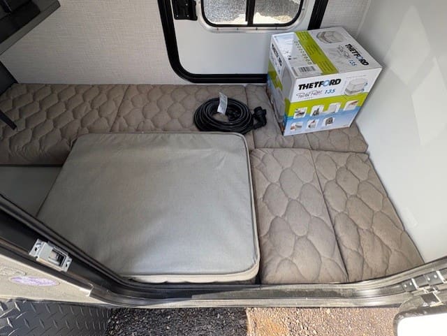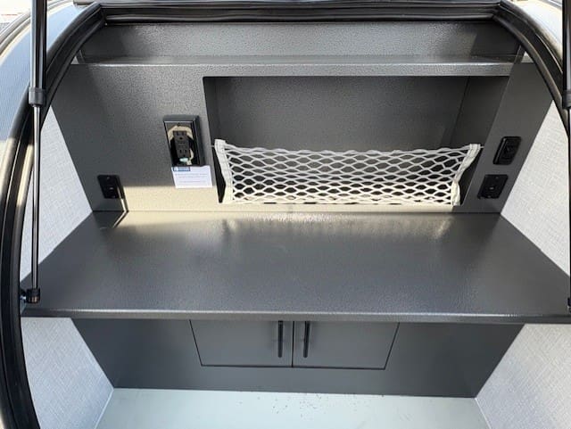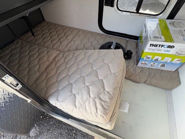 Inside, the trailer offers essential comforts including a 12V roof vent for airflow, a 4-inch deluxe mattress for restful sleep, and convenient 12V USB outlets for device charging. Basic necessities are covered with a portable toilet and power cord for electrical hookups.
