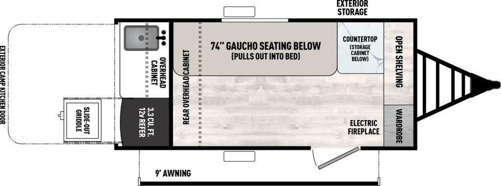 The ROK Kitchen Package enhances your outdoor cooking experience with a pull-out cooktop, a 3.3 cu. ft. 12V refrigerator, and a convenient hot-and-cold faucet. A bag awning provides shade for your campsite, and the LP quick connect simplifies hooking up propane-powered appliances. For added convenience, the outside shower (hot/cold) makes cleaning up after outdoor activities effortless.