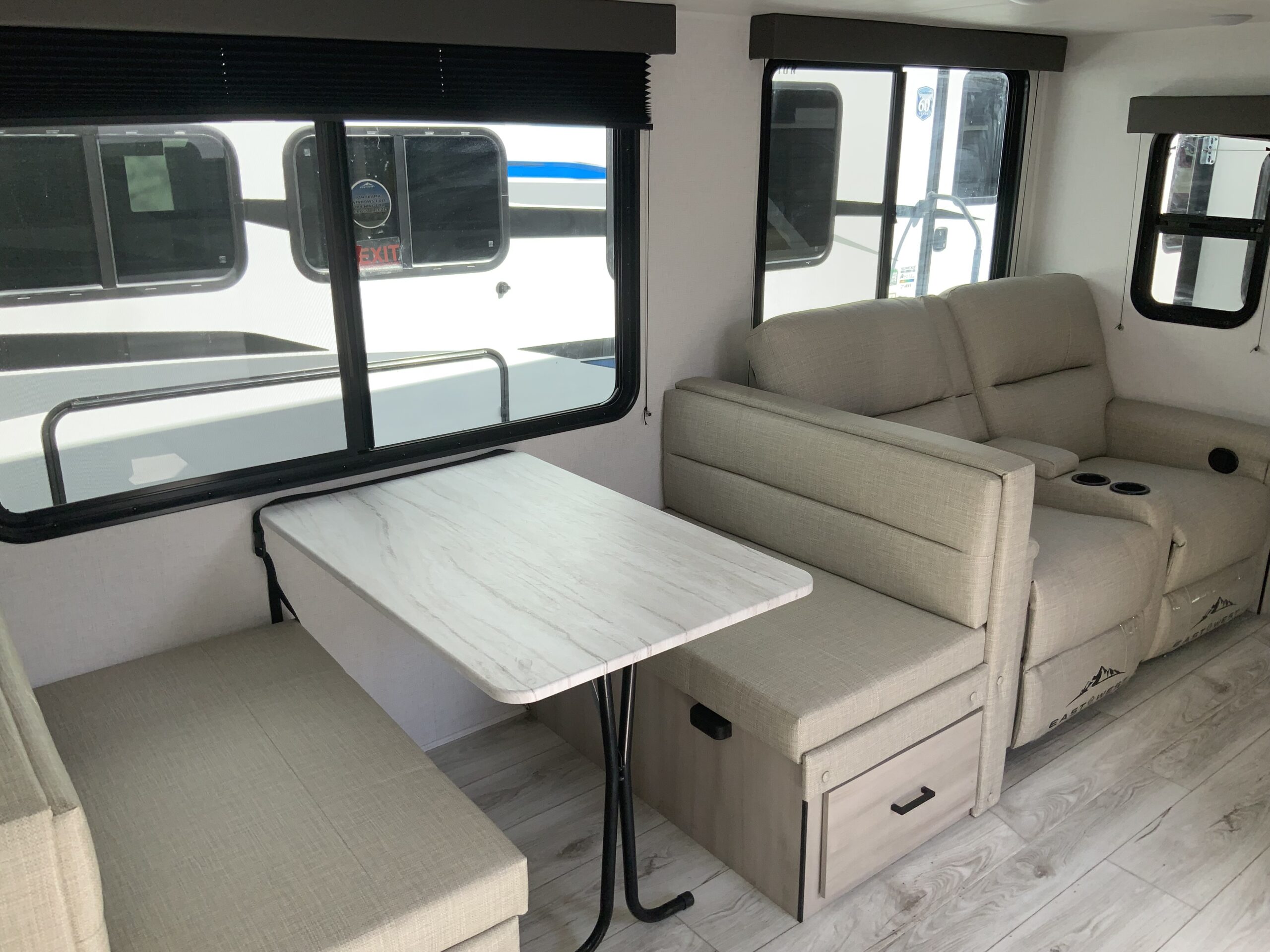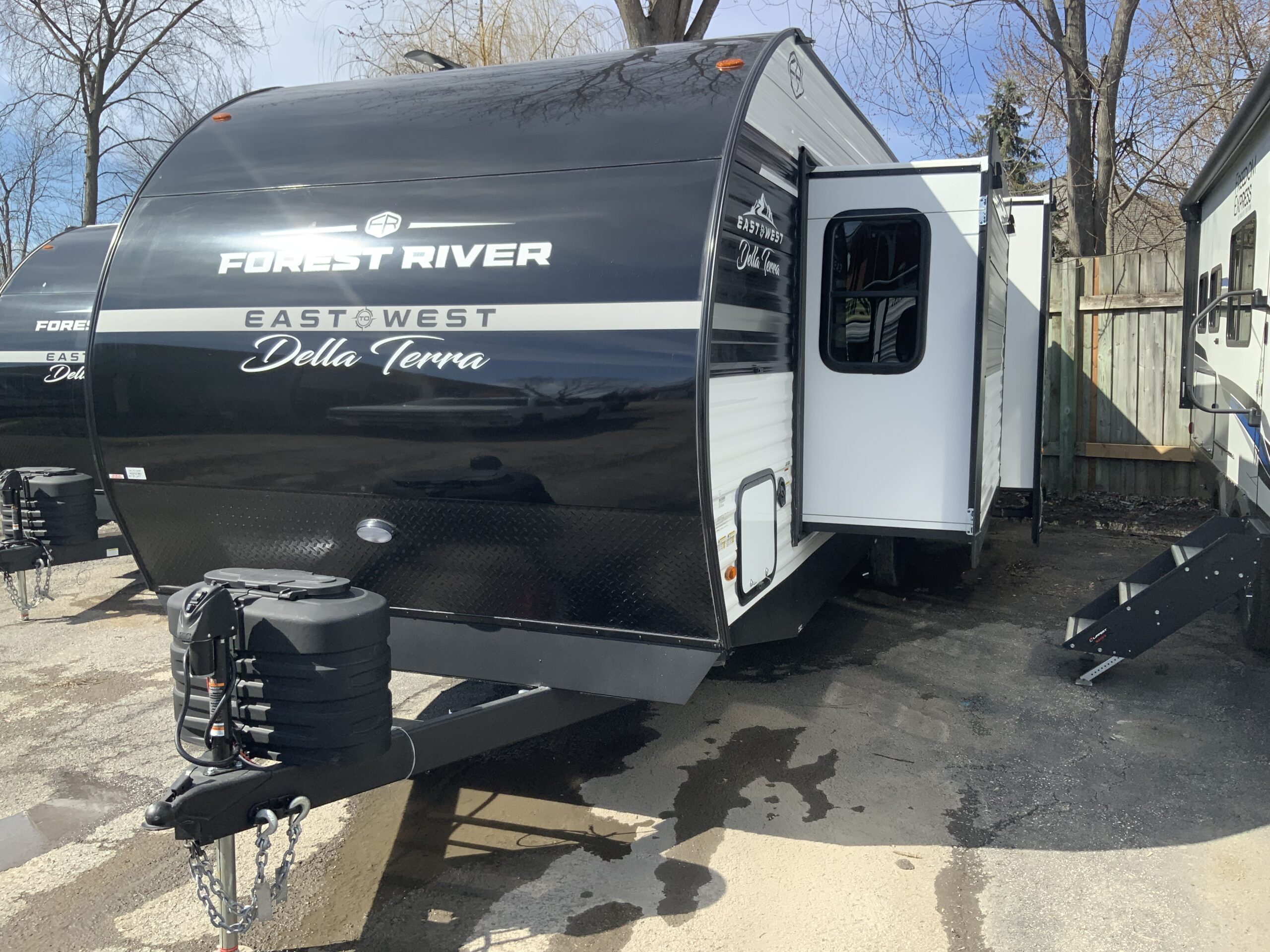 Each Della Terra travel trailer by EAST TO WEST is constructed with an enclosed and heated underbelly and enclosed holding tanks so you can camp all year long. There is also a power tongue jack with an LED light for easy set up and a power awning with LED lights you can rest under after you’ve unpacked. The Explore Comfort Package comes seamless pressed countertops, kitchen backsplash, window valance package with black night shades, and many more comforts. You will also appreciate the Adventure Outdoor Package with backup camera prep and solar prep, a tankless water heater, an RV grill quick disconnect, and a universal docking station with battery disconnect.
