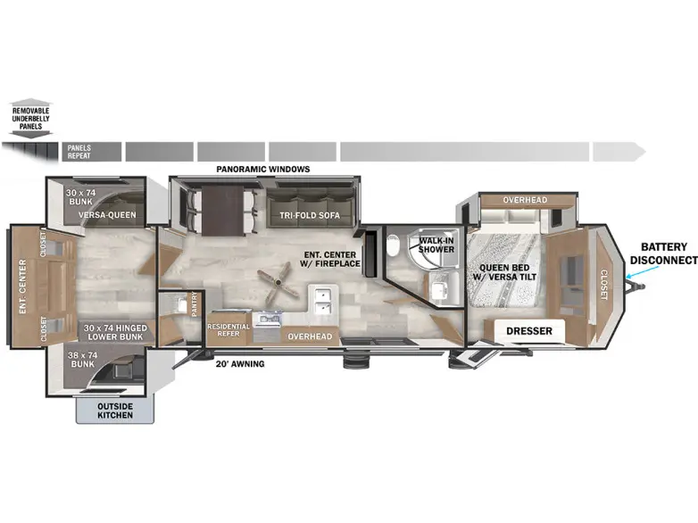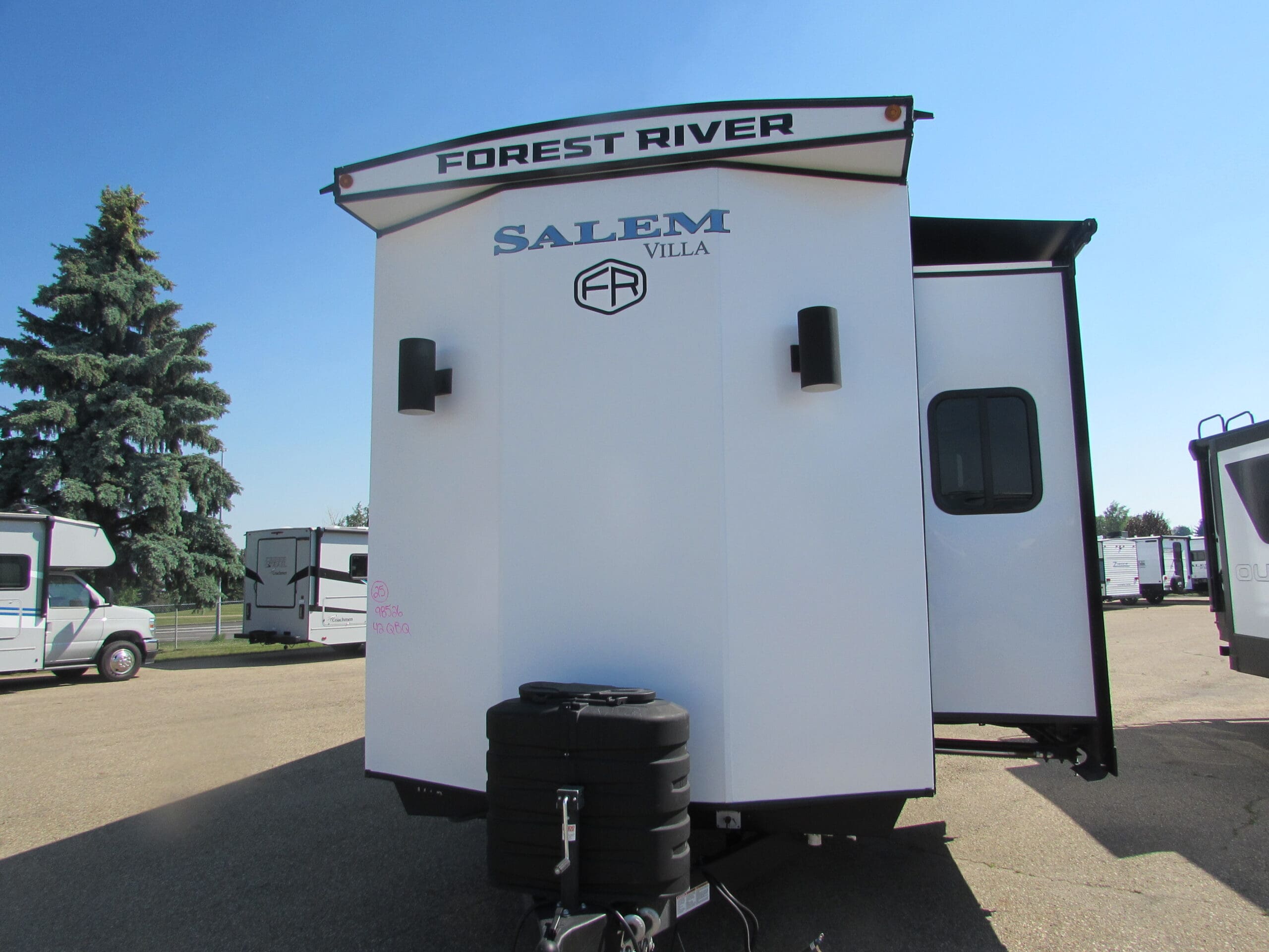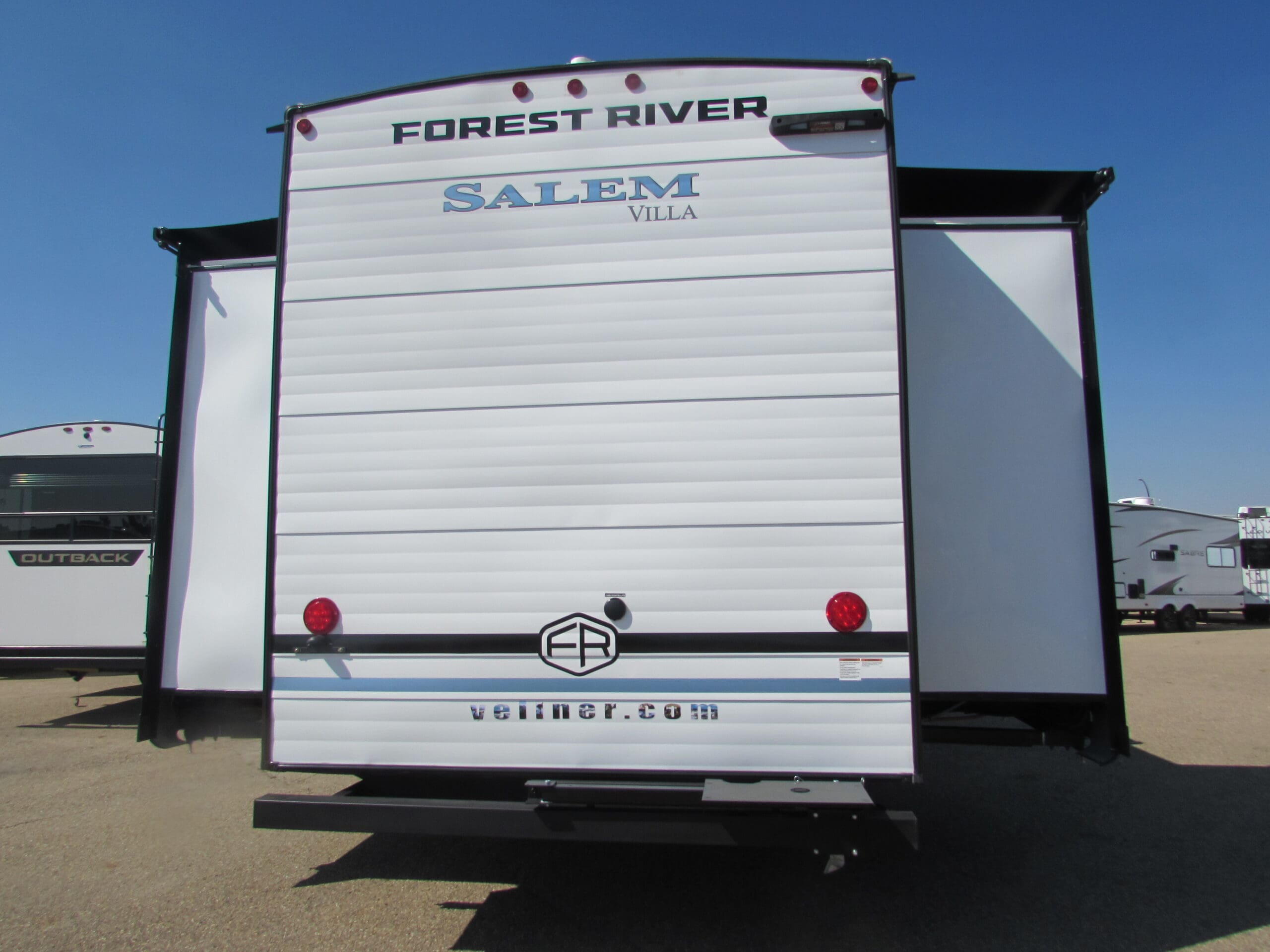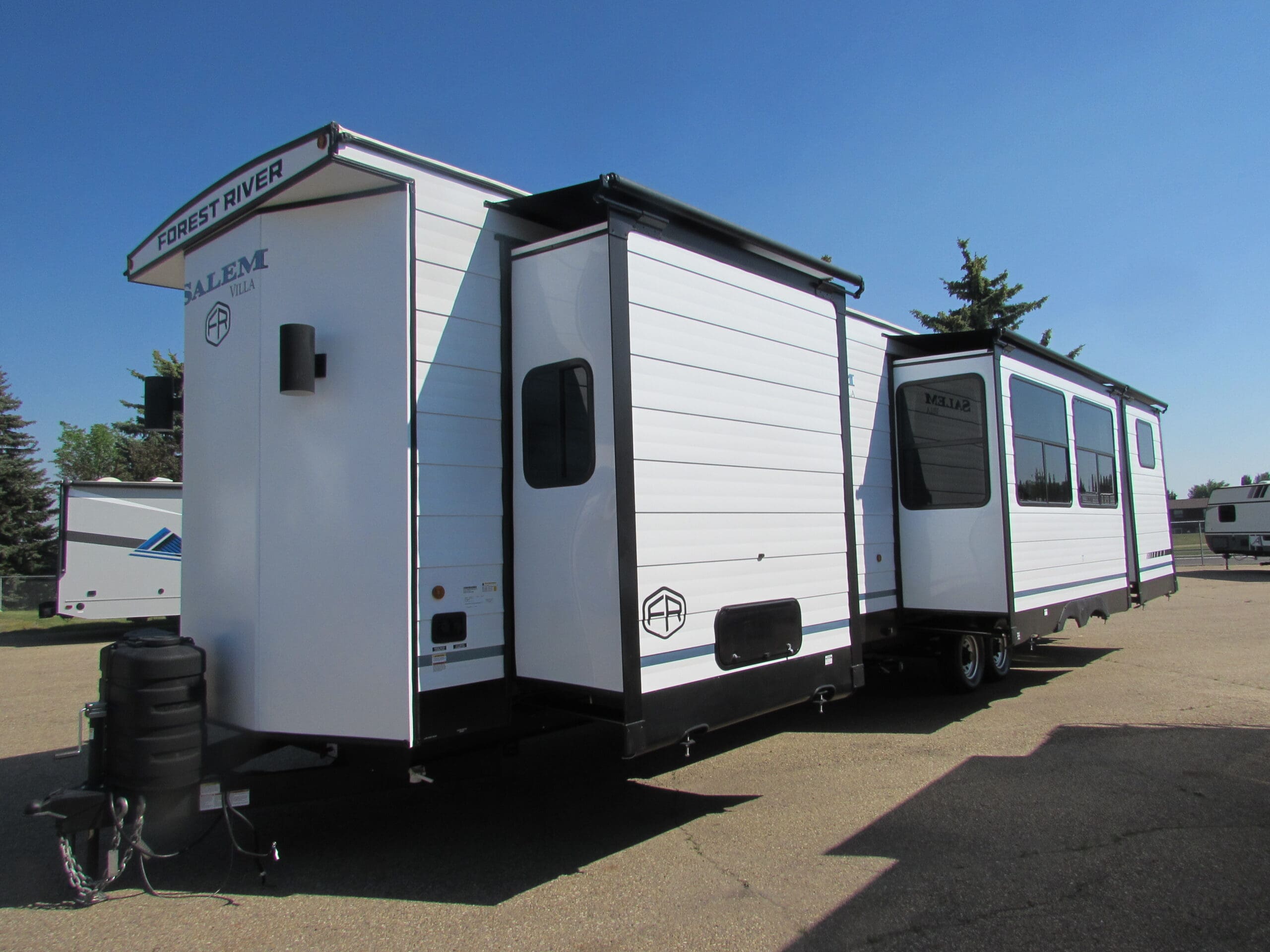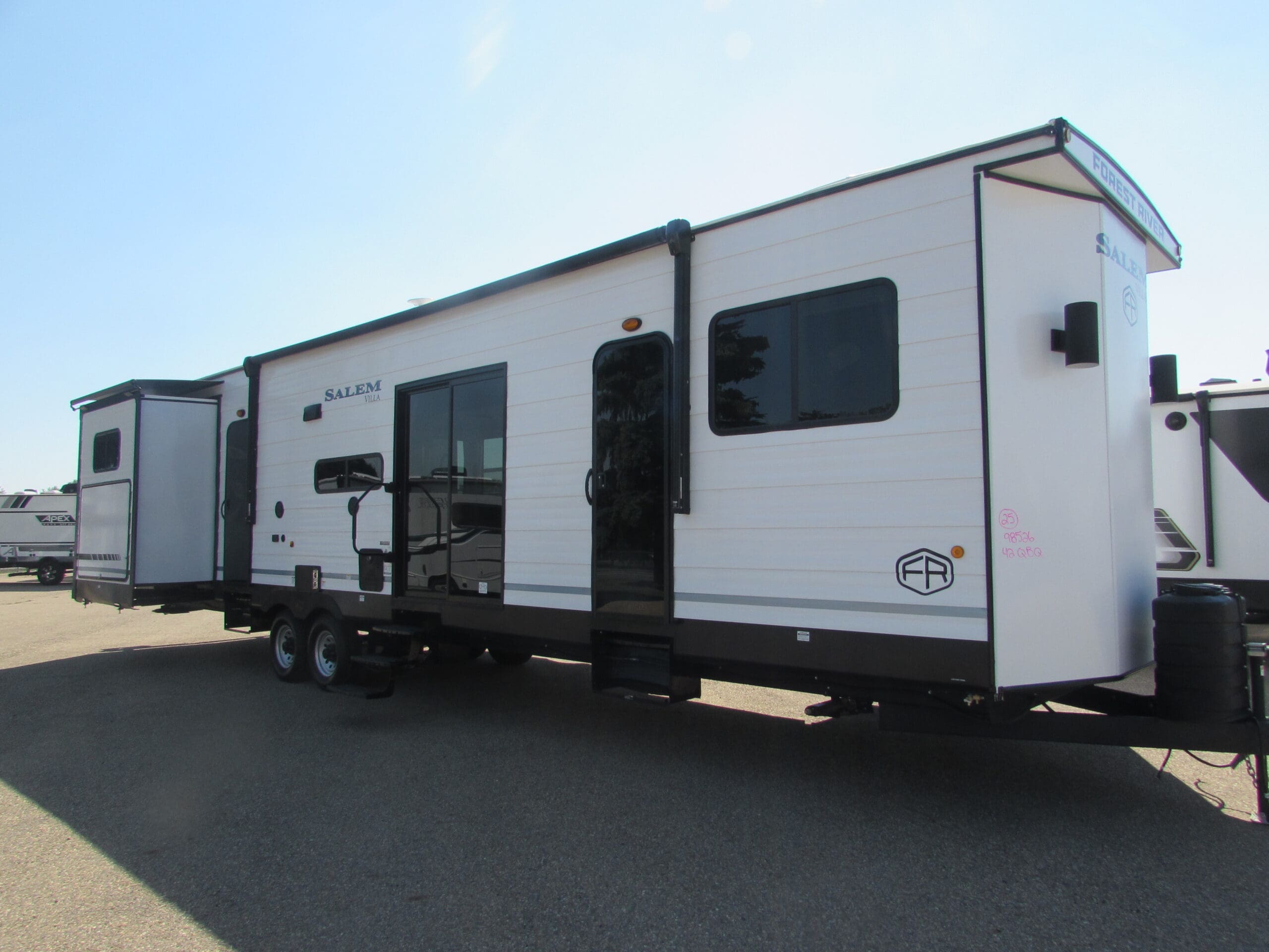 This 2025 Forest River Salem 42QBQ destination trailer for sale in Red Deer at Vellner Leisure Products is a grand bunkhouse with 4 slides and a grand outdoor kitchen. The large front queen bedroom comes with lots of windows and closet space. The panoramic windows in the living room give a great view or your camp area. The bunk area has 3 beds plus a tri-fold sofa that also makes into a bed. The best feature of all is the half bath at the rear of the trailer that has its own out door access. Please contact Vellner Leisure Products to inquire about this 2025 Forest River Salem 42QBQ destination trailer for sale in Red Deer.