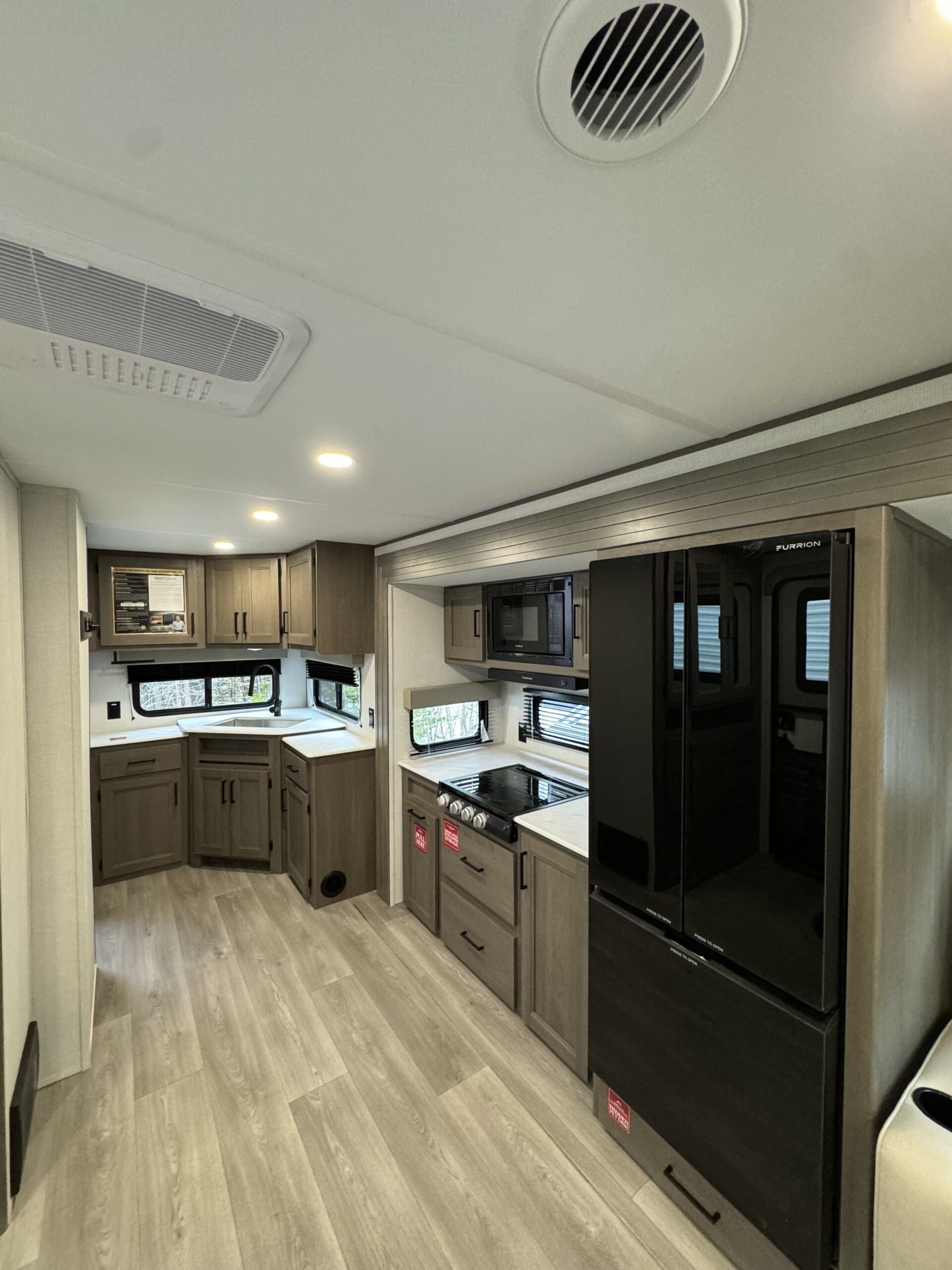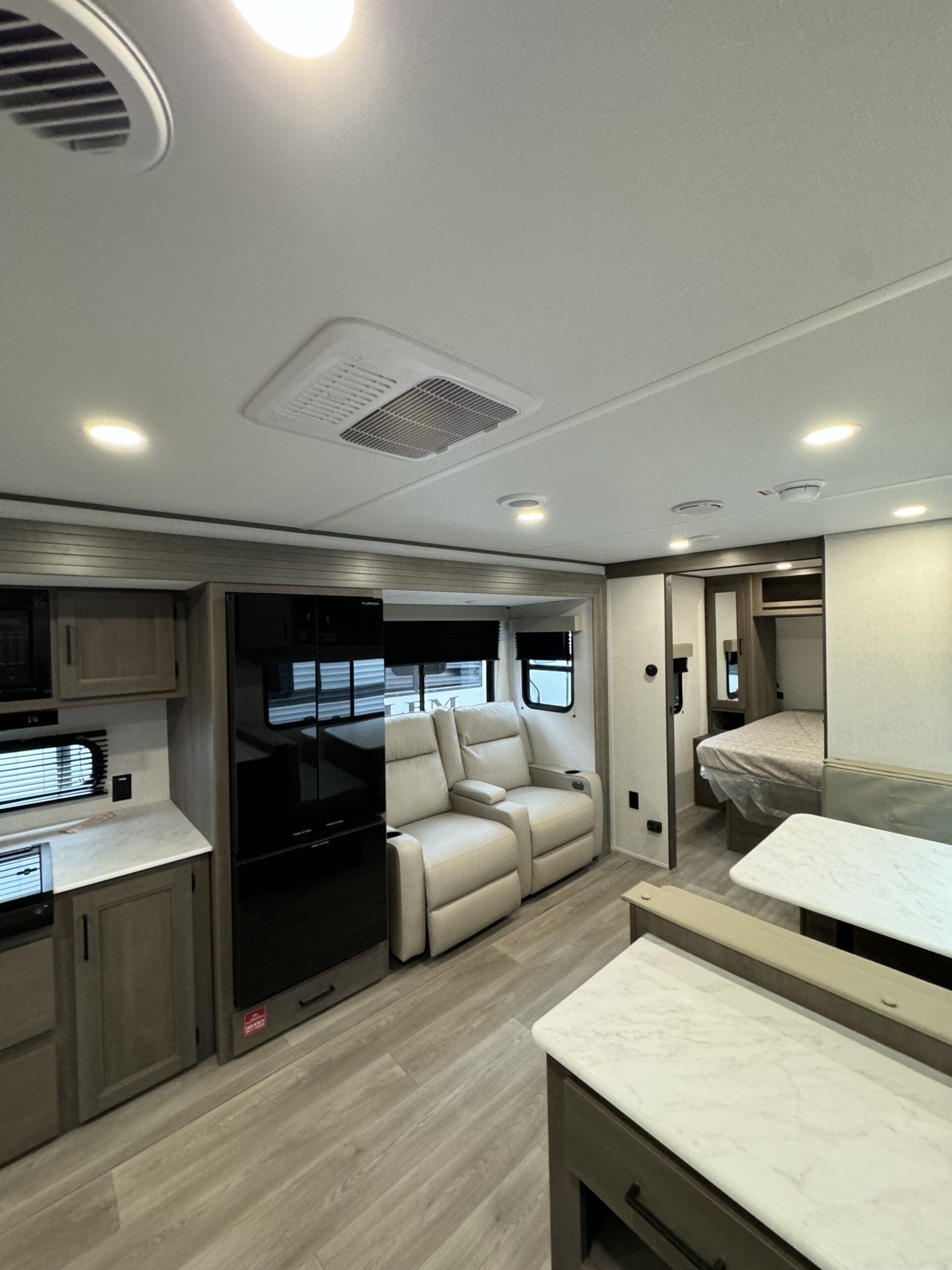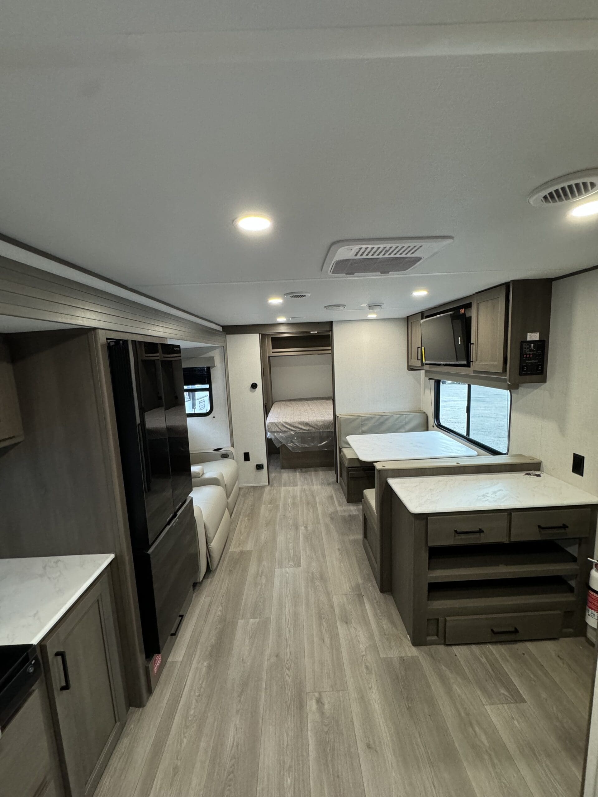The 25MLX boasts a thoughtfully designed layout featuring a large slide-out that expands the main living area. Here, you’ll find theater seating perfect for relaxation after a day of exploration. The booth dinette offers a cozy spot for meals or game nights. The front private bedroom comes equipped with a 60″ x 80″ queen bed and TV prep, ensuring restful nights and entertainment options. In the rear, a corner kitchen provides ample counter space and a deep-seated stainless steel sink, while the adjacent full bathroom includes a walk-in shower and foot-flush toilet