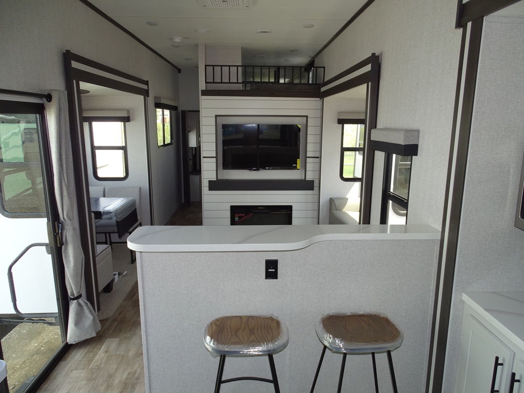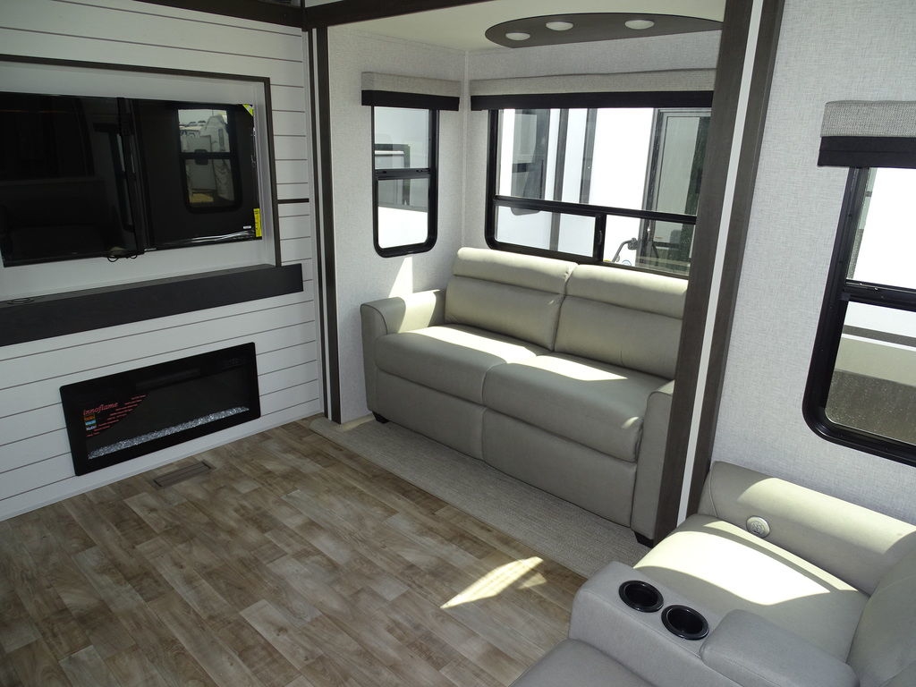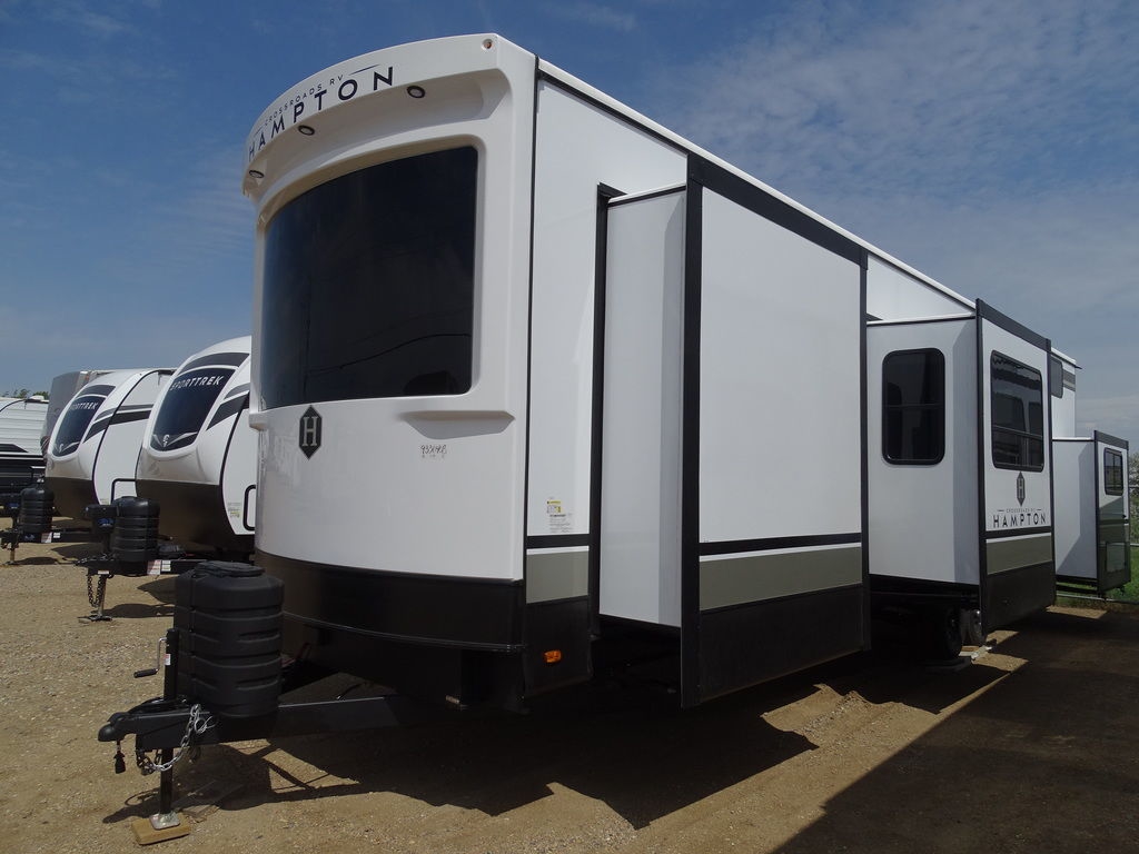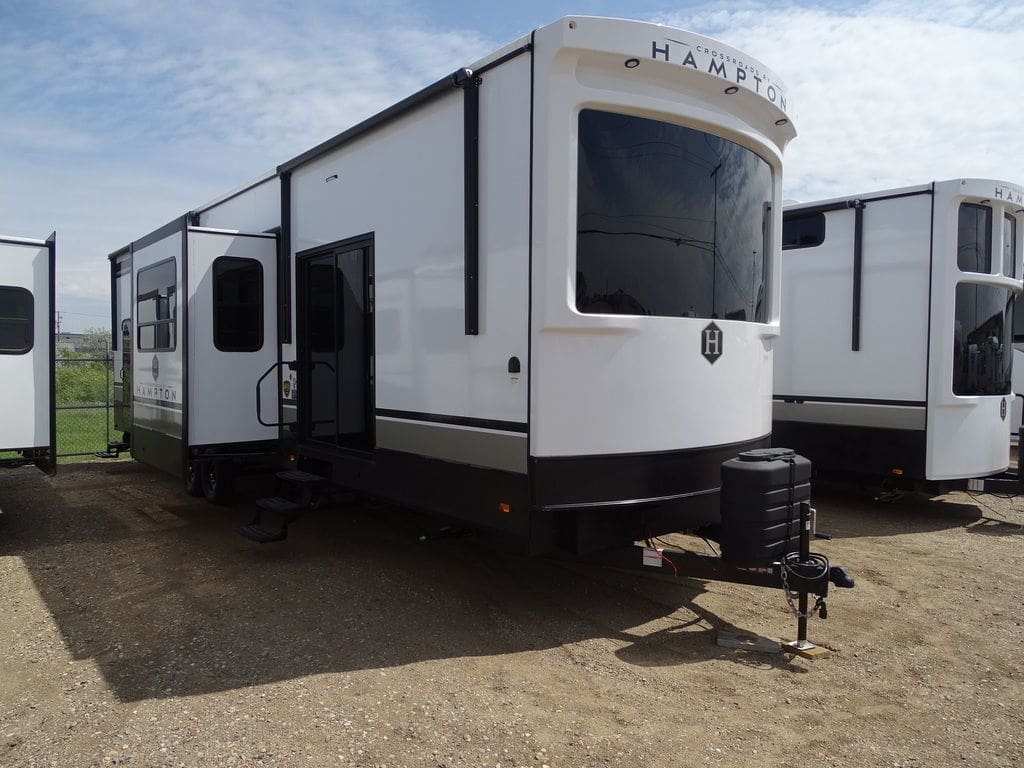 2025 CrossRoads RV Hampton HP388FKLLooking for an extended stay trailer, but don't want to sacrifice your creature comforts? Look no further than the Hampton by Crossroads. Hampton has been designed and engineered to feel like home. Rich stainless steel residential style appliances, 8- foot ceilings, hardwood raised panel cabinetry, and abundant storage await you in a Hampton. Wherever your adventure takes you the Hampton will allow you to make your home where you want it to be. Features may include:ExteriorOne Piece Fiberglass Front CapOutside FaucetOutside SpeakersPatio AwningTinted Glass WindowsWiFi PrepInteriorDeep Stainless Steel SinkFaucet w/ Pull-Out SprayerFreestanding Table & Chairs (VBM)Full Extension Ball Bearing Drawer GuidesInsignia Residential 4 Burner RangeRaised Panel Cabinet DoorsResidential Overhead Cabinets w/ LightingResidential RefrigeratorSolid Surface CountertopsStainless Steel Microwave7' Headroom in Slide-Outs8' Floor to Ceiling Height15,000 BTU A/CAM/FM/Bluetooth SoundbarDecorative Accent LightingExterior Cable w/ Satellite Hookup & BoosterInterior LED LightingLED HDTVLiving Area Tri-Fold Hide-a-Bed Sofa (VBM)Patio Door w/ Swing-Out Assist RailPowered Theater SeatingRoller BlindsThree Decor ChoicesTwo Toned Wood FasciaTV Antenna w/ Cable Output15,000 BTU A/C for BedroomCoordinated Window Treatments & BedspreadDeluxe ClosetKing Sized Residential Mattress (VBM)Living Room & Bedroom Ceiling Fan (VBM)TV Hook-Up Features Include 4 Slides 3 Ducted A/C's Power Awning On Demand Water Heater 18 Cu. Ft. Refrigerator Arctic Package Front Stabilizer Jacks Rear Stabilizer Jacks Microwave Home Theatre LED TV Ceiling Fan Fantastic Fan LED Lighting Roller Shades Solid-Surface Counter Tops Free Standing Dinette Theatre Seating Trifold Sofa Fireplace Weight 12,299 Lbs.
