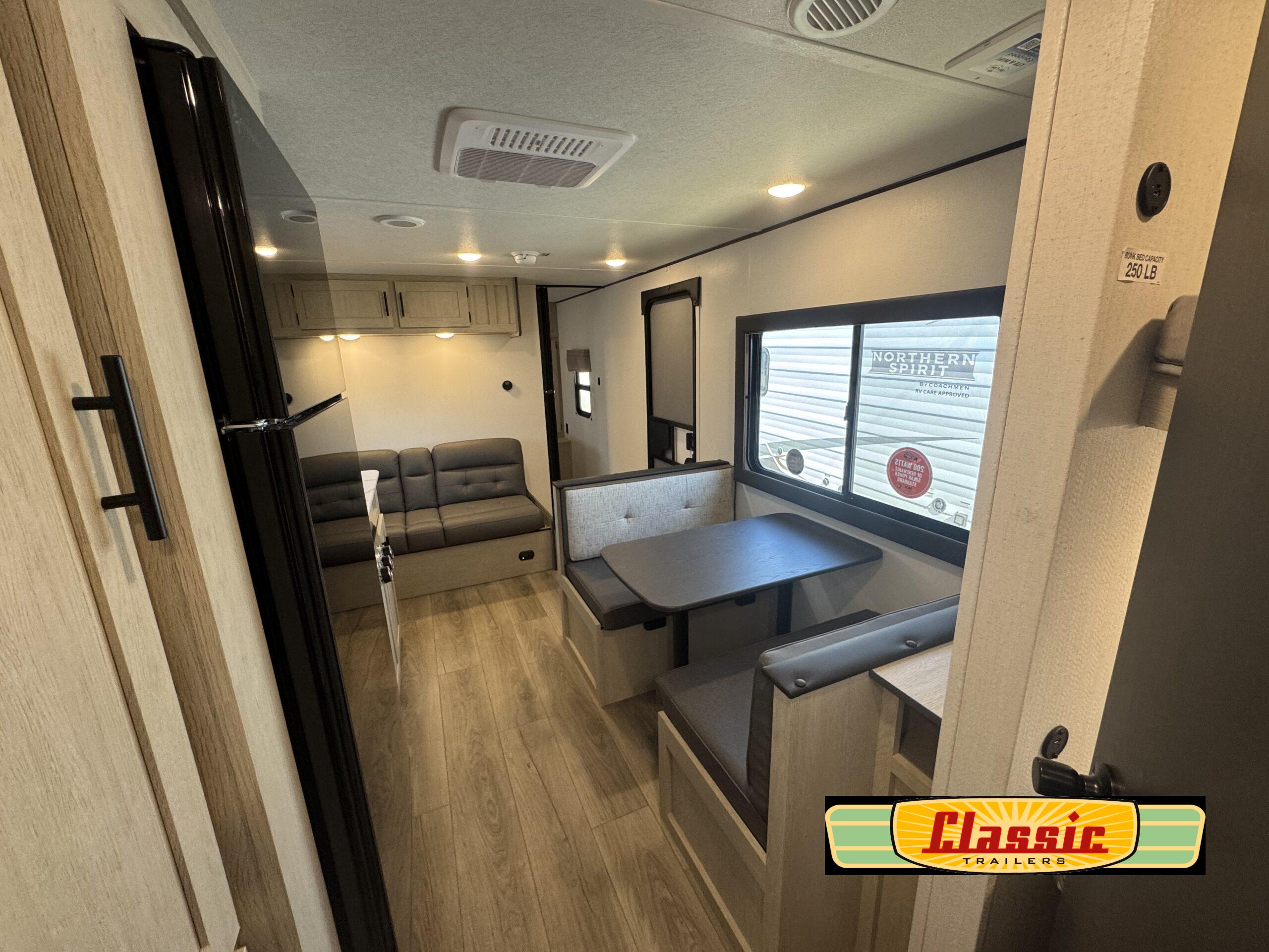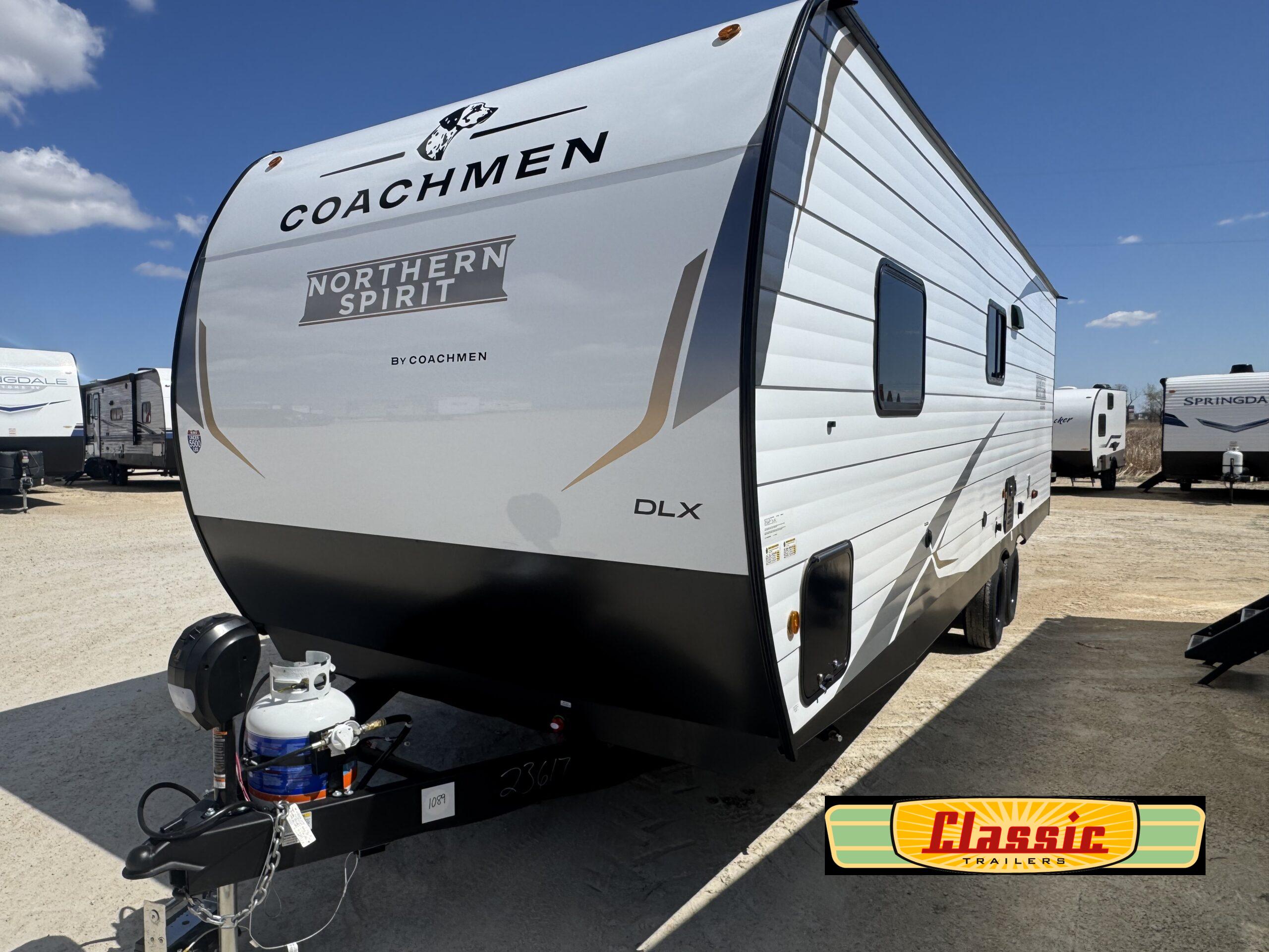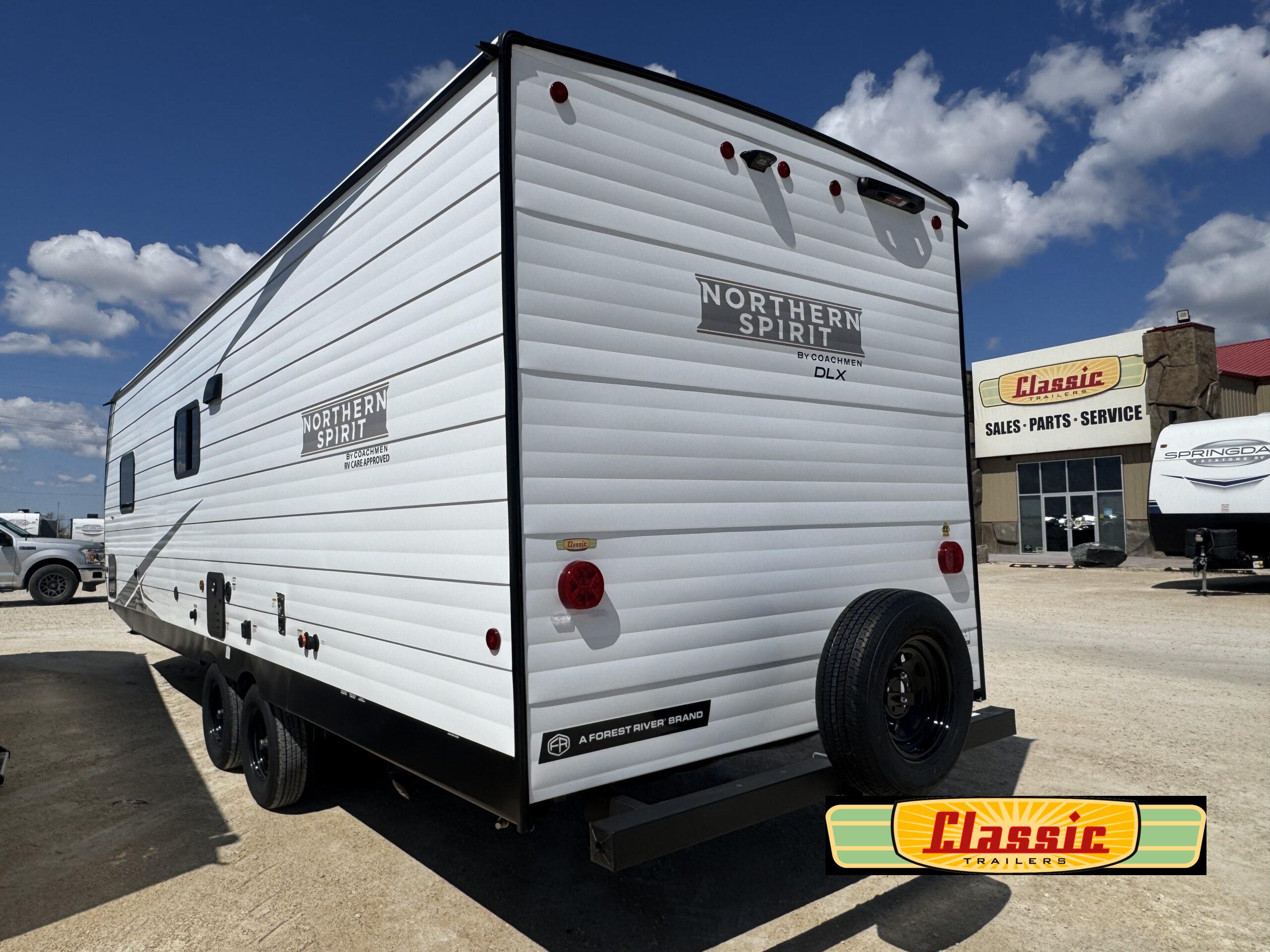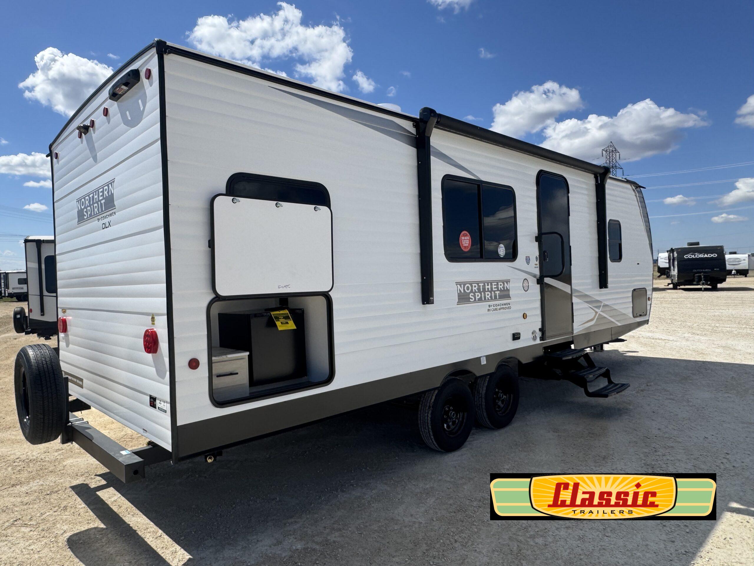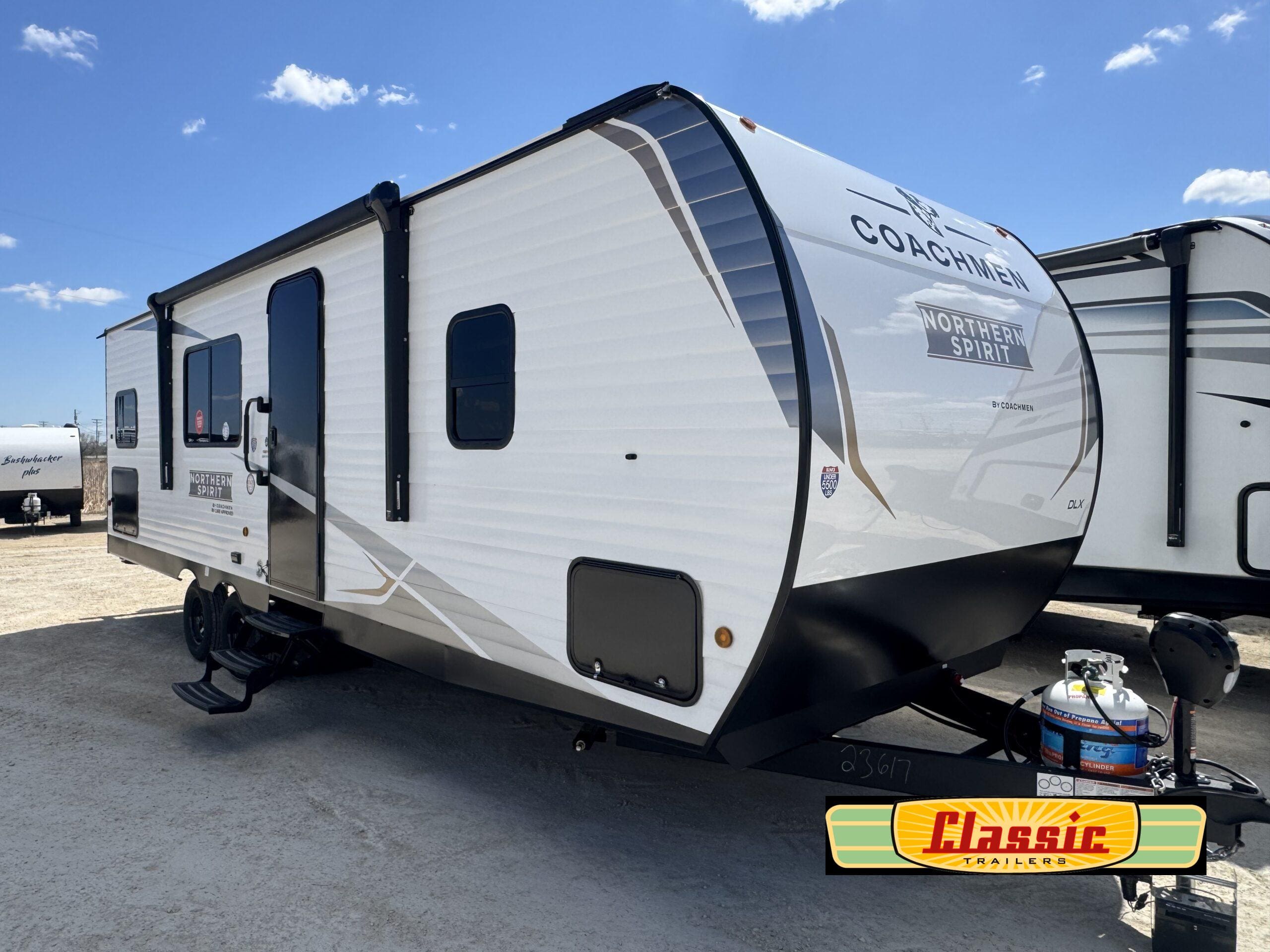 In any Northern Spirit DLX travel trailer by Coachmen, you will find quality craftsmanship along with an affordable price tag. These units each feature four stabilizer jacks to make setting up easier and an enclosed underbelly for added protection as you travel. The Base Camp Package provides each unit with black tank flush, a monitor panel for quick access to the functions of your unit, a 13.5K A/C unit, and a tankless water heater for added convenience. Inside, you’ll find seamless countertops, sink covers, a portable Bluetooth speaker, and more comforts!