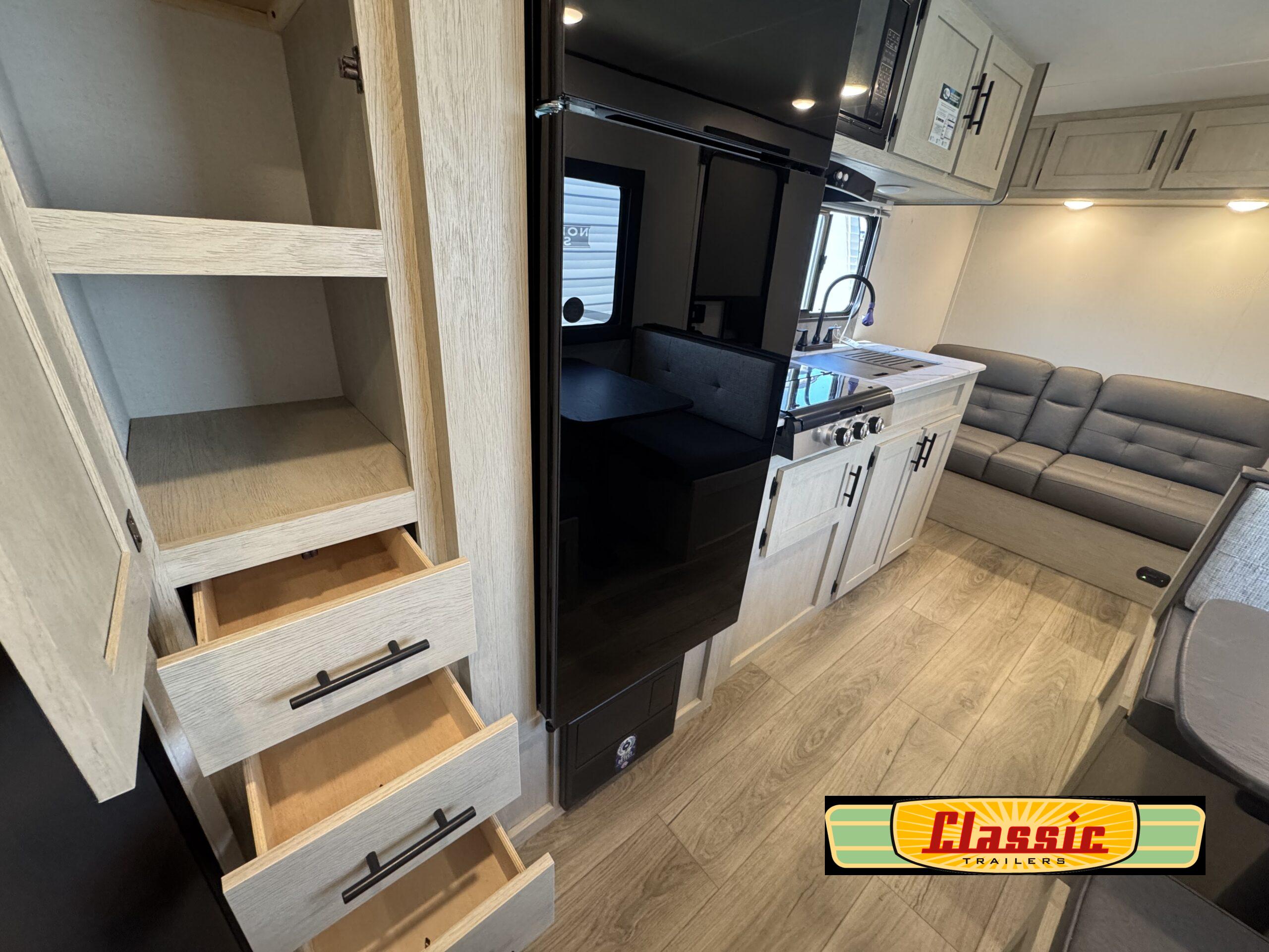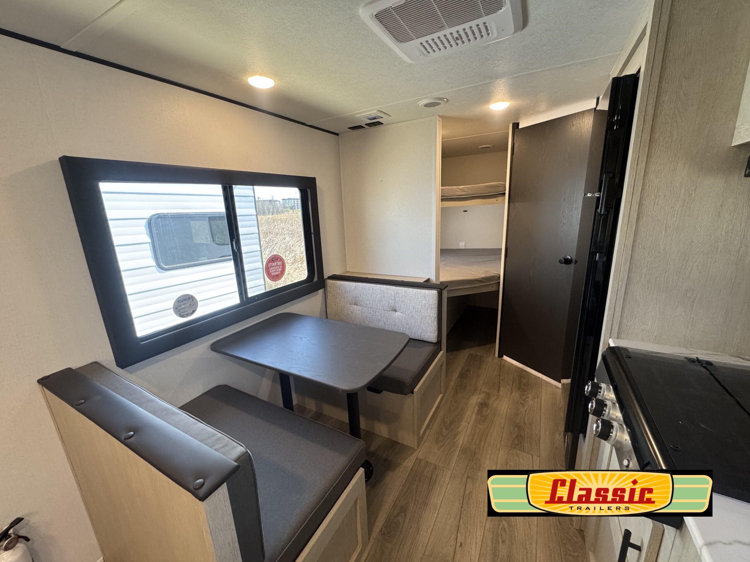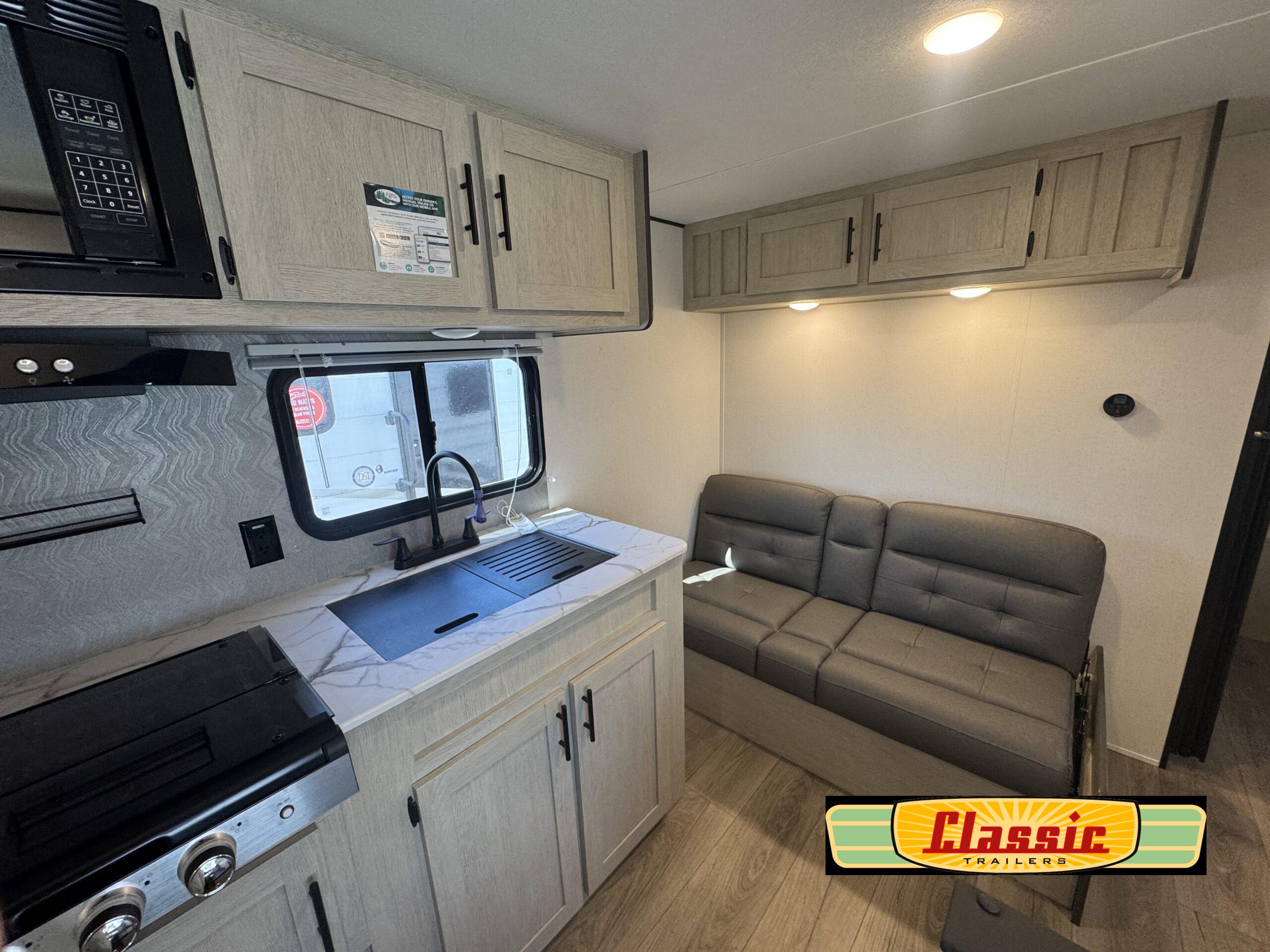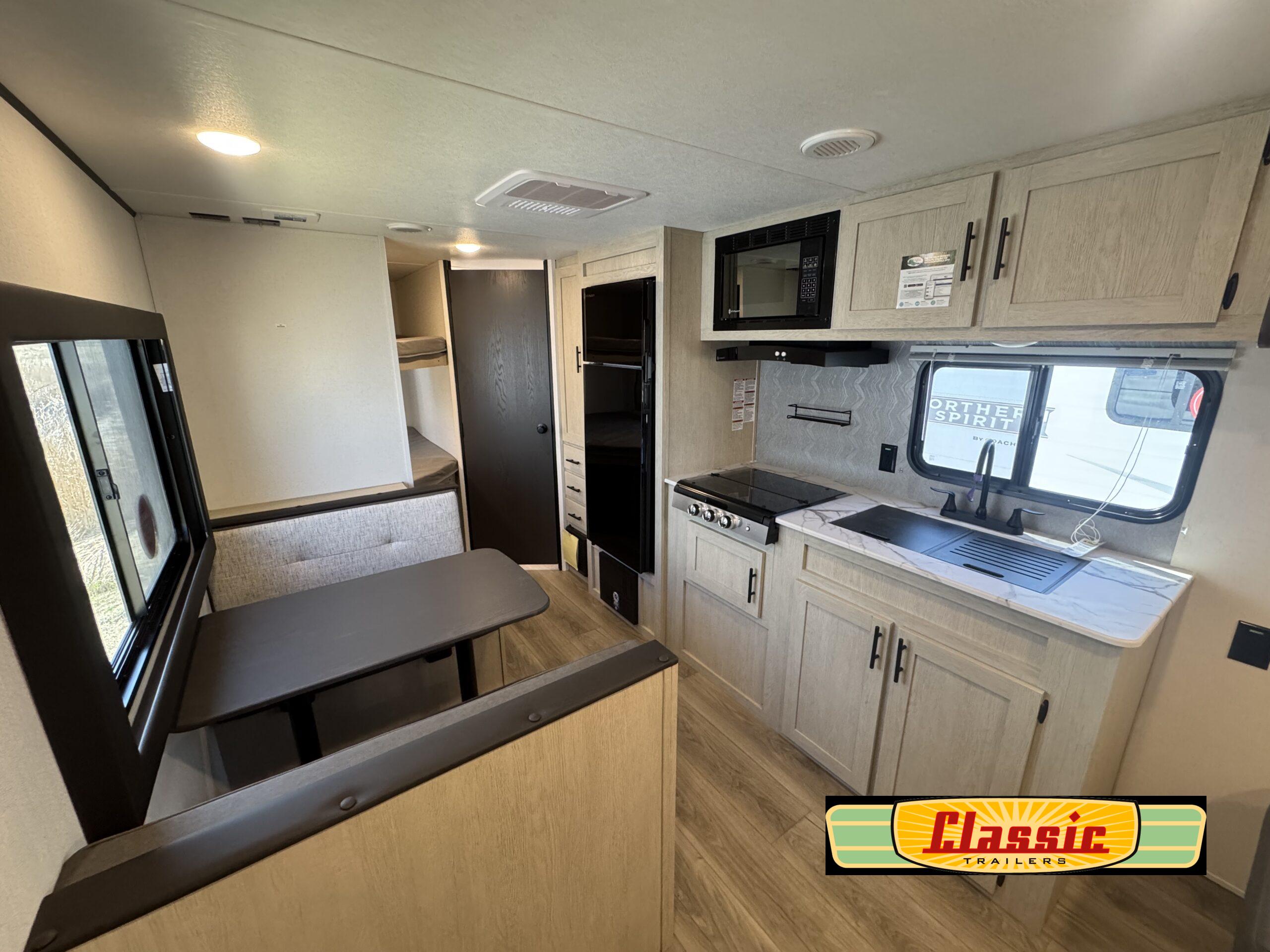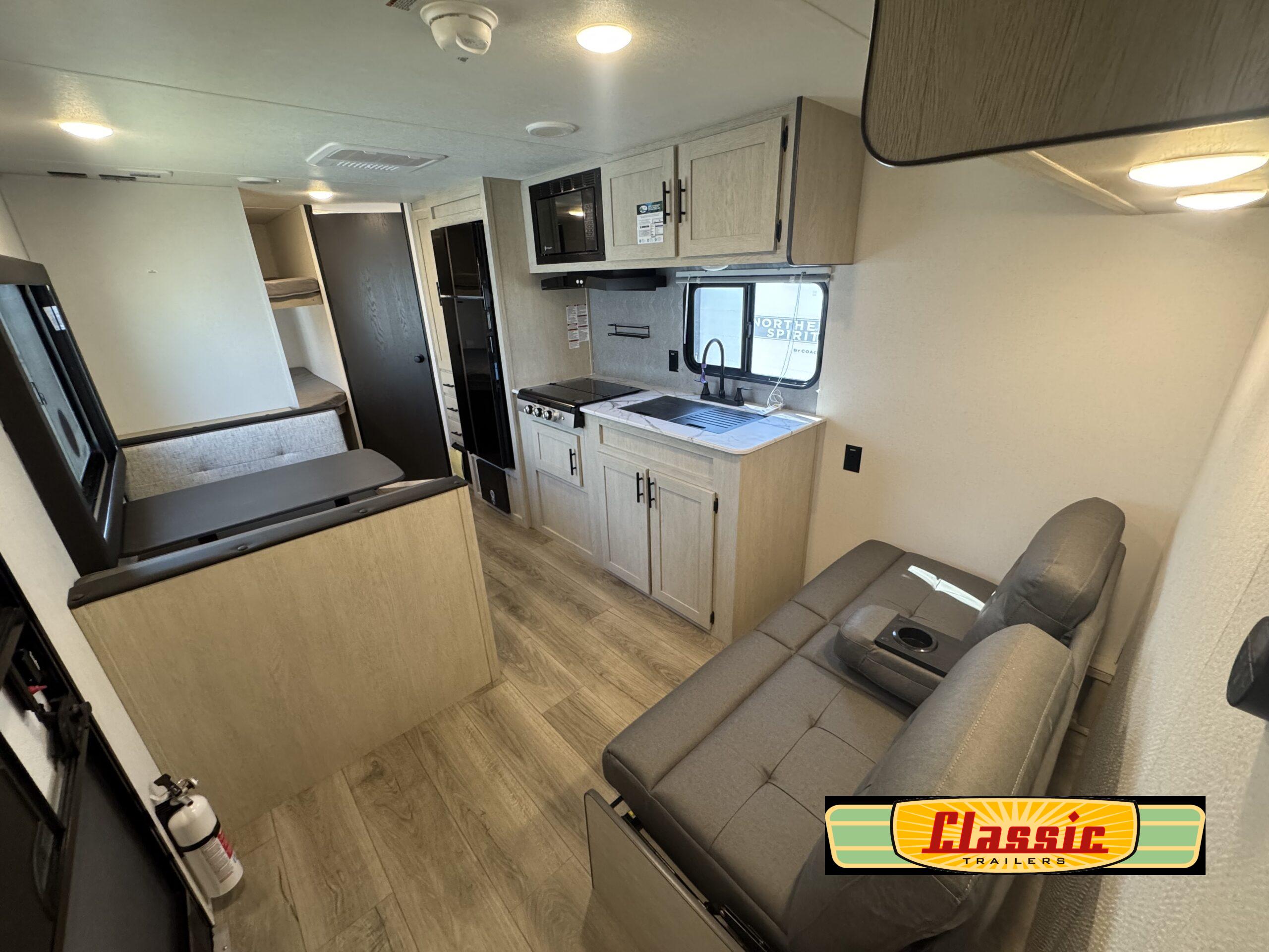 In any Northern Spirit DLX travel trailer by Coachmen, you will find quality craftsmanship along with an affordable price tag. These units each feature four stabilizer jacks to make setting up easier and an enclosed underbelly for added protection as you travel. The Base Camp Package provides each unit with black tank flush, a monitor panel for quick access to the functions of your unit, a 13.5K A/C unit, and a tankless water heater for added convenience. Inside, you’ll find seamless countertops, sink covers, a portable Bluetooth speaker, and more comforts!