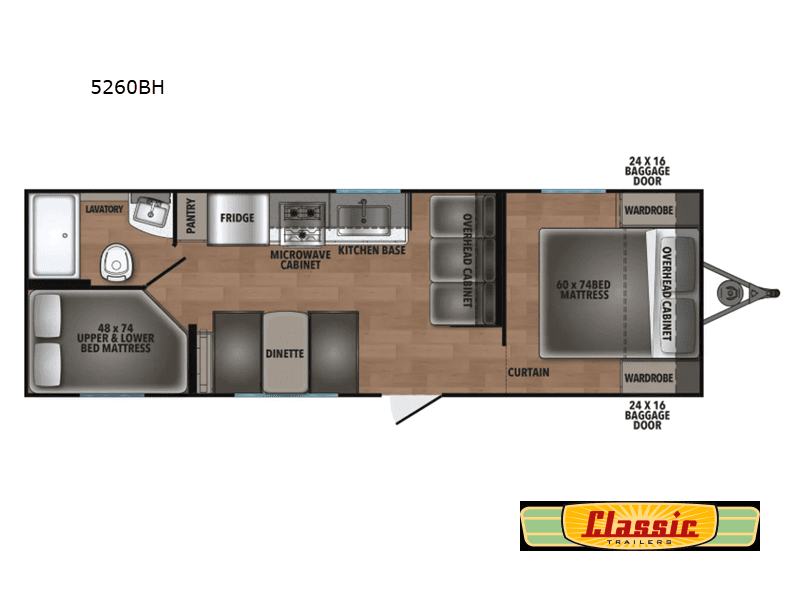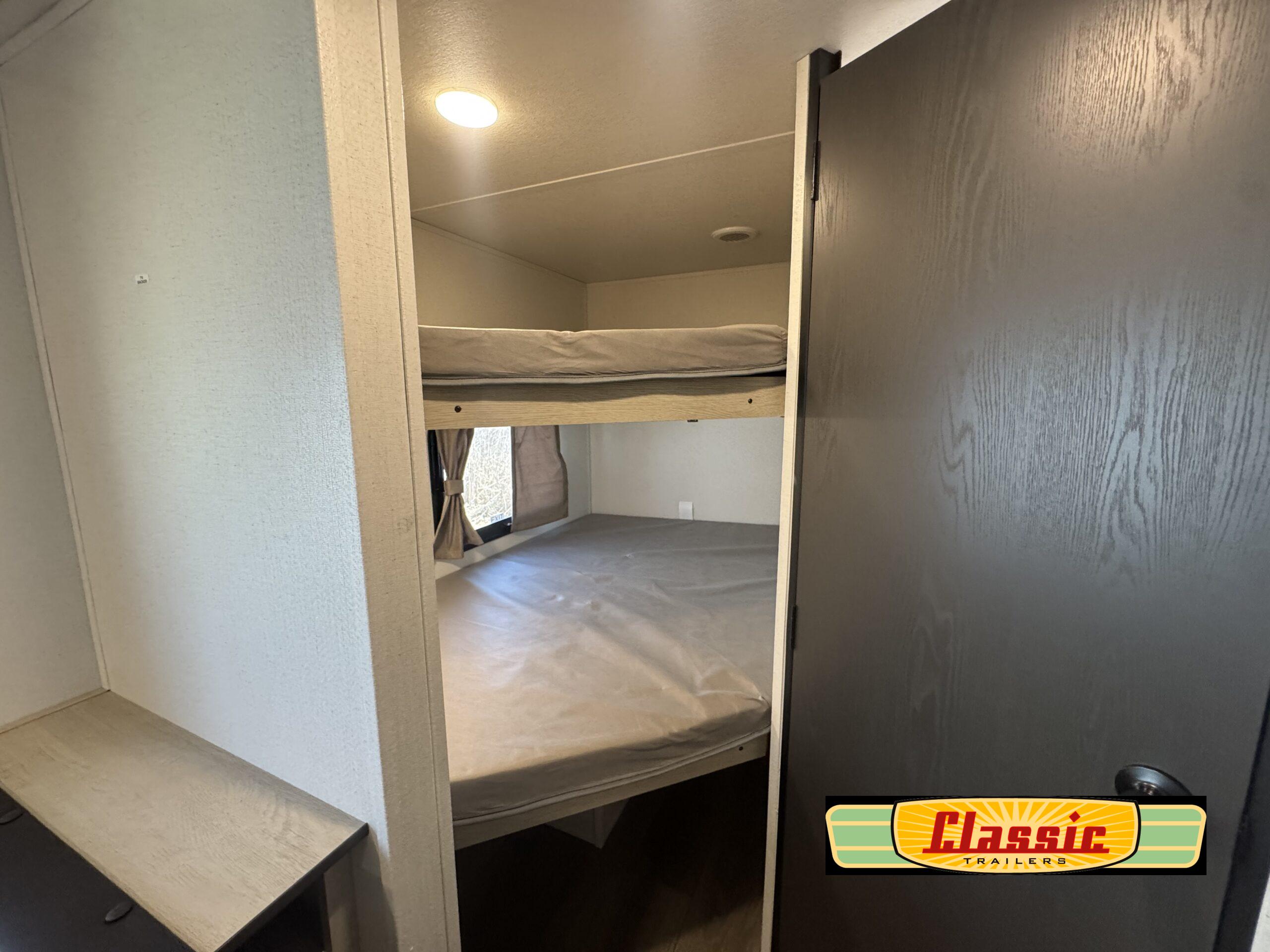 Enjoy camping with family and friends in this bunk model! There are double-size bunks in the rear roadside corner and a full bath with shower, vanity, and toilet in the opposite rear corner. The kitchen is fully equipped for your camping trips featuring a three burner cooktop, a microwave cabinet, a large sink, and an 8 cu. ft. residential-style refrigerator. You will also love the pantry for all of your canned goods and snacks. In the front of this unit, a semi–private bedroom with a curtain provides a quiet retreat from the rest of the unit, and there are dual wardrobes to keep your clothes tidy.
