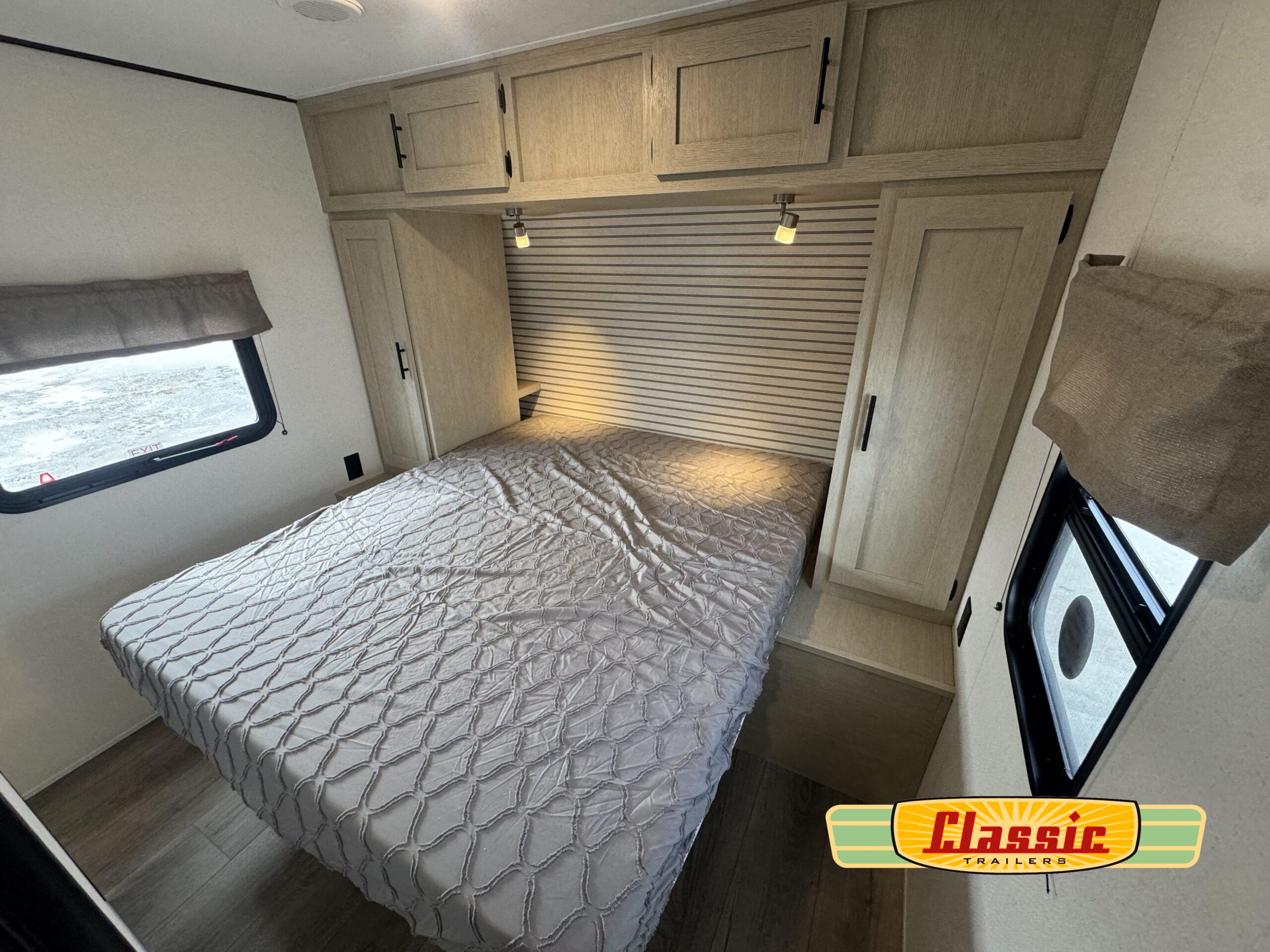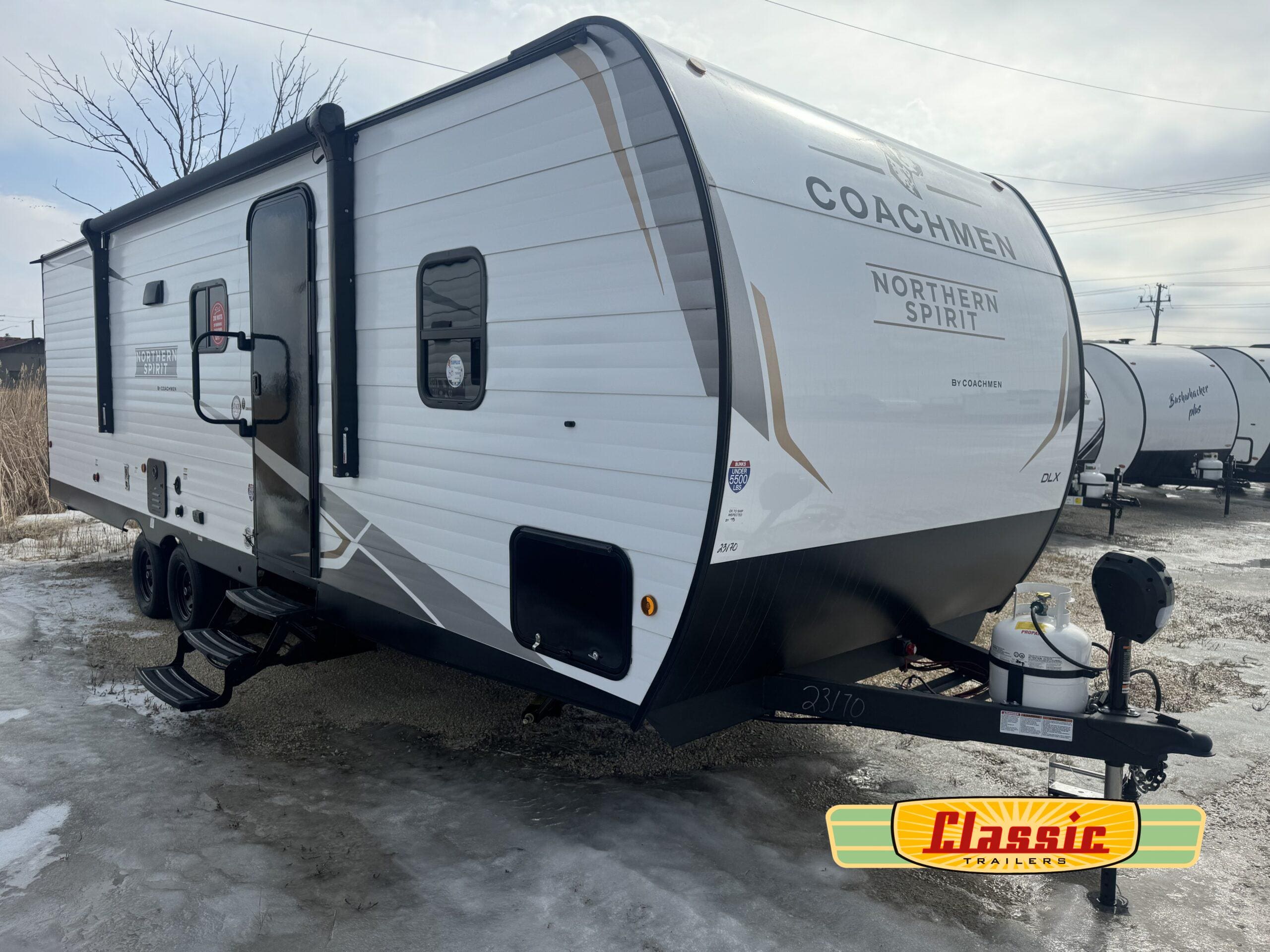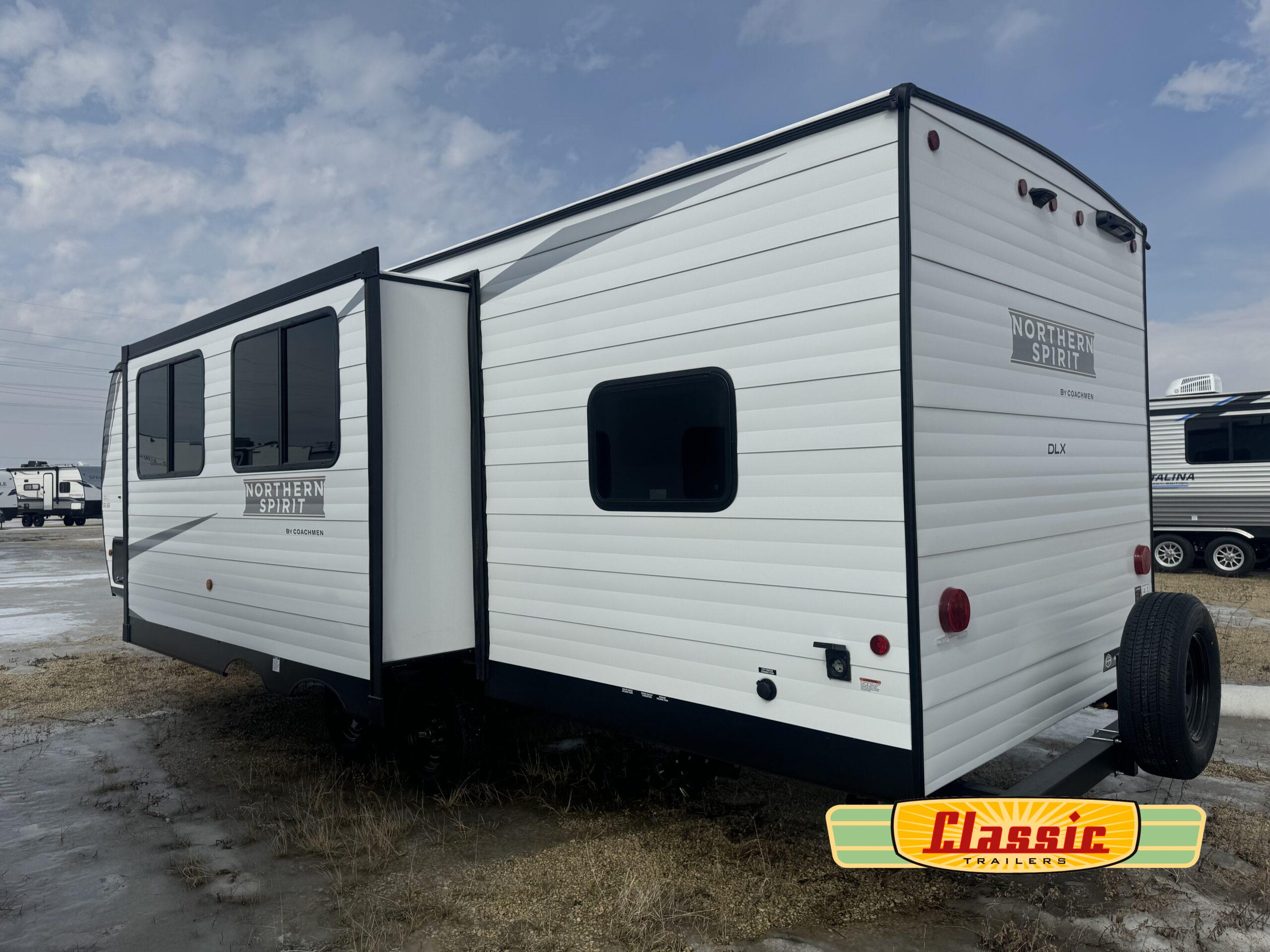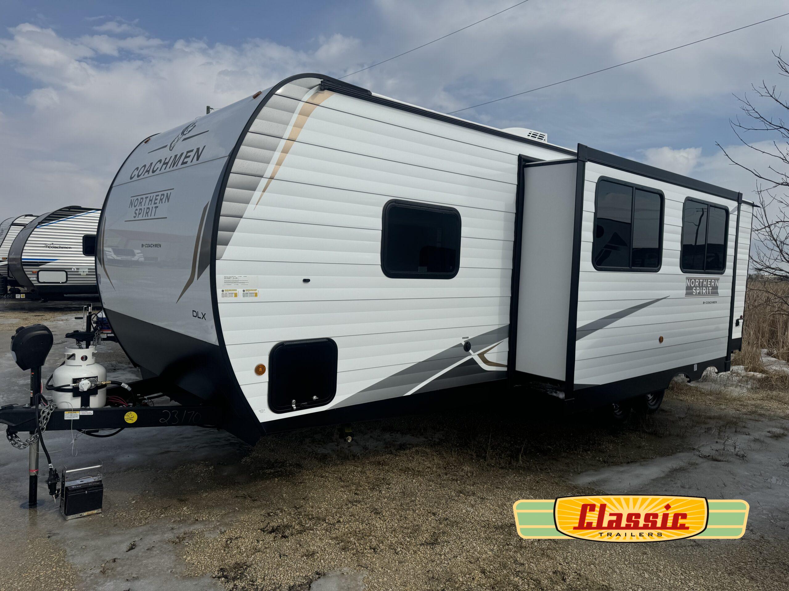In any Northern Spirit DLX travel trailer by Coachmen, you will find quality craftsmanship along with an affordable price tag. These units each feature four stabilizer jacks to make setting up easier and an enclosed underbelly for added protection as you travel. The Base Camp Package provides each unit with black tank flush, a monitor panel for quick access to the functions of your unit, a 13.5K A/C unit, and a tankless water heater for added convenience. Inside, you’ll find seamless countertops, sink covers, a portable Bluetooth speaker, and more comforts!