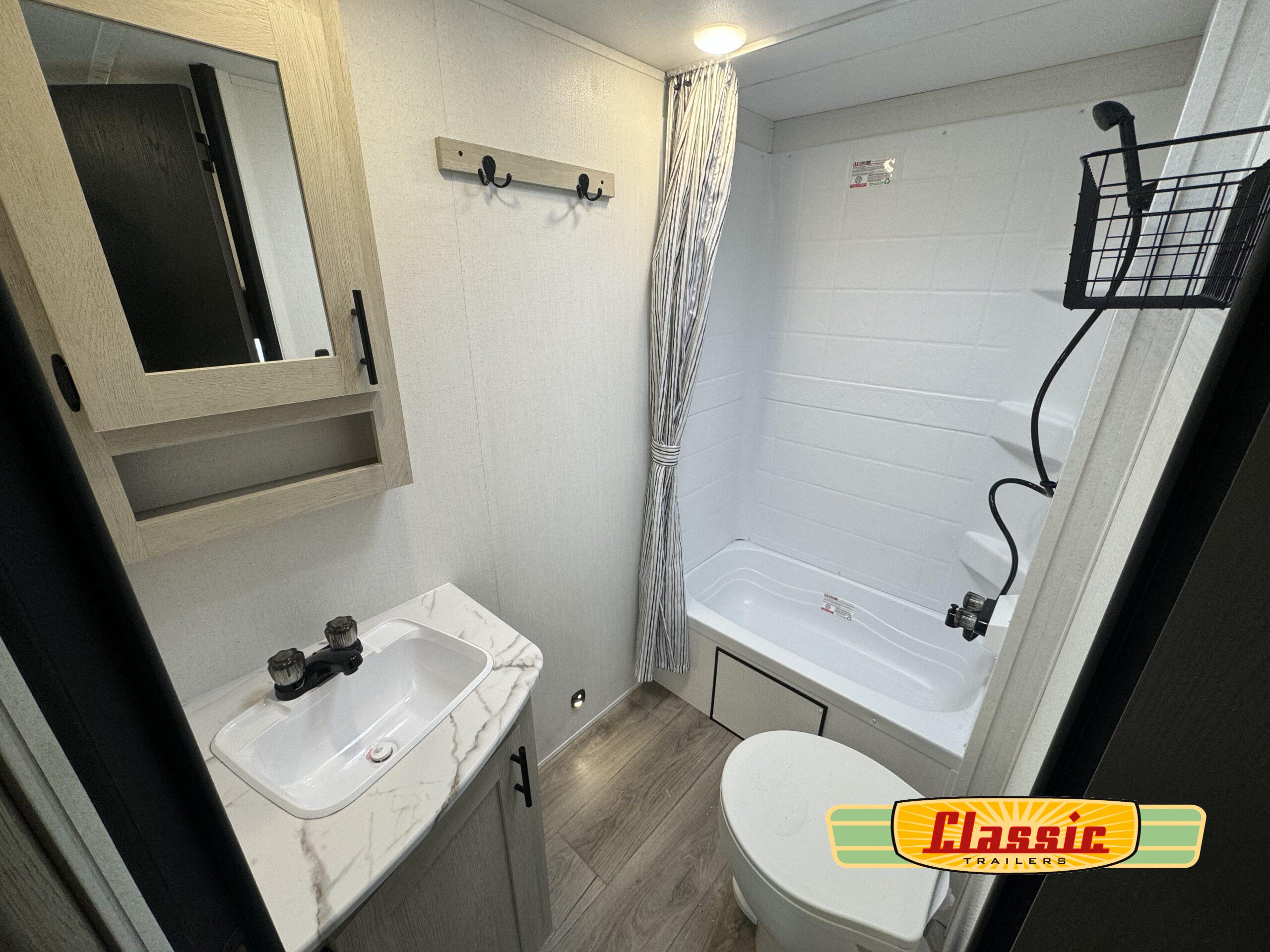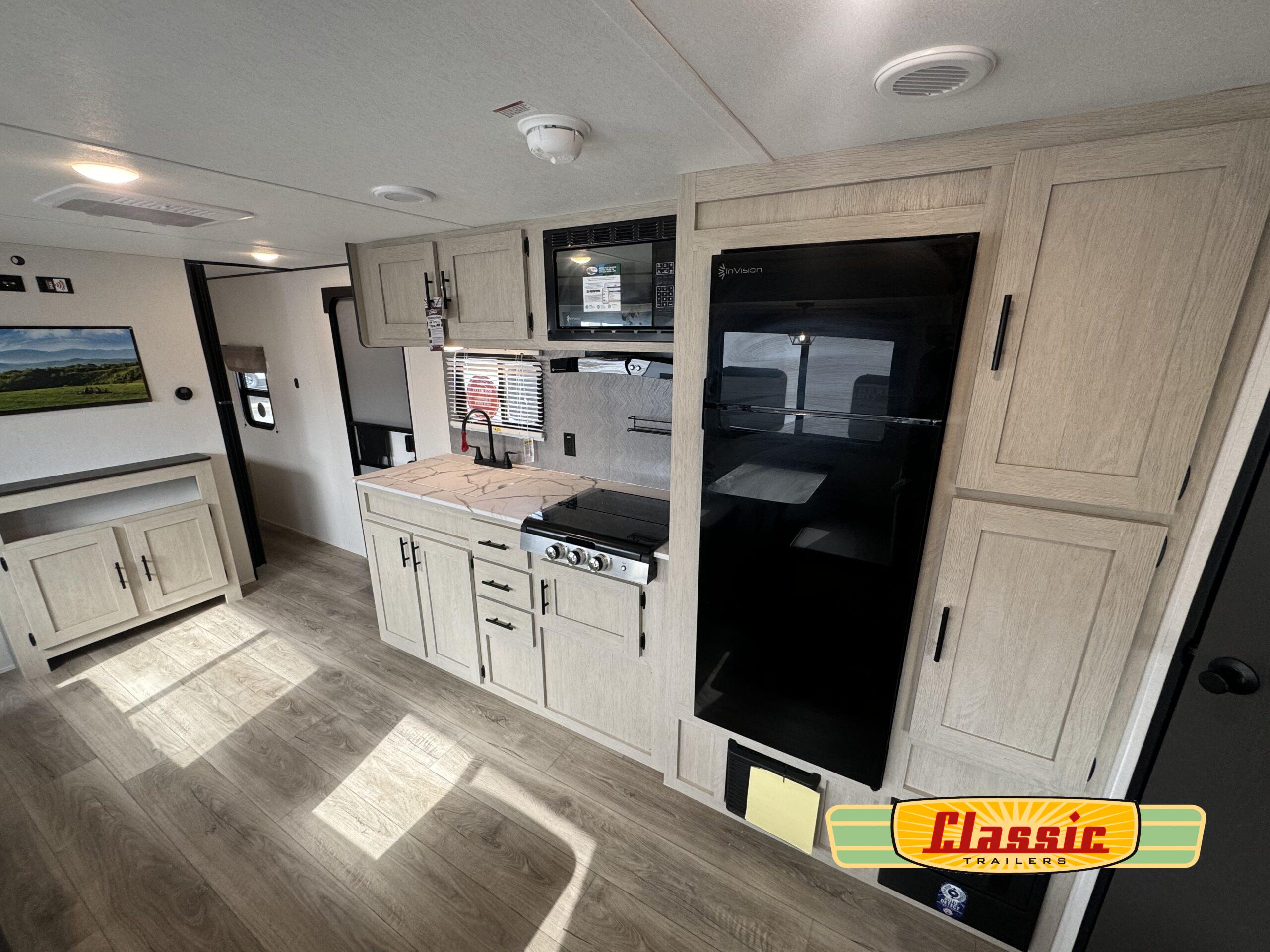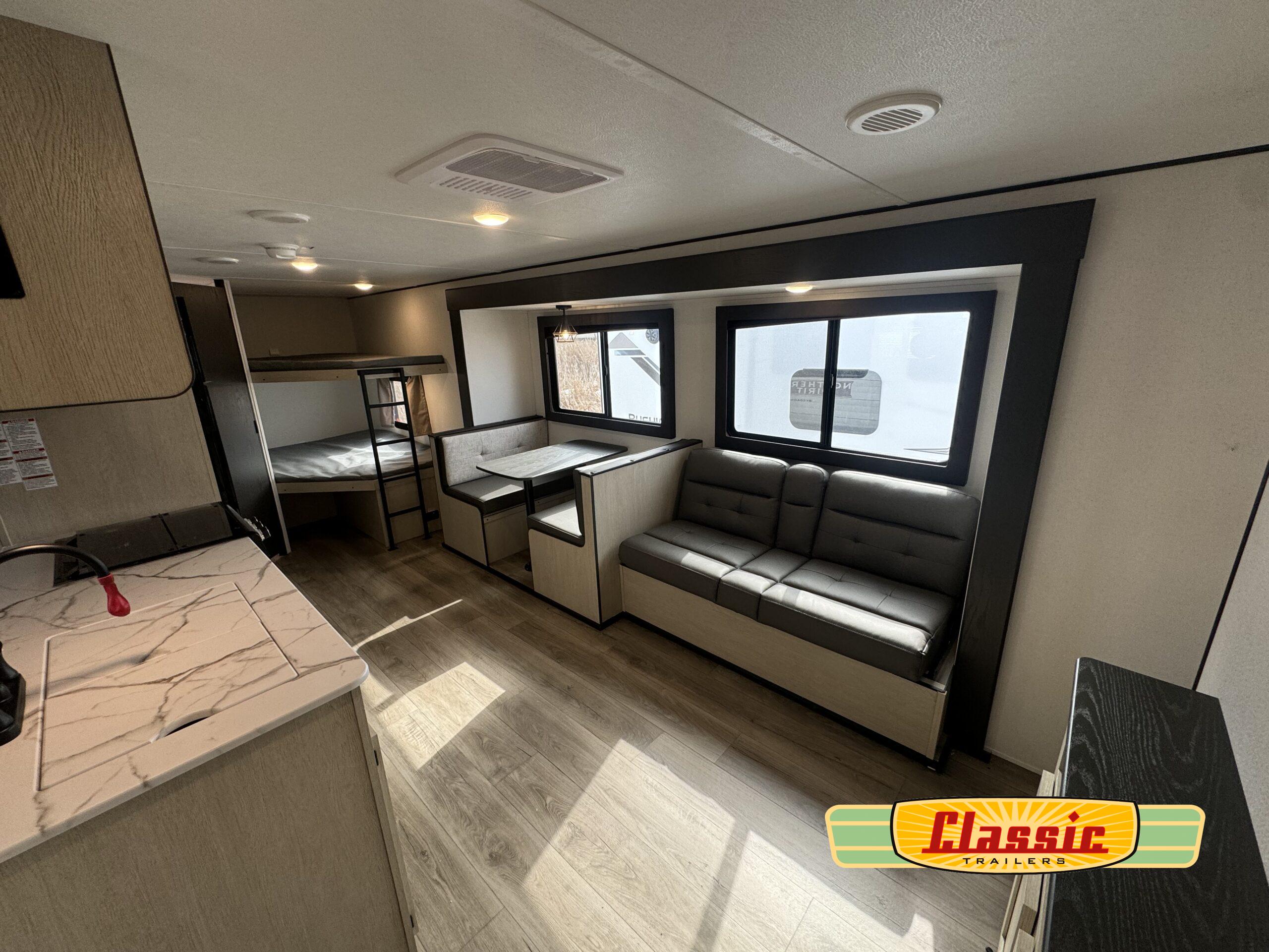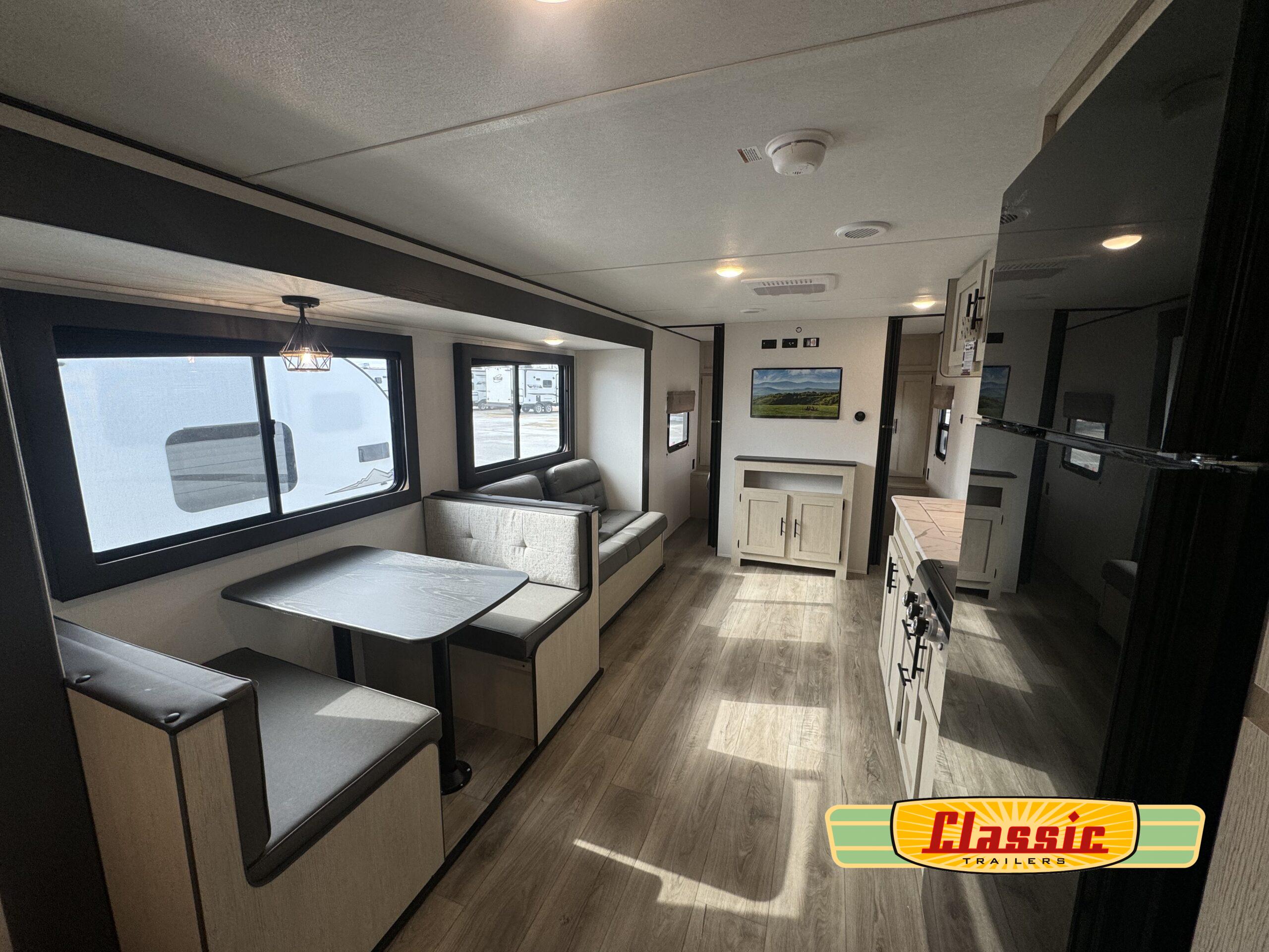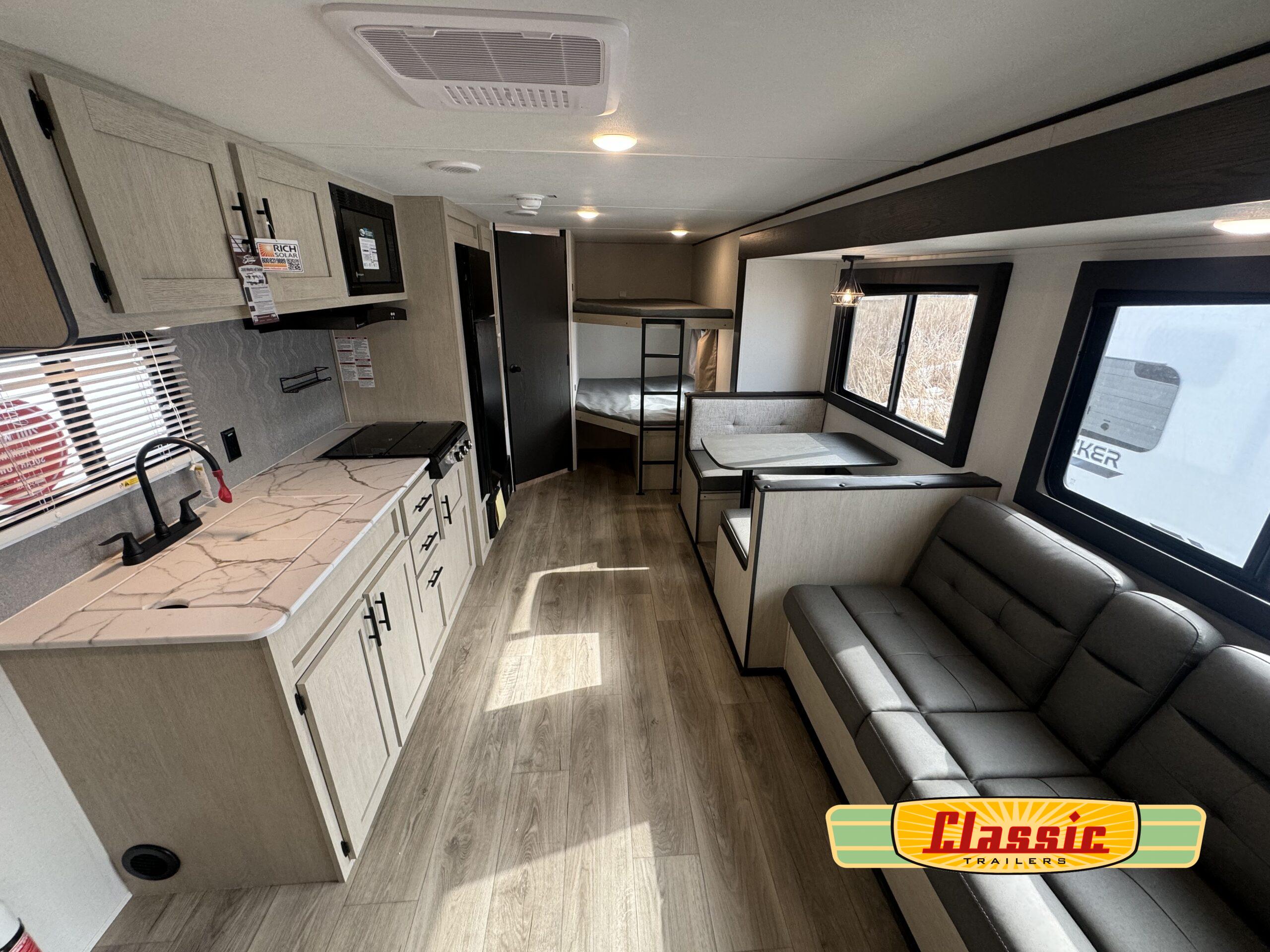 In any Northern Spirit DLX travel trailer by Coachmen, you will find quality craftsmanship along with an affordable price tag. These units each feature four stabilizer jacks to make setting up easier and an enclosed underbelly for added protection as you travel. The Base Camp Package provides each unit with black tank flush, a monitor panel for quick access to the functions of your unit, a 13.5K A/C unit, and a tankless water heater for added convenience. Inside, you’ll find seamless countertops, sink covers, a portable Bluetooth speaker, and more comforts!