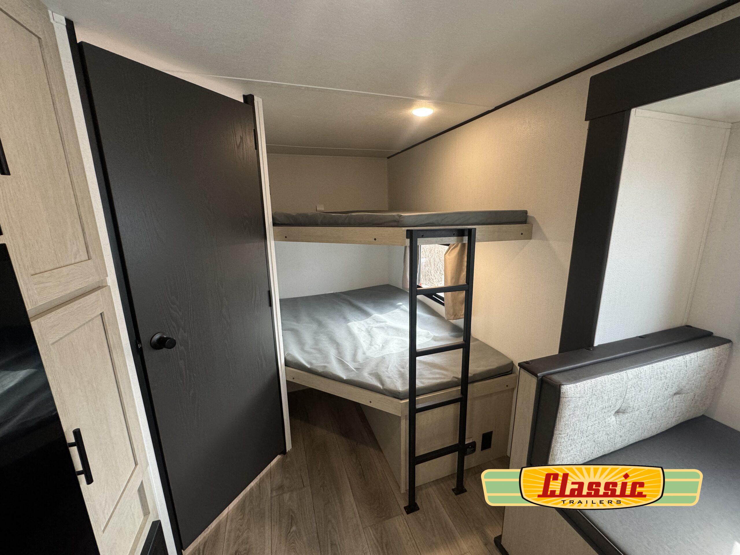 Enjoy camping with family and friends in this bunk model! There are double-size bunks in the rear roadside corner and a full bath with a shower, vanity, and toilet in the opposite rear corner. There is ample counter space in the kitchen, plus there is an outside kitchen when you want to cook outdoors. You will also love the pantry in this unit that is washer/dryer ready if you want to add those appliances. A booth dinette within the large slide will provide a place to dine and play games together, and there is a TV mount across the room if you want to add entertainment. You’ll love having a front bedroom with a 60″ x 74″ bed and dual wardrobes to keep your things picked up!