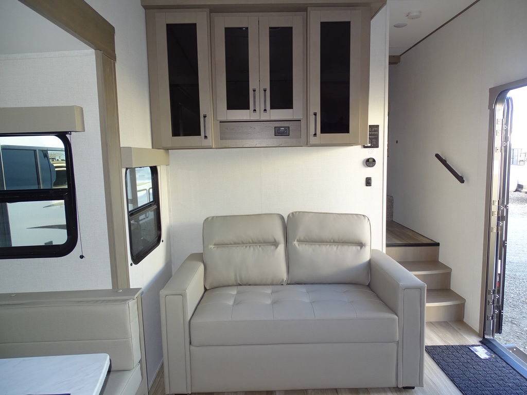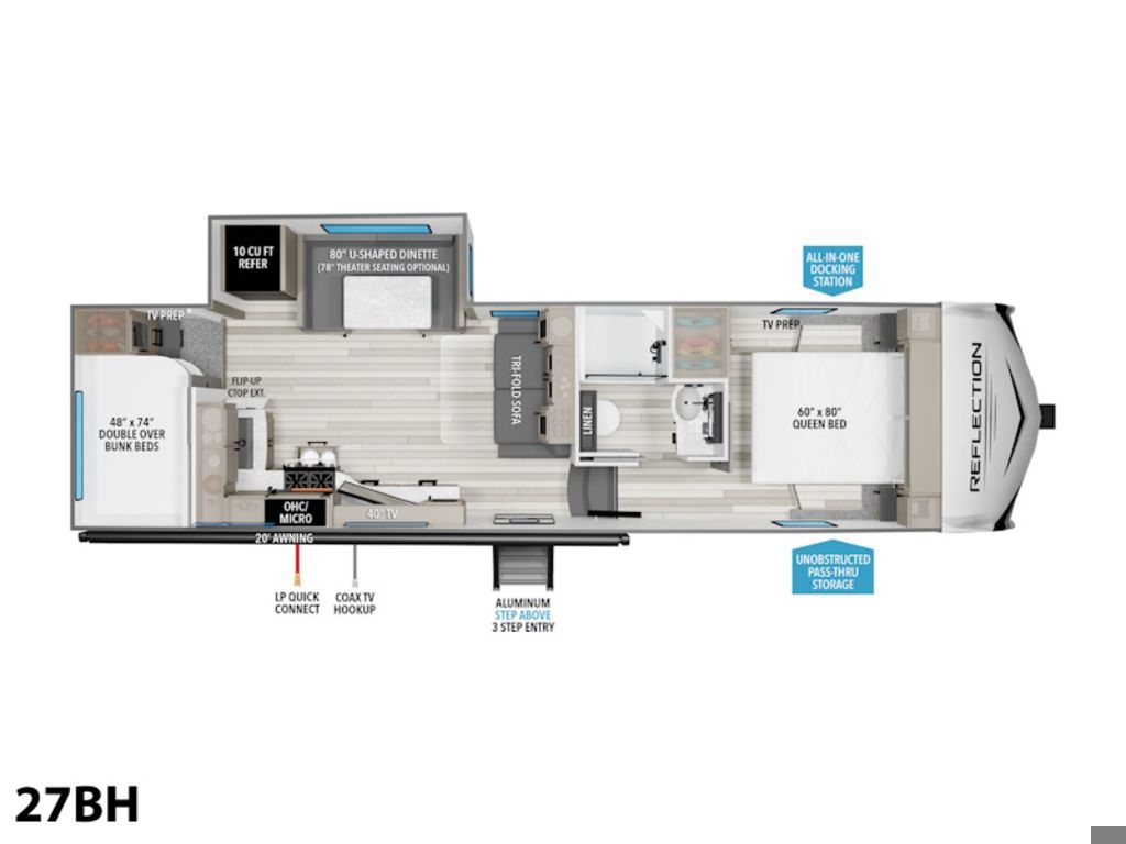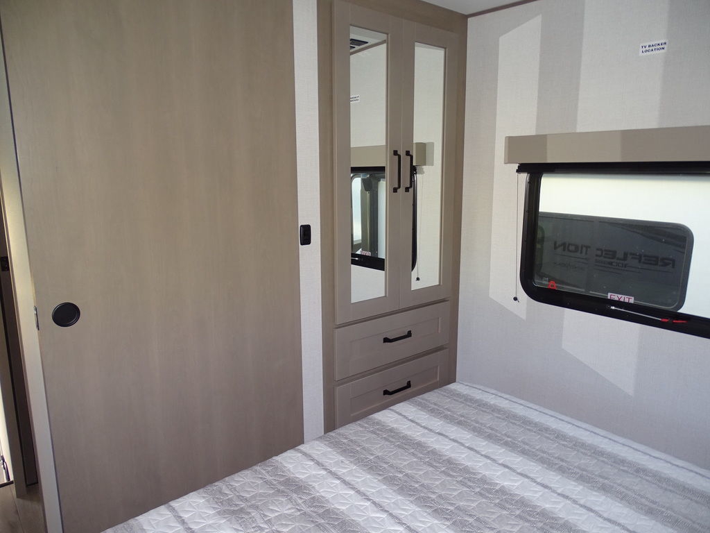 2024 Grand Design Reflection 100 27BHExplore More Spend LessThe Reflection 100 Series of half-ton towable fifth-wheel RV's is an ideal solution for those seeking a feature-packed RV at a reasonable price. Its lightweight construction and low profile design means it can be safely towed by today's half-ton trucks without sacrificing comfort or luxury. The Reflection 100 Series is the perfect choice for any budget or lifestyle. It's everything you need to make your RV dreams come true. The Perfect Union of Luxury and Value!Reflecting a perfect union of luxury and value, the Reflection 100 Series takes the half-ton towable fifth-wheel RV experience to unprecedented levels. Engineered with meticulous attention to the towing capacities of today's half-ton trucks, these RVs ensure safe and effortless towing, allowing you to navigate with reassuring stability and power. Despite their competitive pricing, they astonish with the wealth of high-end features packed inside. Your on-road living experience is enriched by a kitchen fitted with premium appliances that seamlessly blend with the elegance of a residential-styled interior. The interiors are resplendently spacious, mirroring the comfort and style of a modern home, making your travels not merely journeys but a mobile extension of your home life. In the Reflection 100 Series, we've fused affordability with an unparalleled level of comfort to enhance your adventures on the road.Features may include:Exterior80% Tint Radius Safety Glass WindowsBattery Kill Switch in Pass Thru Storage Area30 lbs LP Bottles (2)30" Radius Entry DoorOutside ShowerFactory Installed Roof LadderExterior Cable Hookup (Sidewall)InteriorMatte Black Fixtures and HardwareHardwood Galley Slide Trim MoldingsSolid Hardwood Drawer FrontsLouvered Tread Steps to BedroomSolid Core Cabinet StilesPre-Drilled and Screwed CabinetryBall Bearing Full Extension Drawer GlidesLarge Panoramic Slide Room WindowsHeated Wall Hugger Theater Seats w/LED Lights & Massage (Most Models)Premium Congoleum FlooringDuctless Flooring Throughout Living AreaResidential Style Window TreatmentLED Lighting with Motion Sensors (Key Areas) Features Include 1 Slide Ducted A/C Power Awning On demand Water Heater 10 cu. Ft. Refrigerator Bunks Mor-Ryde Suspension Power Leveling Jacks Aluminum Wheels Microwave Stereo LED TV LED Lighting Pleated Shades U-Shaped Dinette Trifold Sofa Outside Shower Outside Speakers Solar Panel 180 Watts Weight 8200 Lbs.