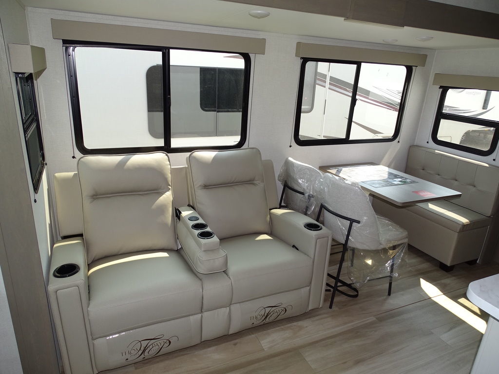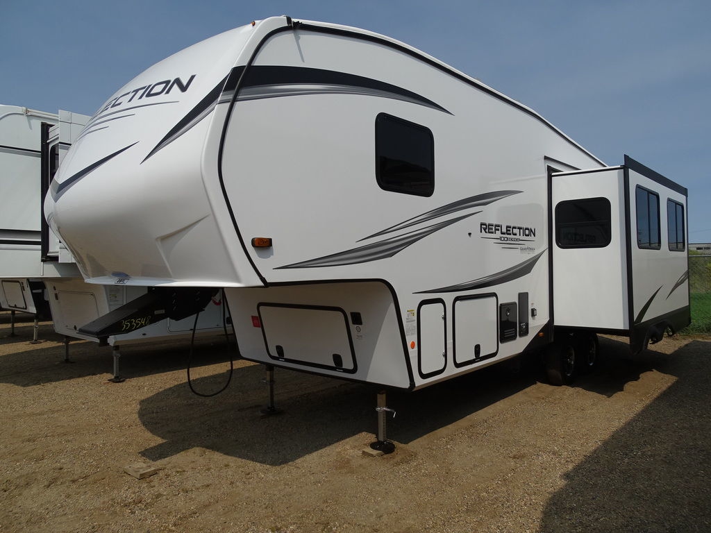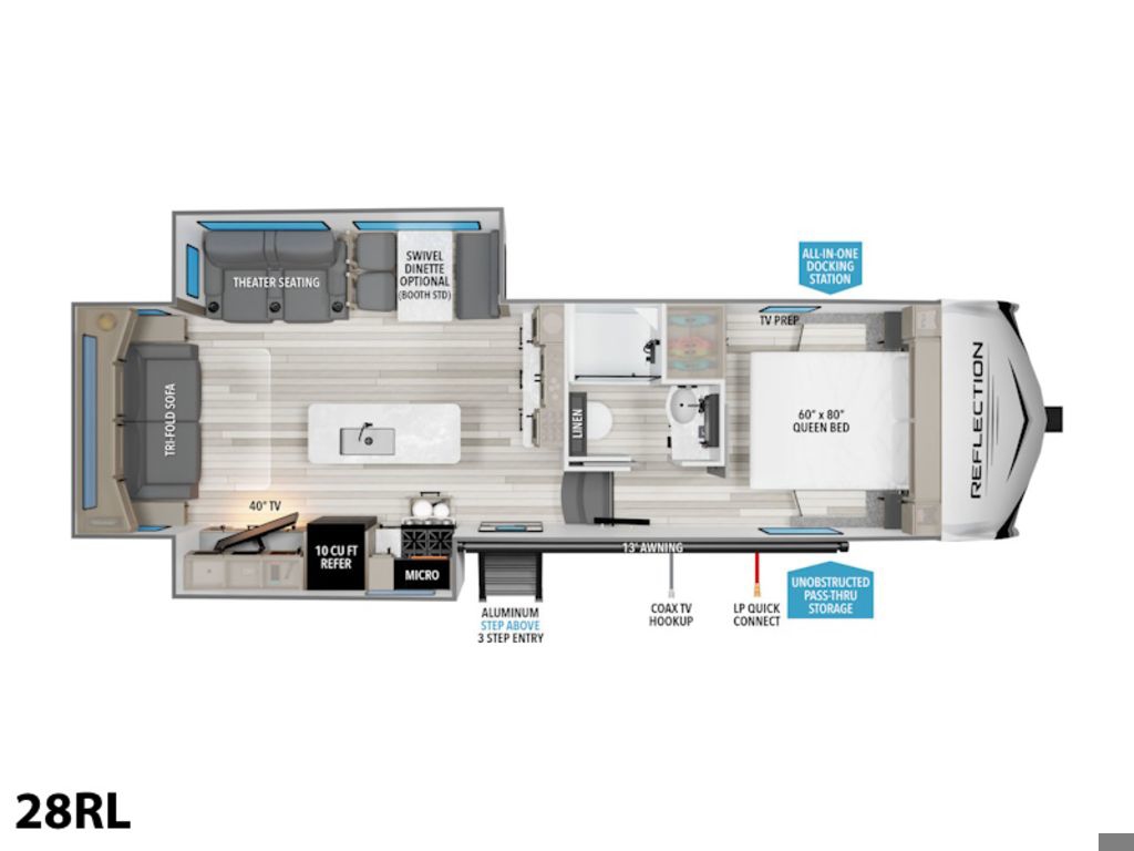 2025 Grand Design Reflection 100 28RLThe Perfect Union of Luxury and Value!Reflecting a perfect union of luxury and value, the Reflection 100 Series takes the half-ton towable fifth-wheel RV experience to unprecedented levels. Engineered with meticulous attention to the towing capacities of today's half-ton trucks, these RVs ensure safe and effortless towing, allowing you to navigate with reassuring stability and power. Despite their competitive pricing, they astonish with the wealth of high-end features packed inside. Your on-road living experience is enriched by a kitchen fitted with premium appliances that seamlessly blend with the elegance of a residential-styled interior. The interiors are resplendently spacious, mirroring the comfort and style of a modern home, making your travels not merely journeys but a mobile extension of your home life. In the Reflection 100 Series, we've fused affordability with an unparalleled level of comfort to enhance your adventures on the road.Features may include:Exterior80% Tint Radius Safety Glass WindowsBattery Kill Switch in Pass Thru Storage Area30 lbs LP Bottles (2)30" Radius Entry DoorOutside ShowerFactory Installed Roof LadderExterior Cable Hookup (Sidewall)InteriorMatte Black Fixtures and HardwareHardwood Galley Slide Trim MoldingsSolid Hardwood Drawer FrontsLouvered Tread Steps to BedroomSolid Core Cabinet StilesPre-Drilled and Screwed CabinetryBall Bearing Full Extension Drawer GlidesLarge Panoramic Slide Room WindowsHeated Theater Seats w/LED Lights & Massage (Most Models)Premium Congoleum FlooringDuctless Flooring Throughout Living AreaResidential Style Window TreatmentLED Lighting with Motion Sensors (Key Areas) Features Include 1 Slide Ducted A/C Power Awning On Demand Water Heater 10 Cu. Ft. Refrigerator Arctic Package Power Leveling Jacks Aluminum Wheels Microwave Home Theatre LED TV LED Lighting Pleated Shades Free Standing Dinette Theatre Seating Trifold Sofa Fireplace Outside Shower Solar Panel 180 Watts Weight 8514 Lbs.