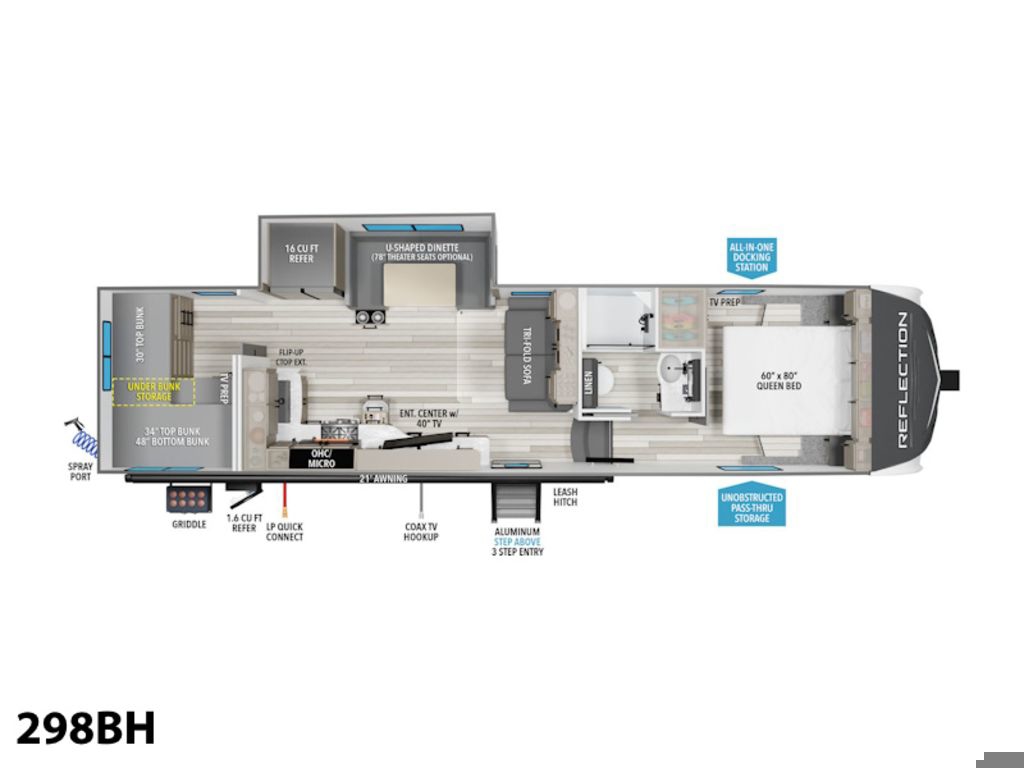 2024 Grand Design Reflection 150 298BHHalf-Ton Towable RedefinedThe Reflection 150 Series delivers maximum living and comfort without maxing out your truck. With floorplans starting under 7,000 pounds and 90-degree turning radius capabilities, you can tow in confidence with many of today's half-ton and short-bed trucks. The towability, spacious interior, and luxury features of the Reflection 150 Series are redefining what it means to be half-ton towable.Features may include:Exterior80% Tint Radius Safety Glass Windows90 Degree Turning Point Pin Box30 lbs LP Bottles (2)30" Radius Entry DoorOutside ShowerFactory Installed Roof LadderExterior Cable Hookup (Sidewall)InteriorMatte Black Fixtures and HardwareHardwood Galley Slide Trim MoldingsSolid Hardwood Drawer FrontsLouvered Tread Steps to BedroomSolid Core Cabinet StilesPre-Drilled and Screwed CabinetryBall Bearing Full Extension Drawer GlidesLarge Panoramic Slide Room WindowsHeated Wall Hugger Theater Seats w/LED Lights & Massage (Most Models)Premium Congoleum FlooringDuctless Flooring Throughout Living AreaResidential Style Window TreatmentBlackout Roller ShadesLED Lighting with Motion Sensors (Key Areas) Features Include 1 Slide Ducted A/C Power Awning On Demand Water Heater 16 Cu. Ft. refrigerator Arctic Package Quad Bunks Power Leveling Jacks Aluminum Wheels Microwave Home Theatre LED TV Fantastic Fan LED Lighting Roller Shades U-Shaped Dinette Trifold Sofa Outside Shower Outside Kitchen Ouside Speakers Solar Panel 165 Watts Weight 8934 Lbs