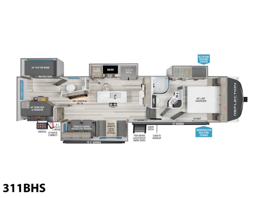 2024 Grand Design Reflection FW 311BHSA Celebration of Luxury, Value and TowabilityThe Grand Design Reflection combines luxury, value, and towability in one amazing package. Grand Design's commitment to exceeding customer expectations in quality and service has quickly made the Reflection a top-selling name in North America. If you want the best in class, you found it.Slow down in no time flat.The Grand Design Reflection combines luxury, value, and towability in one amazing — best-in-class — package. The quality and service you have come to expect from Grand Design have made the Reflection a tried, true and trusted name in North America.Features may include:Exterior80% Tint Radius Safety Glass WindowsExtended Pin Box30 lbs LP Bottles (2)30" Radius Entry DoorOutside ShowerFactory Installed Roof LadderStep-Above with Lift-Assist Entry StepsLP Quick Connect6' Coiled Break Away CableUnobstructed Pass Thru Storage"One Touch" Electric LED AwningInteriorResidential Hardwood Cabinet DoorsSolid Hardwood Drawer FrontsLouvered Tread Steps to BedroomSolid Core Cabinet StilesPre-drilled and Screwed CabinetryBall Bearing Full Extension Drawer GlidesTri-Fold Hide-A-Bed Sofa Large Panoramic Slide Room WindowsPremium Congoleum FlooringDuctless Flooring Throughout Living AreaResidential Style Window TreatmentsBlackout Roller Shade Window CoveringWall Hugger Theater SeatsResidential Booth DinetteSolid Surface Countertops & Sink Covers Features Include 4 Slides Ducted A/C Power Awning On Demand Water Heater 16 Cu. Ft. refrigerator Arctic Package Mor-Ryde Suspension Power Leveling Jacks Gel-Coat 16" Aluminum Wheels Microwave Stereo LED Tv LED Lighting Fantastic Fan Roller Shades Solid-Surface CounterTops Theatre Seating Trifold Sofa Outside Shower Outside Kitchen Outside Speakers Solar Panel 370 Watts Weight 11,700 Lbs