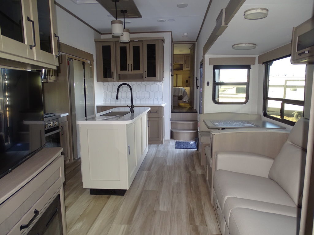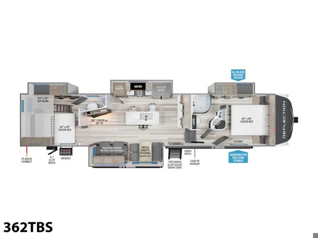 2024 Grand Design Reflection FW 362TBSA Celebration of Luxury, Value and TowabilityThe Grand Design Reflection combines luxury, value, and towability in one amazing package. Grand Design's commitment to exceeding customer expectations in quality and service has quickly made the Reflection a top-selling name in North America. If you want the best in class, you found it.Slow down in no time flat.The Grand Design Reflection combines luxury, value, and towability in one amazing — best-in-class — package. The quality and service you have come to expect from Grand Design have made the Reflection a tried, true and trusted name in North America.Features may include:Exterior80% Tint Radius Safety Glass WindowsExtended Pin Box30 lbs LP Bottles (2)30" Radius Entry DoorOutside ShowerFactory Installed Roof LadderStep-Above with Lift-Assist Entry StepsLP Quick Connect6' Coiled Break Away CableUnobstructed Pass Thru Storage"One Touch" Electric LED AwningInteriorResidential Hardwood Cabinet DoorsSolid Hardwood Drawer FrontsLouvered Tread Steps to BedroomSolid Core Cabinet StilesPre-drilled and Screwed CabinetryBall Bearing Full Extension Drawer GlidesTri-Fold Hide-A-Bed Sofa Large Panoramic Slide Room WindowsPremium Congoleum FlooringDuctless Flooring Throughout Living AreaResidential Style Window TreatmentsBlackout Roller Shade Window CoveringWall Hugger Theater SeatsResidential Booth DinetteSolid Surface Countertops & Sink Covers Features Include 4 slides Ducted A/C Power Awning On Demand Water Heater 16 Cu. FT. Refrigerator Arctic Package Bunks Mor-Ryde Suspension Power Leveling Jacks Gel Coat 16" Aluminum Wheels Microwave Stereo LED TV LED Lighting Fantastic Fan roller Shades Solid-Surface CounterTops Theatre Seating Fireplace Outside Shower Outside Kitchen Outside Speakers Solar Panel 370 watts Weight 12,500 Lbs