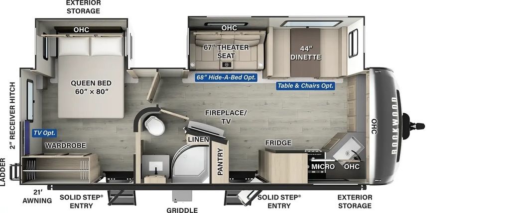 2024 Forest River Rockwood Ultra Lite 2608BSRockwood Ultra Lite Travel TrailersPREPARE TO BE ENCHANTED BY OUR VERSATILE FLOOR PLANS. Our trailers are packed full of quality features in order to bring to you one of the best values in the light weight market. There are spacious flush floor slides, comfortable stylish sofas and wide dinettes for you and guests to gather around. The Ultra Lite series extends an invitation to indulge in generous space and deluxe amenities, most while remaining towable by a half-ton vehicle.Holy counter space! This front kitchen offers a ton of counter space with a giant window to enhance the camping experience. The 67" theater seating is conveniently located right in front of the entertainment center and the cozy space heating fireplace. The master bedroom offers a big 60"x 80" queen bed slide out which makes the room feel residential. This bedroom has a separate entry and exit door that is also covered by the giant 21' awning.Features may include:ExteriorHigh Gloss Front CapPower Awning w/ Adjustable Rain Dump & LED LightingTinted Frameless WindowsSlam Latches & Magnetic Compartment Door CatchesCable & Satellite HookupExterior Battery Disconnect SwitchSide Solar PrepOutside Griddle w/ LP Hook UpFriction Hinge Entrance Door with Window Shade & ScreenShot Screen DoorLarge, Foldable Grab Handles (All Entrance Doors)Outside Antifreeze StationBlack Tank Flush360 Siphon Vent Cap On All Black TanksSolid Entry, Strut Assist Fold Out Entry StepsOutside SpeakersKeyed Alike LocksPower Stabilizer JacksAutomotive WindshieldRear Ladder2" Accessory HitchLaminated White Fiberglass Sidewalls200W Roof Solar Panel with 1800W InverterOutside Spray PortAIR 360+ OMNIDIRECTIONAL ANTENNA / WITH WIFI PREPInteriorAutumn Wood CabinetryScrewed & Glued, Solid Wood Cabinet Doors & Drawers With Hidden Hinges, Metal Drawer Glides & Residential Hardware35K BTU FurnaceCarbon Monoxide DetectorInterior 12V USB OutletOneControl Panel with WeRV App Control55 AMP Converter with ChargerCeiling LED 12V Interior LightingQuick Recovery Water Heater w/ Interior Gas/Electric Switches50 Amp Service and Digital Dual Thermostat Control15,000 BTU Ducted Air ConditionerSedona Wood CabinetryNight Roller Shade