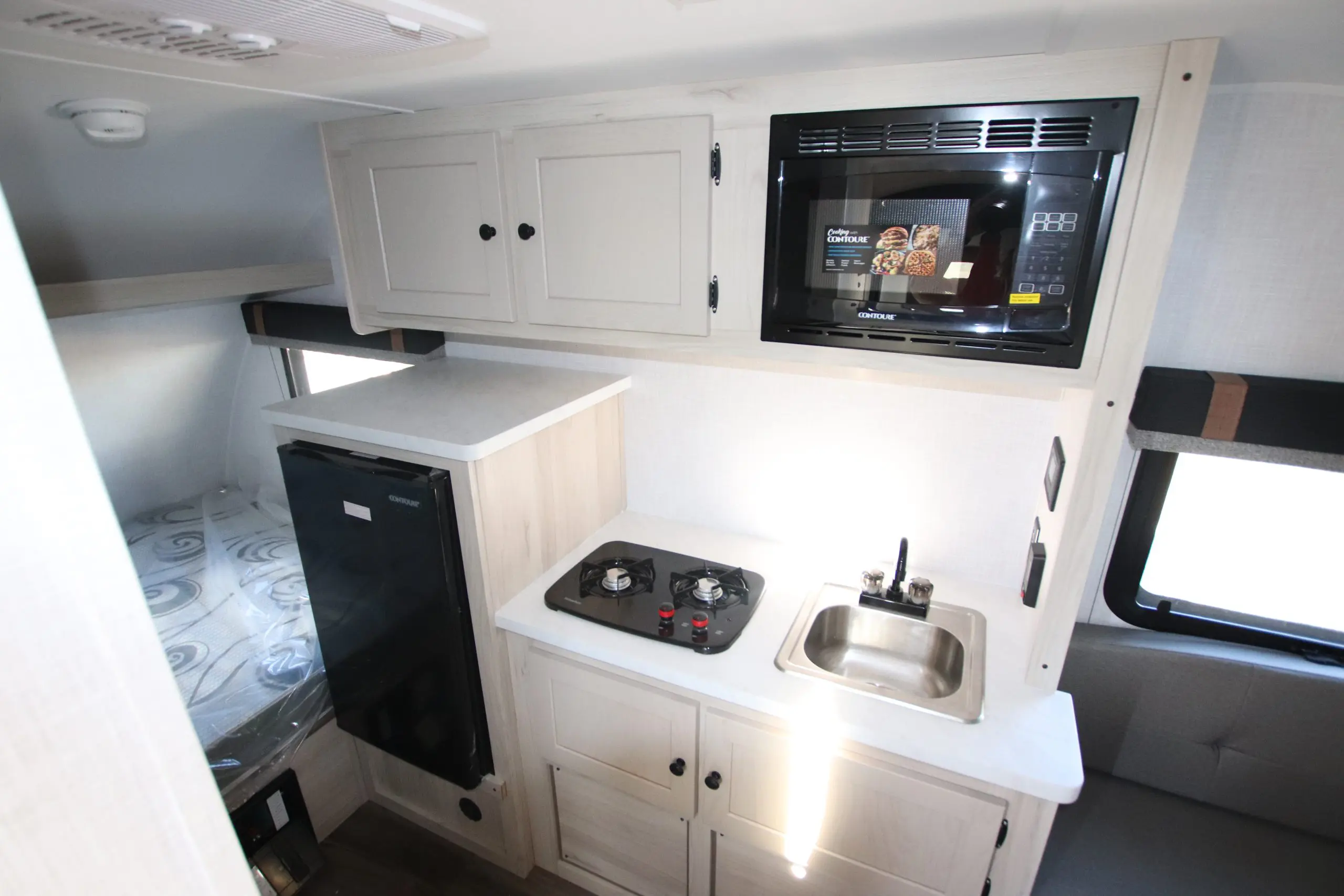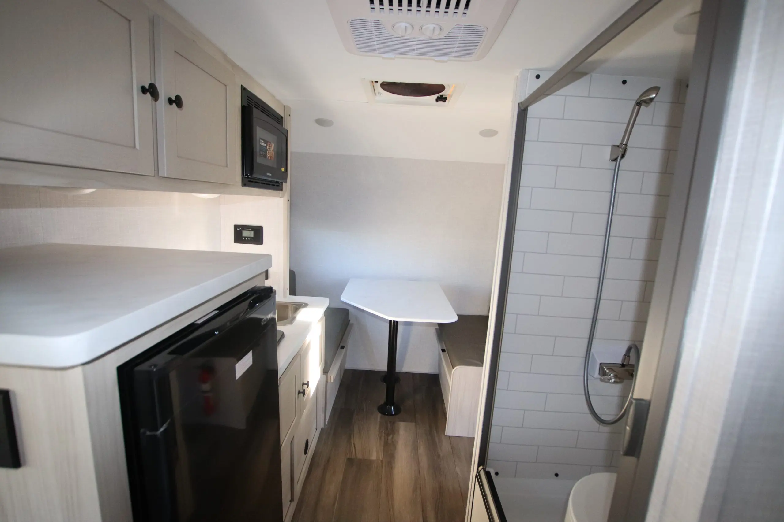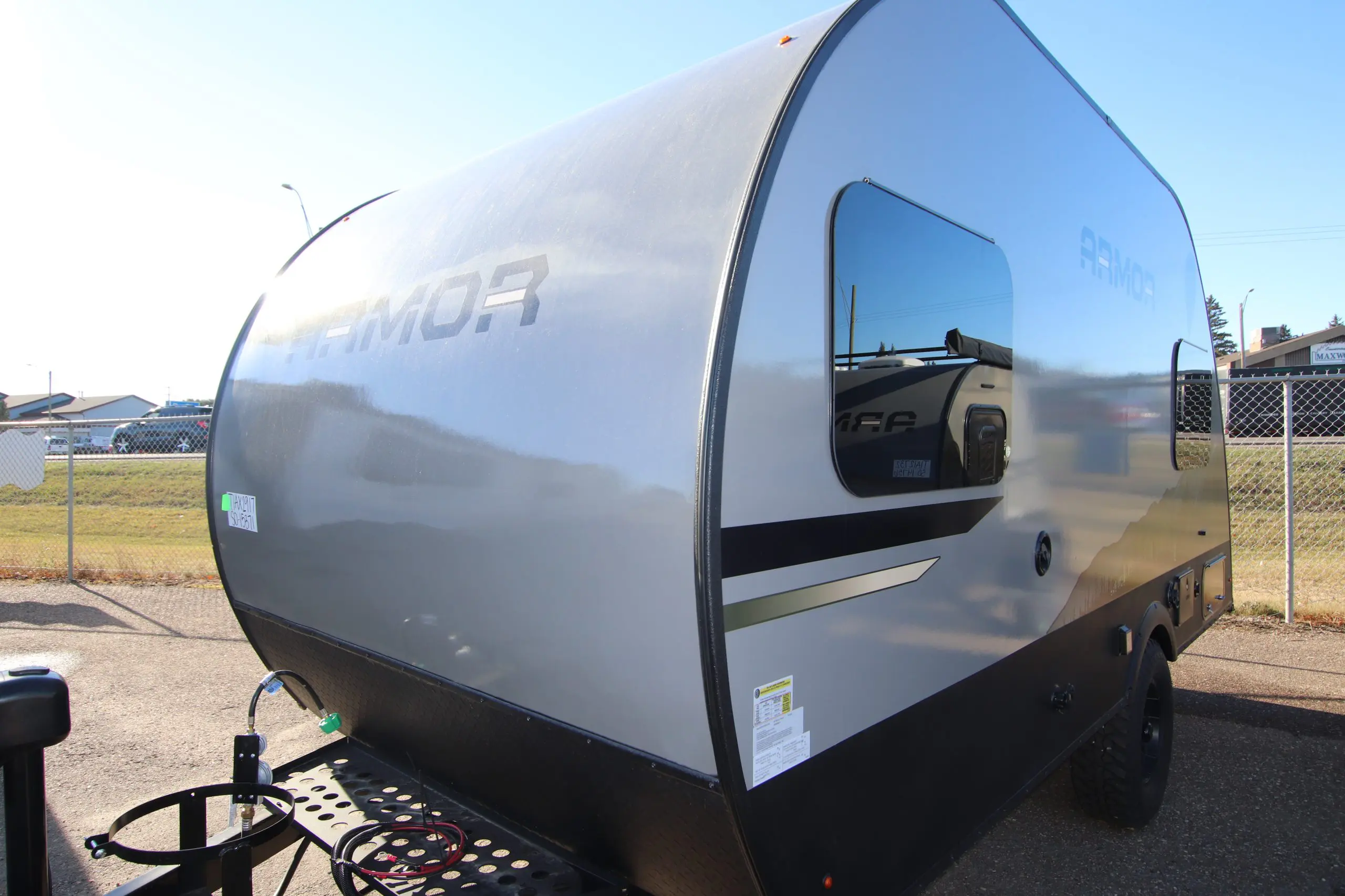If you want extra space without giving up the freedom of a lightweight trailer, the Armor17 LTX might be your perfect match. A cozy queen bed in the rear offers a restful retreat after a day of adventure, with a handy overhead shelf for books and travel gear. The wet bath features a retractable door for added elbow room, while the two-burner cooktop and microwave make whipping up breakfast a breeze. You’ll also find a 12V fridge ready to keep your food fresh and drinks cold.