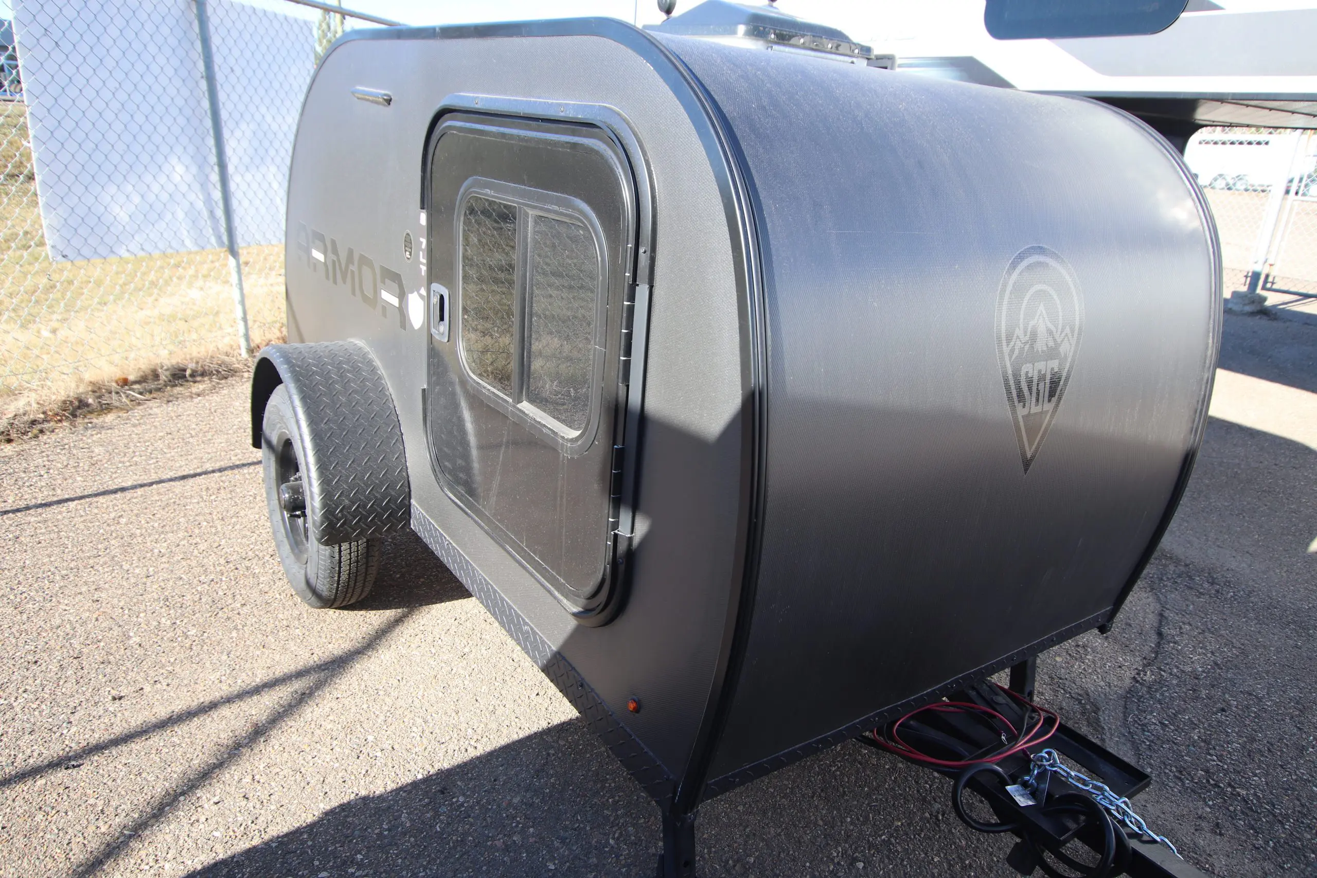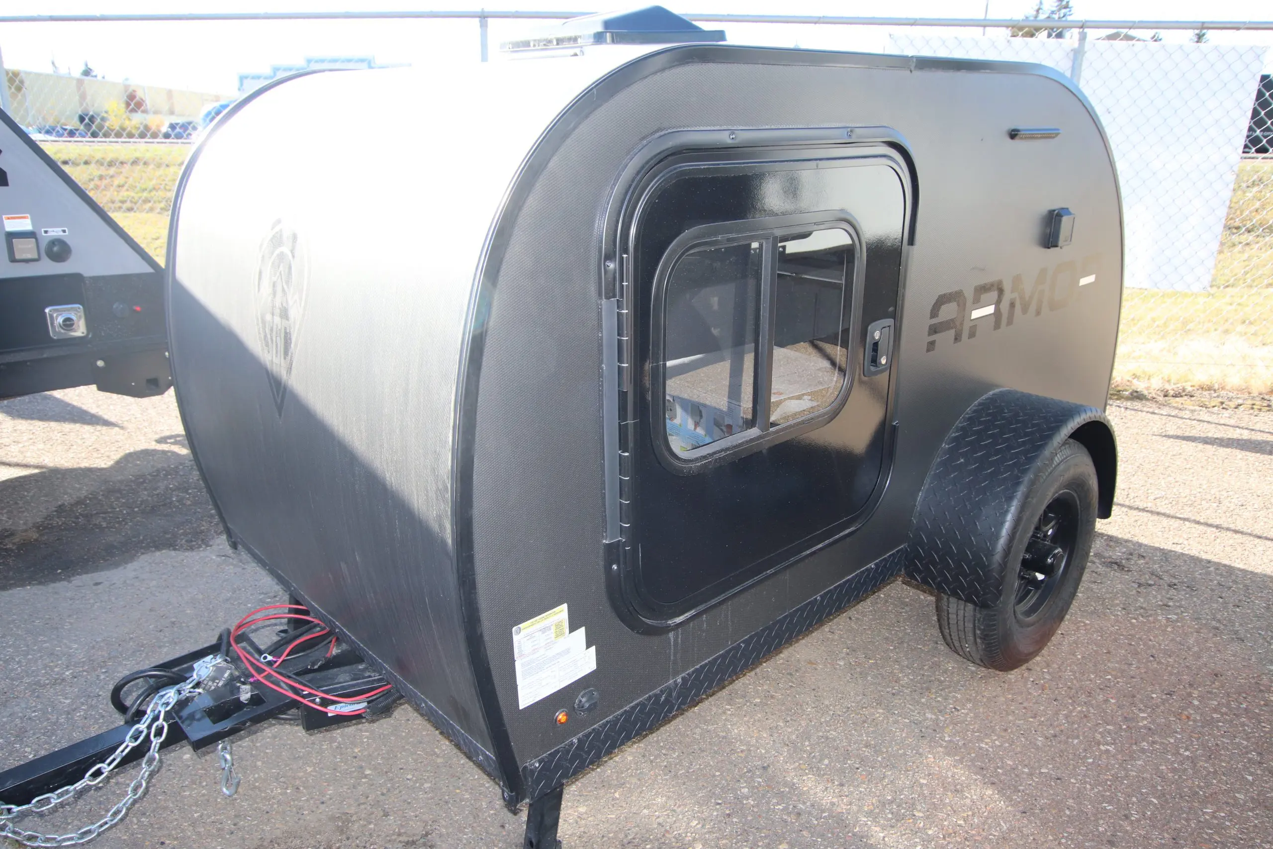 The Armor LT teardrop trailer by Skinny Guy Campers is your overland adventure camper! A Torsion-Flex 1,100 lb. independent suspension axle with electric brakes and max-clearance will help make towing easier than ever. There is welded, aluminum framed, main coach-body construction, a glass egress window, and an ultra spacious outside storage compartment. You will also find an RV and cycle swivel hitch and a 30-amp converter with a 30′ detachable, easy-store power cord for hassle-free set up.
