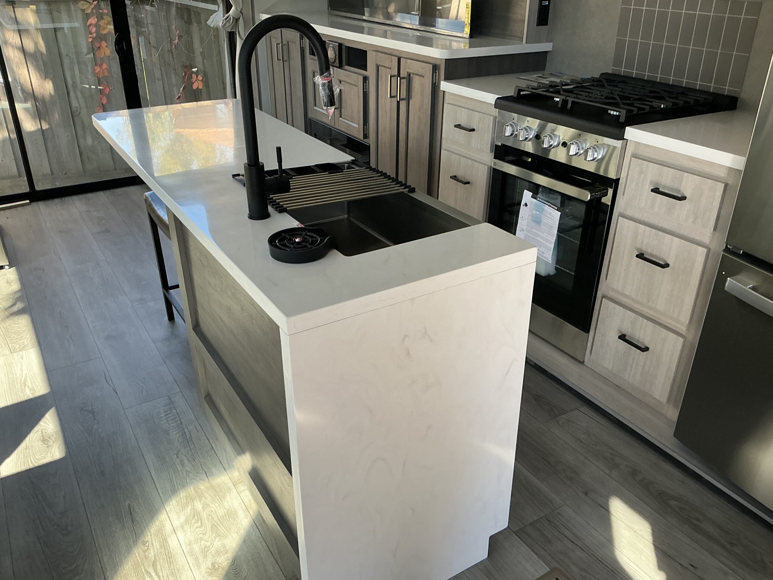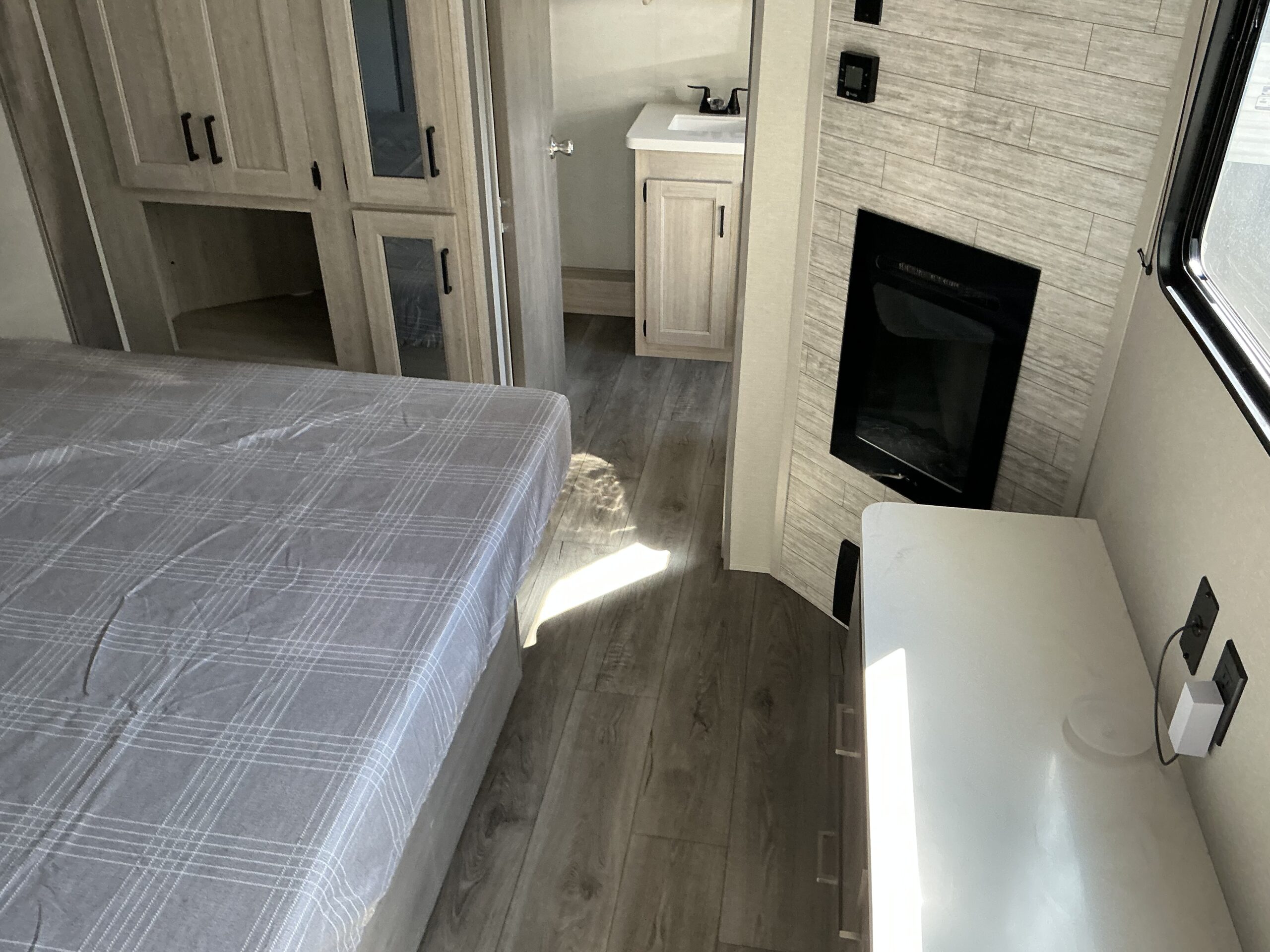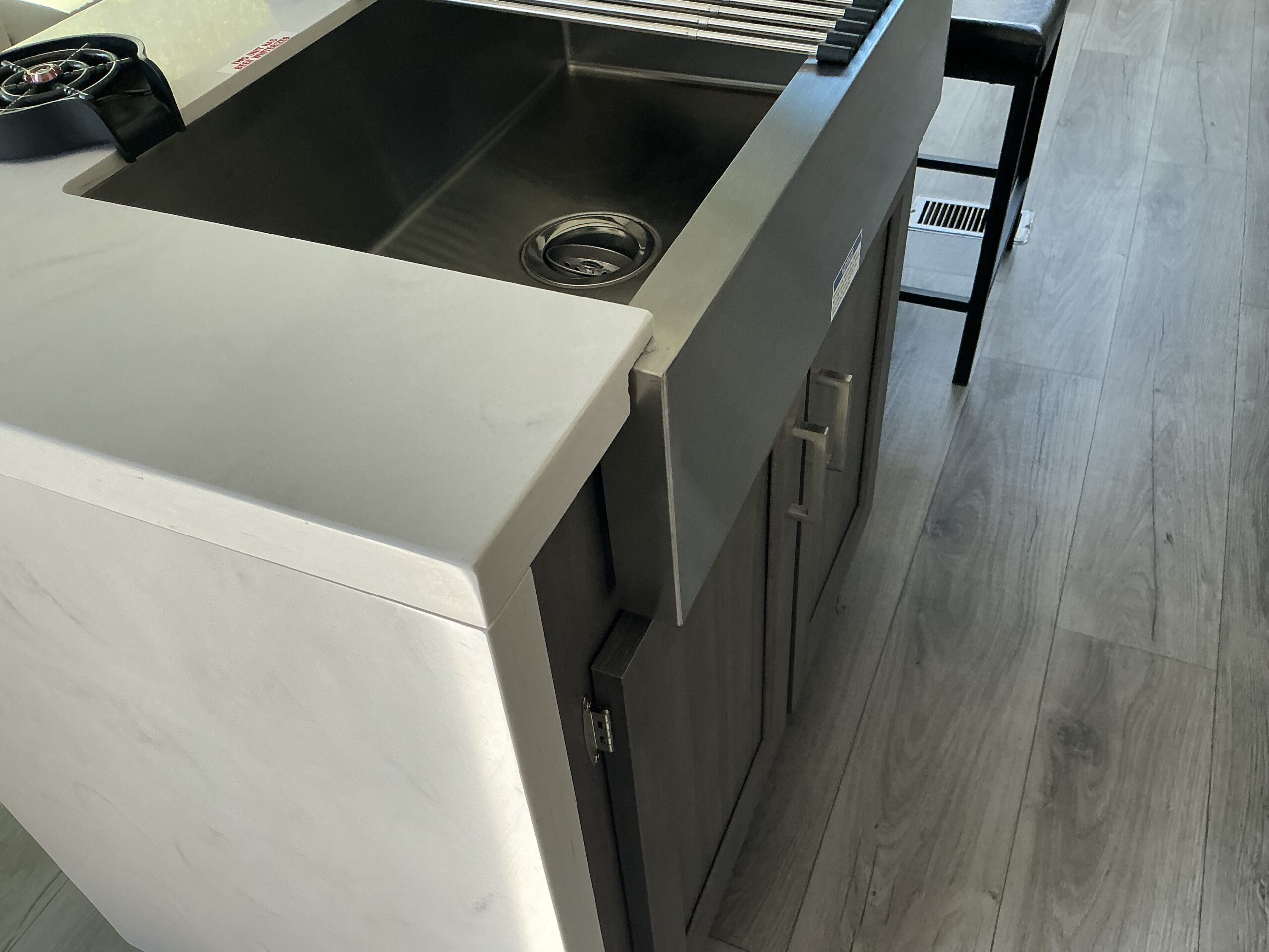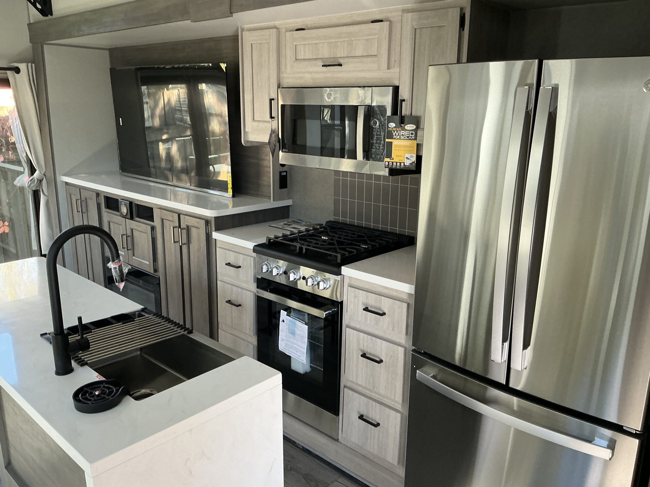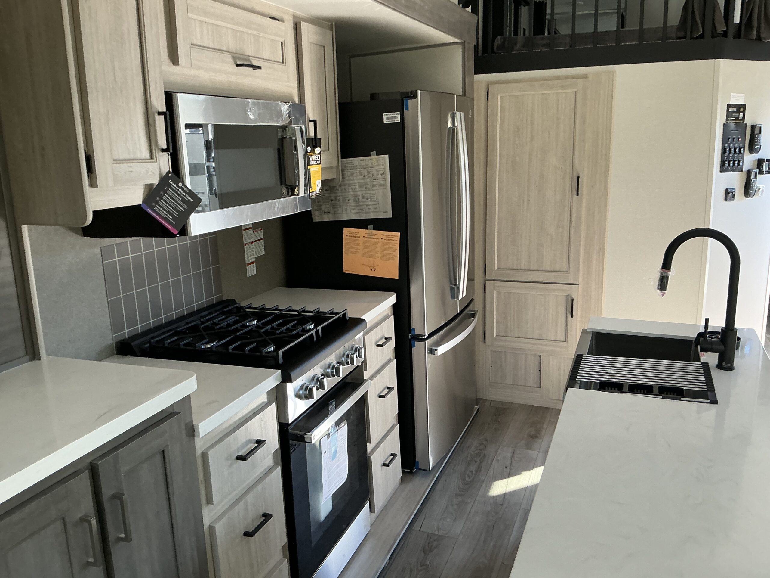 There is much to love about this destination trailer! Starting with the loft that has two queen beds, a wardrobe/storage, and a custom 58″ x 71″ bed. Downstairs there’s a private bedroom with a king bed slide, a fireplace, and its very own private full bathroom complete with a dual sink vanity. The main living area has a huge bi-fold sleeper sectional sofa so you can fit even more guests, or just relax and watch the TV on the power lift in the entertainment center. The kitchen is well-equipped with a residential refrigerator, microwave, and pantry. The centerpiece here is a kitchen island with a deep basin farm-style sink and bar stool seating so your group can gather together and make new memories. The second full bath has a roomy 36″ x 30″ shower with glass door, and just outside it is the stackable washer and dryer!