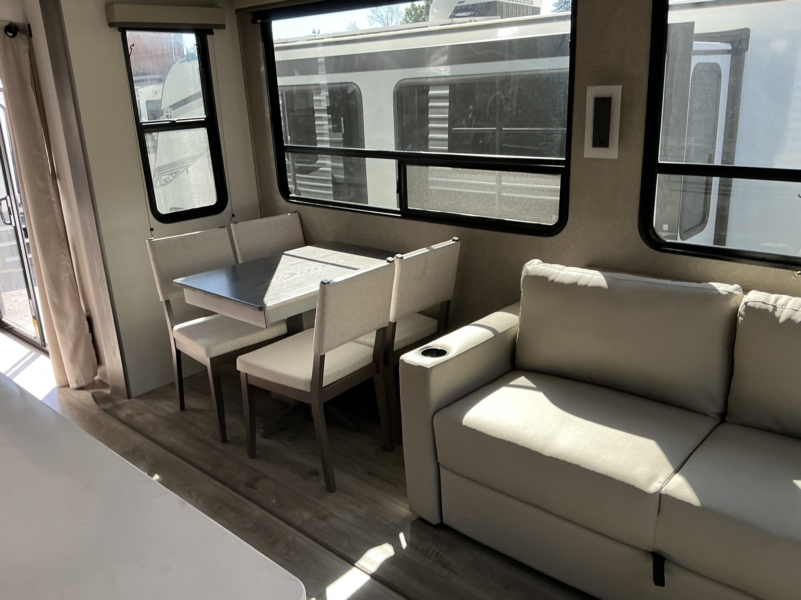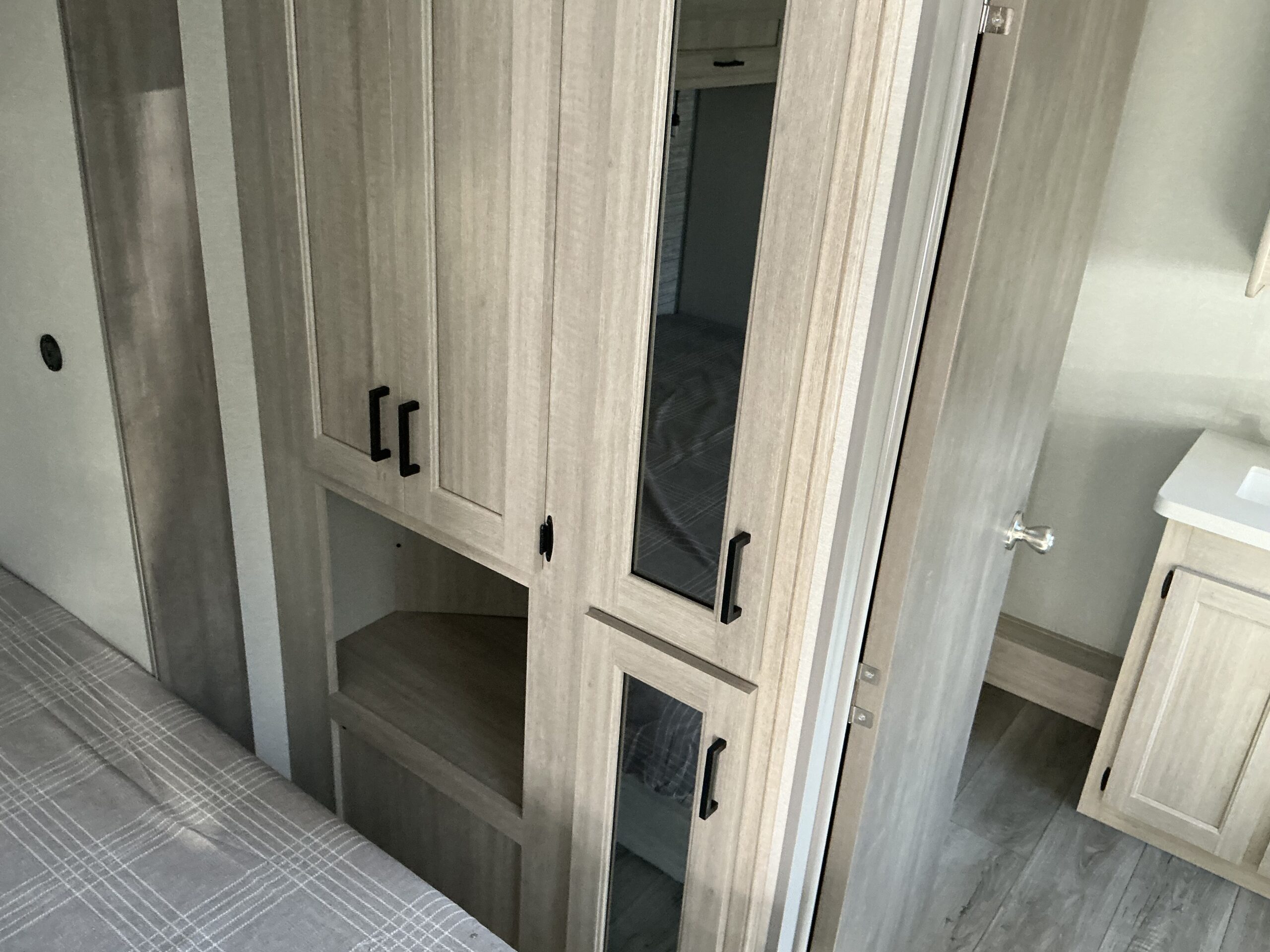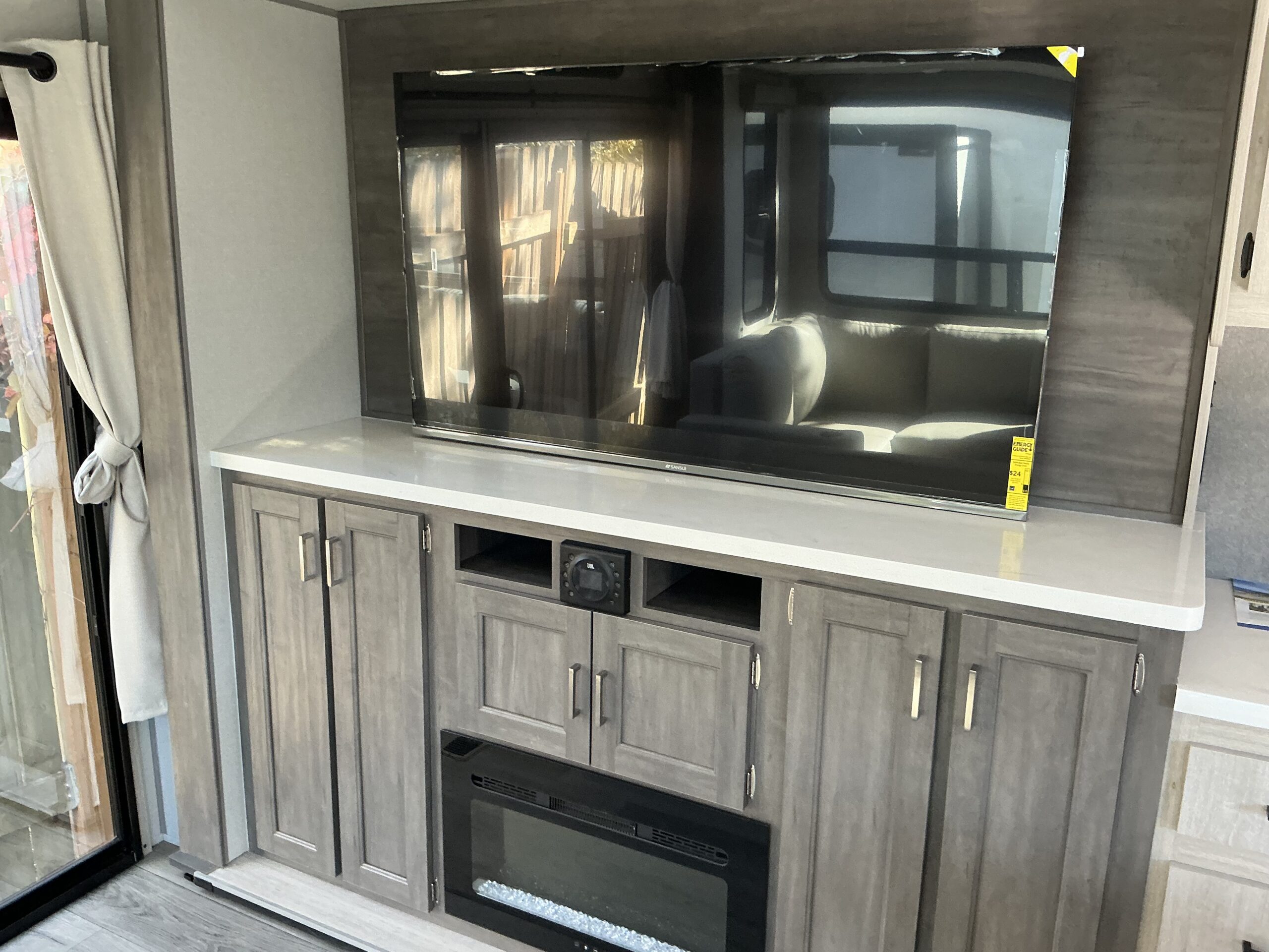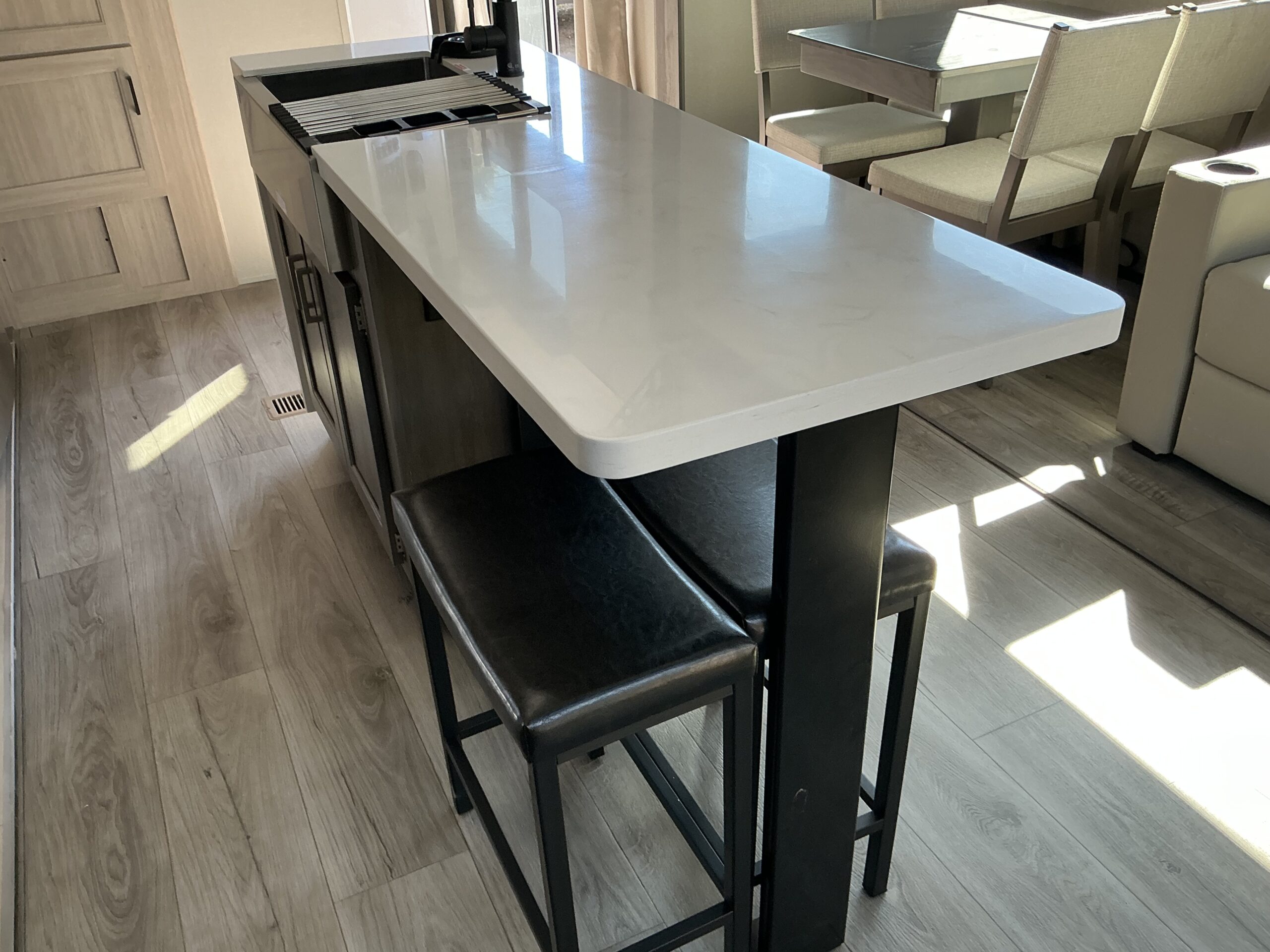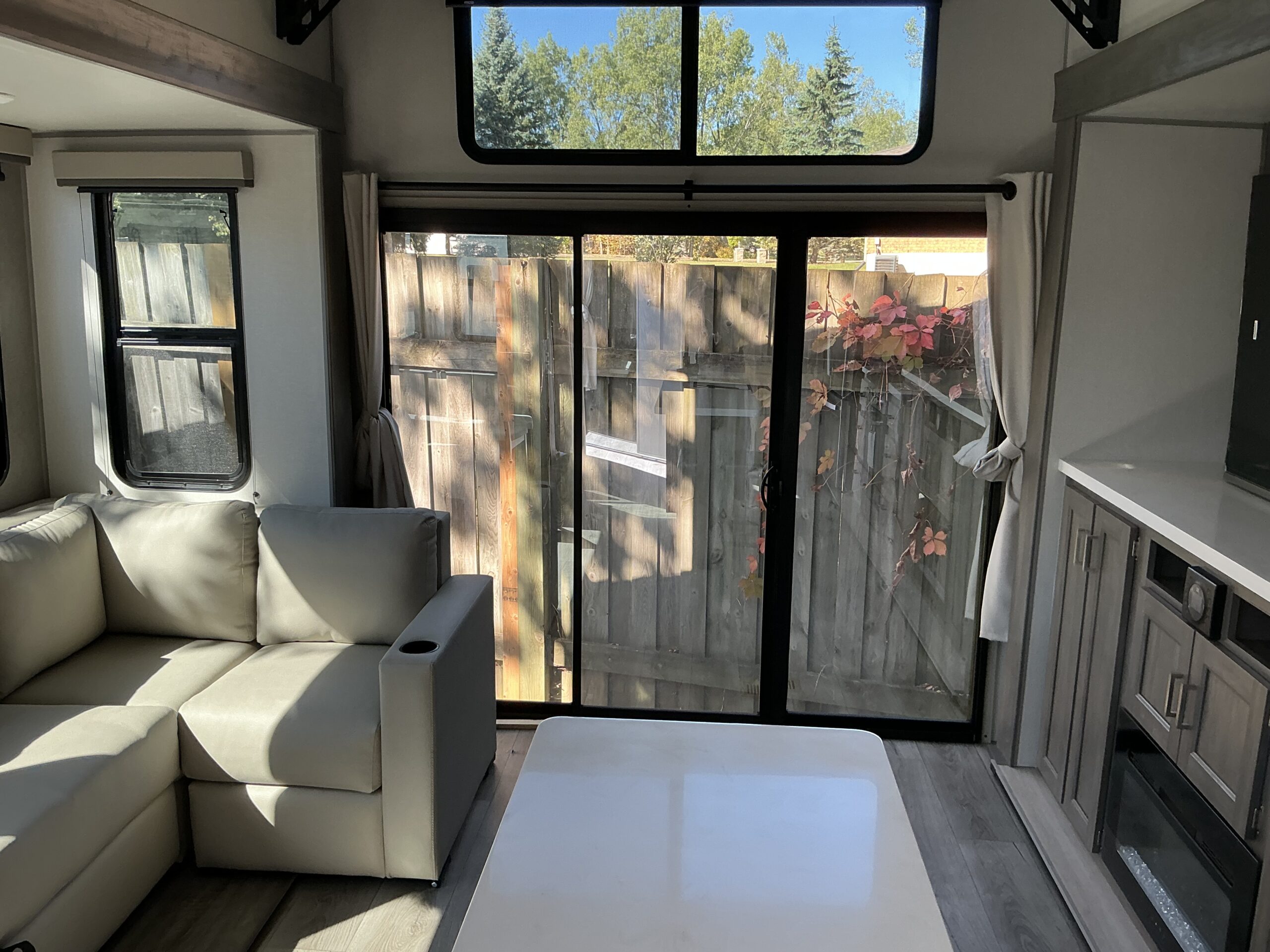 There is much to love about this destination trailer! Starting with the loft that has two queen beds, a wardrobe/storage, and a custom 58″ x 71″ bed. Downstairs there’s a private bedroom with a king bed slide, a fireplace, and its very own private full bathroom complete with a dual sink vanity. The main living area has a huge bi-fold sleeper sectional sofa so you can fit even more guests, or just relax and watch the TV on the power lift in the entertainment center. The kitchen is well-equipped with a residential refrigerator, microwave, and pantry. The centerpiece here is a kitchen island with a deep basin farm-style sink and bar stool seating so your group can gather together and make new memories. The second full bath has a roomy 36″ x 30″ shower with glass door, and just outside it is the stackable washer and dryer!