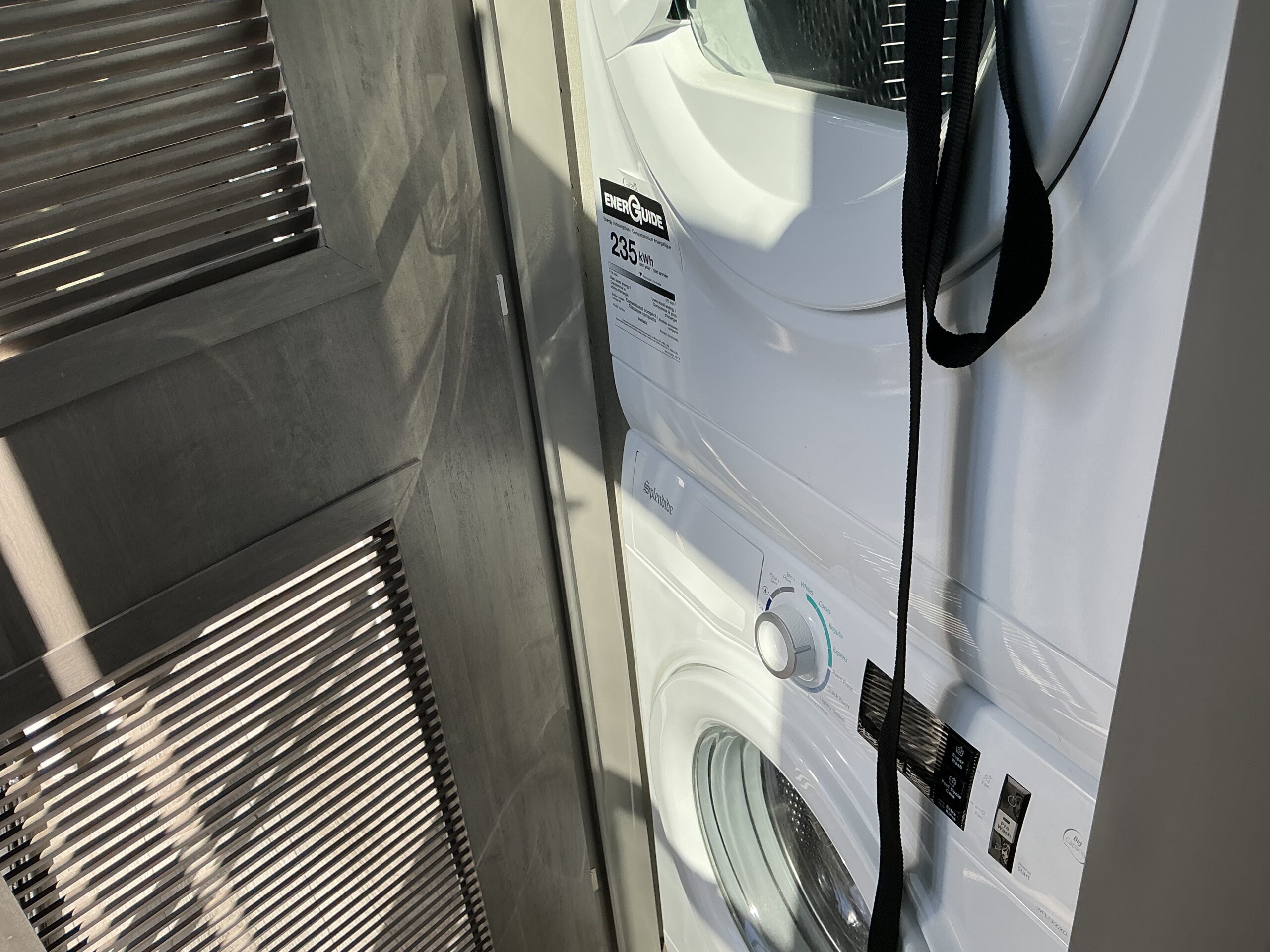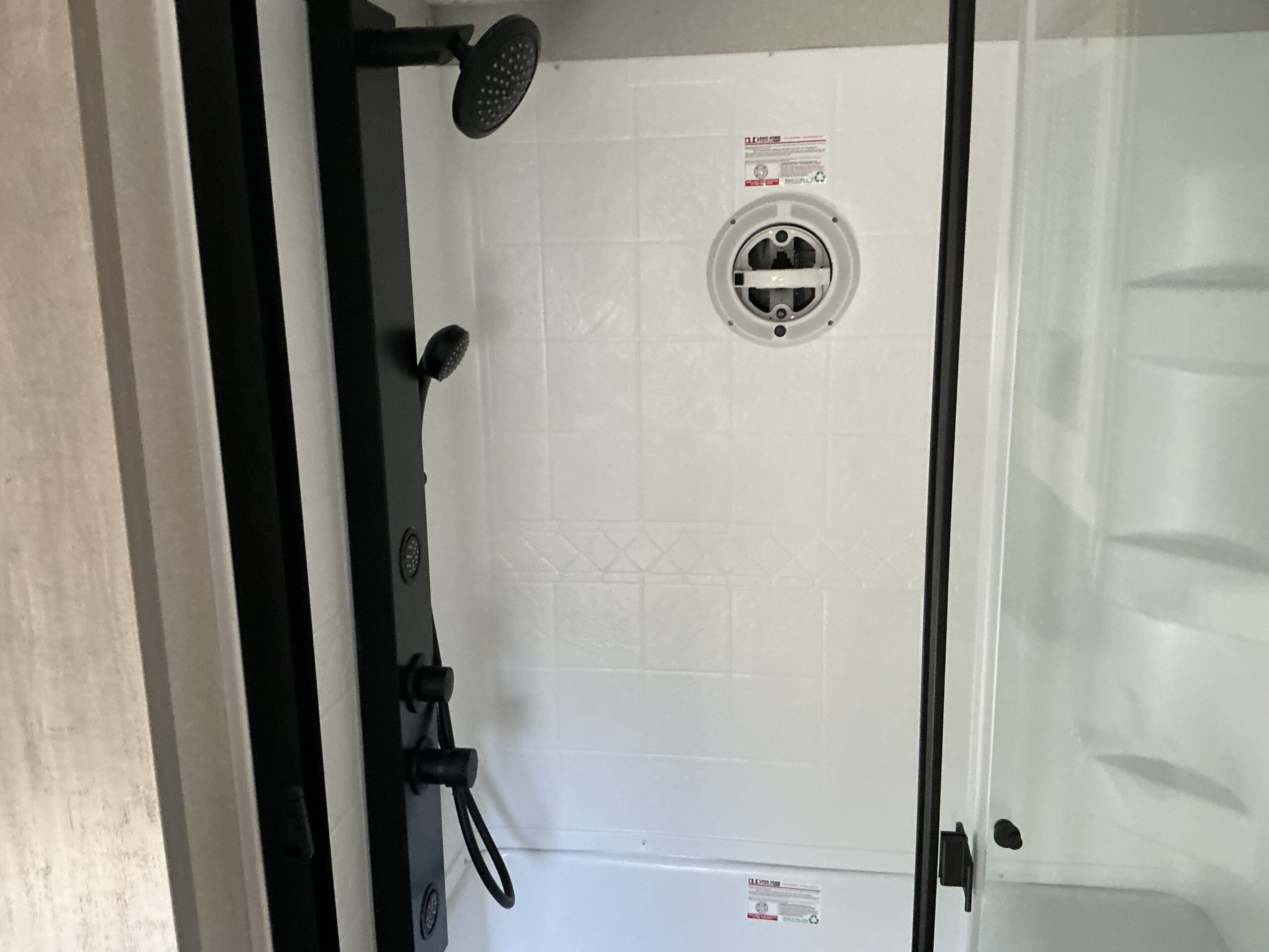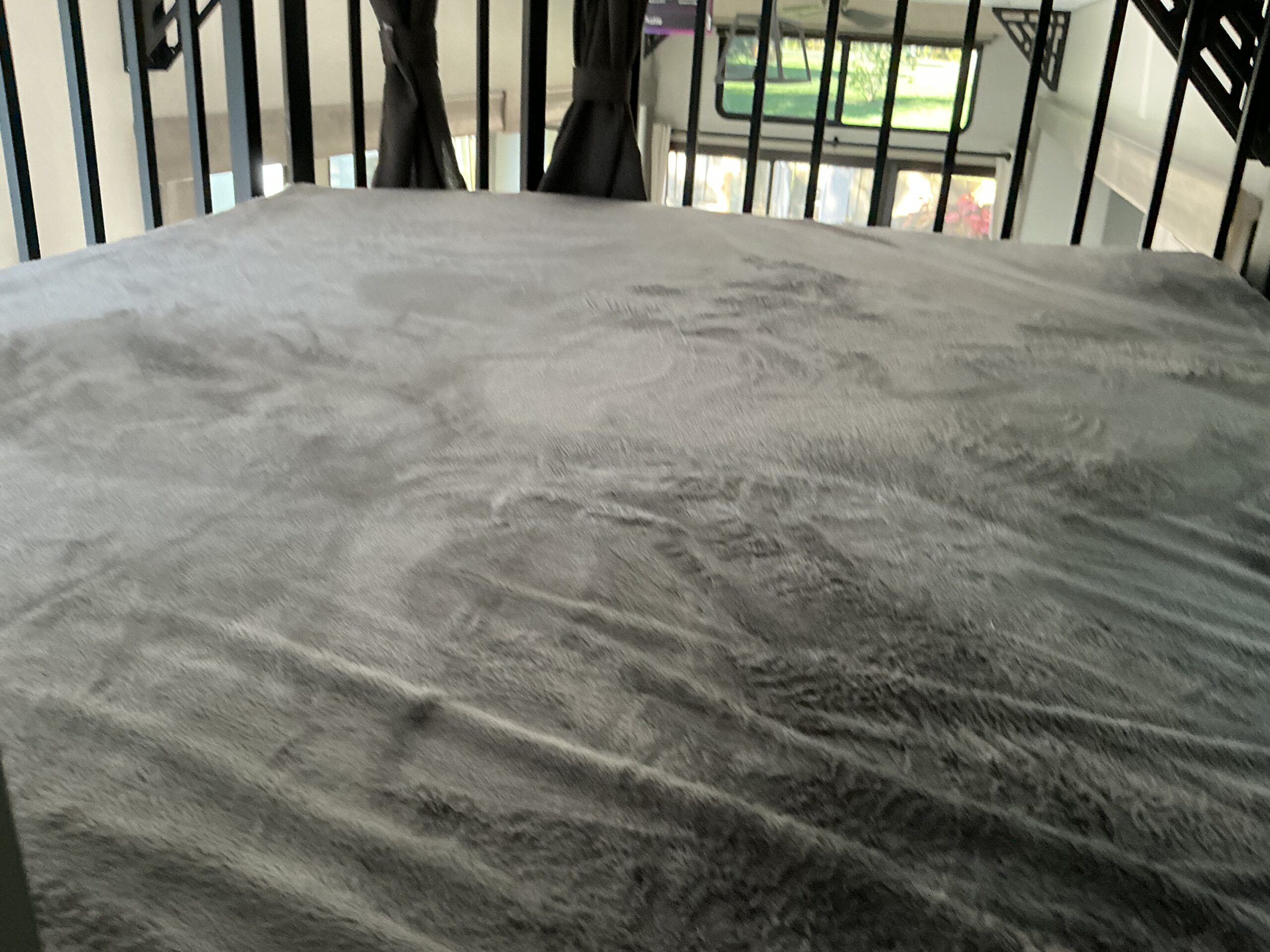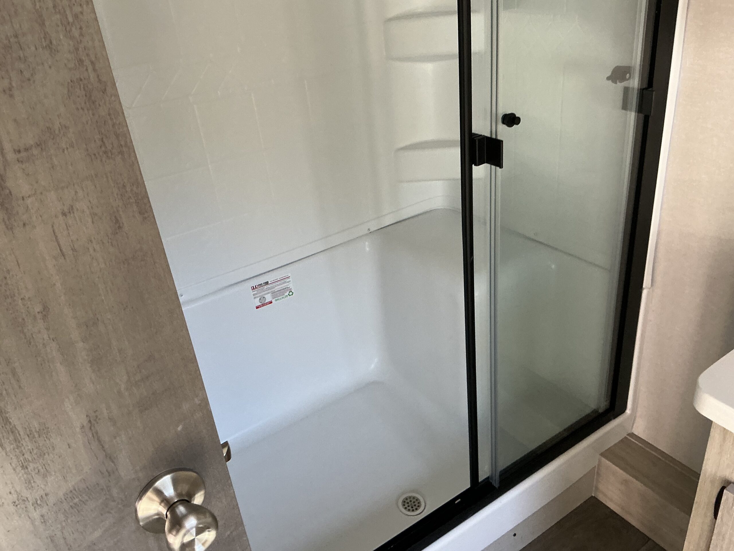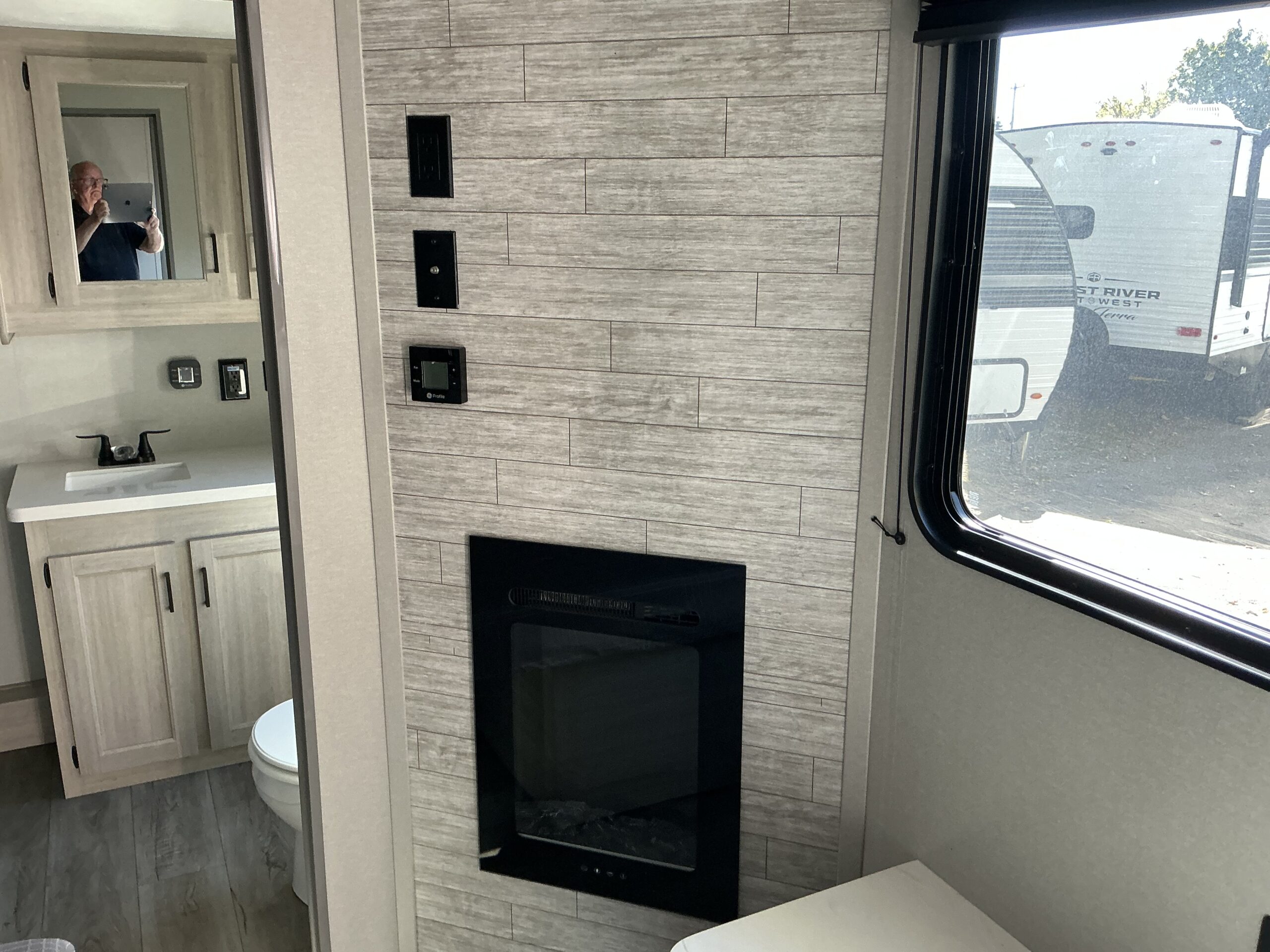 There is much to love about this destination trailer! Starting with the loft that has two queen beds, a wardrobe/storage, and a custom 58″ x 71″ bed. Downstairs there’s a private bedroom with a king bed slide, a fireplace, and its very own private full bathroom complete with a dual sink vanity. The main living area has a huge bi-fold sleeper sectional sofa so you can fit even more guests, or just relax and watch the TV on the power lift in the entertainment center. The kitchen is well-equipped with a residential refrigerator, microwave, and pantry. The centerpiece here is a kitchen island with a deep basin farm-style sink and bar stool seating so your group can gather together and make new memories. The second full bath has a roomy 36″ x 30″ shower with glass door, and just outside it is the stackable washer and dryer!