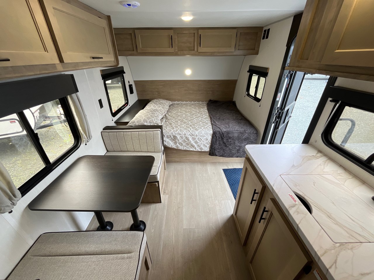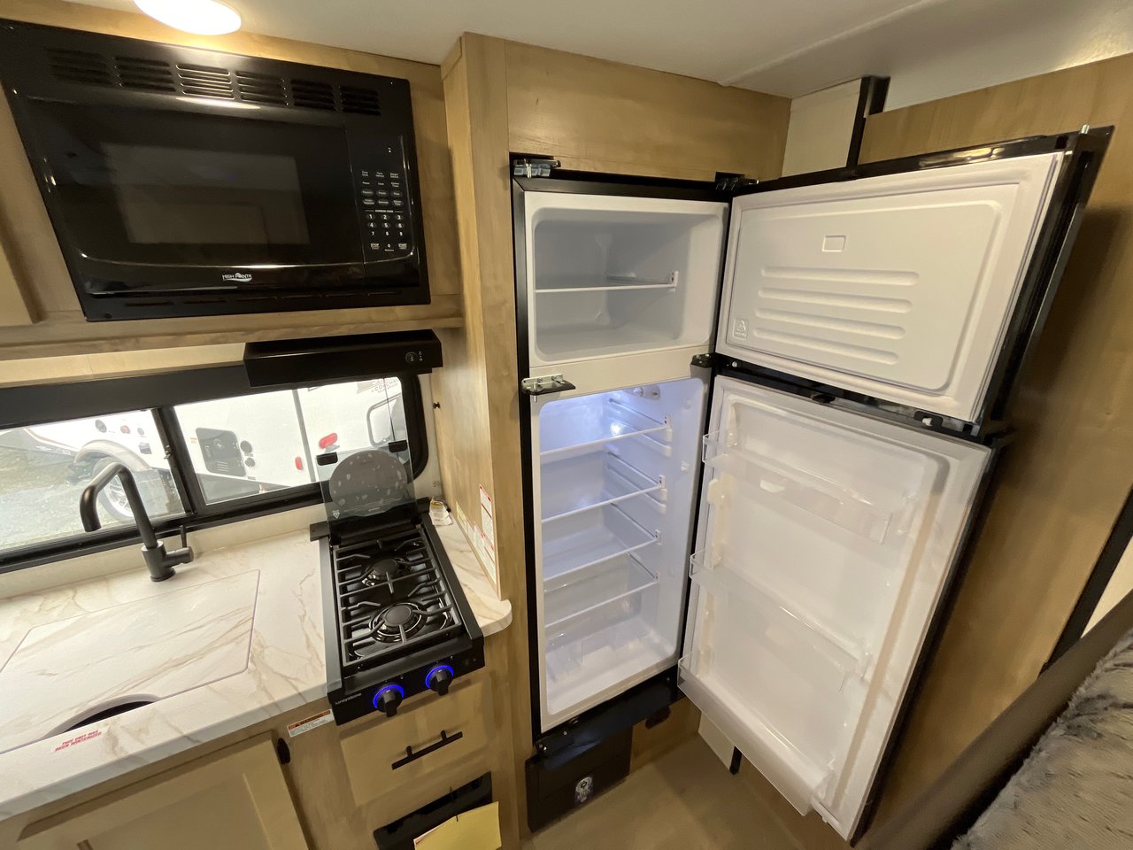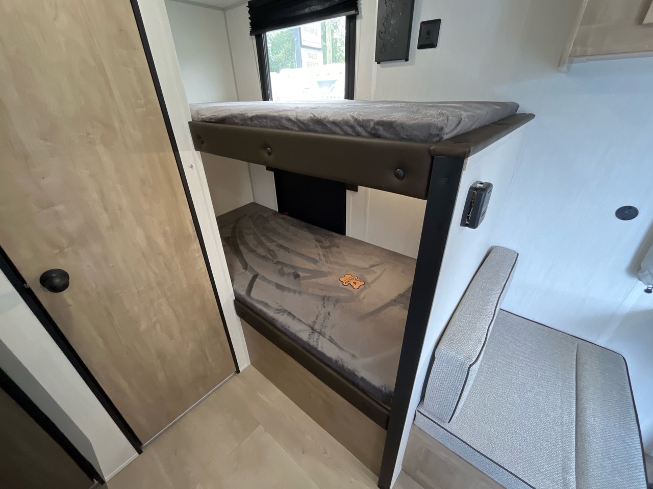 This family-friendly trailer offers comfort, functionality, and plenty of space for your next adventure! It features a large kitchen with a flush-mount glass cooktop, huge sink, ample counter space, and a 10.3 cu. ft. double-door refrigerator. Storage is abundant throughout, including a large exterior pack-and-play door for easy access to storage under the bottom bunk.