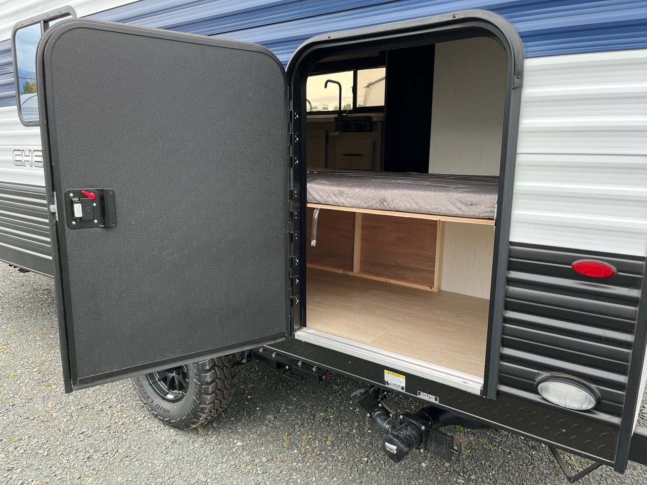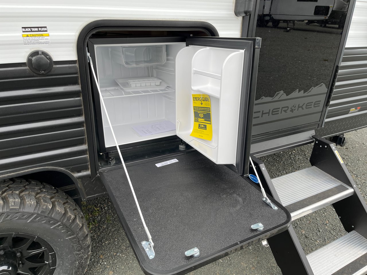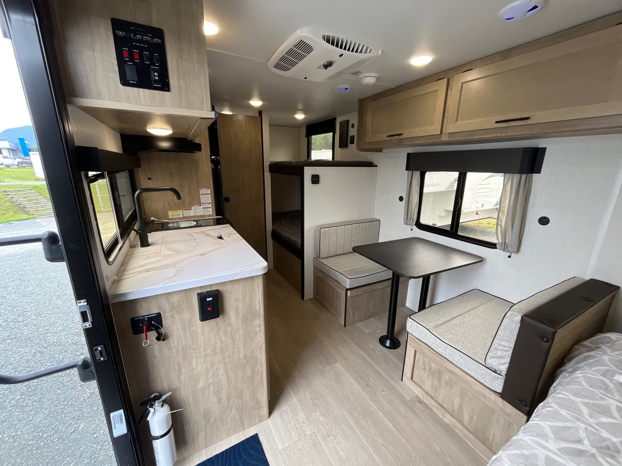 This family-friendly trailer offers comfort, functionality, and plenty of space for your next adventure! It features a large kitchen with a flush-mount glass cooktop, huge sink, ample counter space, and a 10.3 cu. ft. double-door refrigerator. Storage is abundant throughout, including a large exterior pack-and-play door for easy access to storage under the bottom bunk.