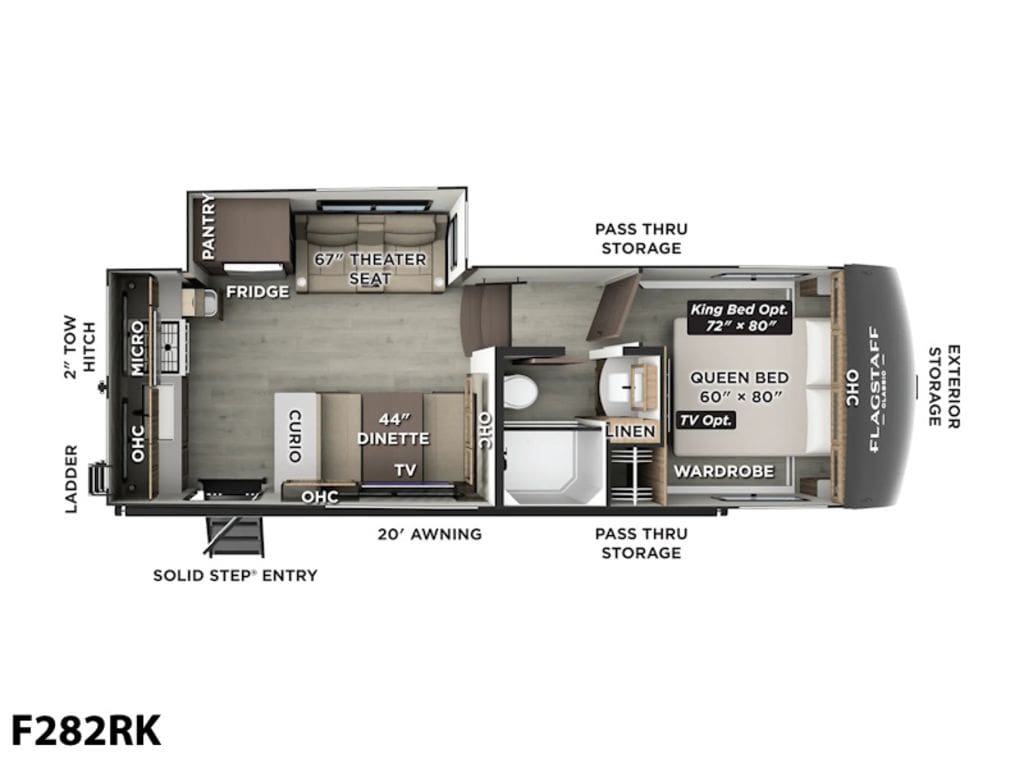ON ORDER – ARRIVING FALL 2025 2026 Forest River Classic Fifth Wheels F282RKWHEN YOU WISH TO UPGRADE YOUR CAMPING EXPERIENCE, EMBRACE OUR CLASSIC LINE OF 5TH WHEELS. Elevate your journey with the quintessence of Flagstaff's first-in-class quality and exceptional craftsmanship, now augmented by a host of supplementary features to enrich your journey. Anticipate superior offerings such as king-sized beds, effortless electric auto-leveling, shielded metal awning covers, exquisite upgraded solid-surface countertops, and the luxury of residential soft-close drawers. Every Classic 5th wheel now comes with an option for our power package, propelling you to destinations you once deemed beyond reach.Features may include:200W Solar Panel with 30 AMP Charge ControllerBack-Up Camera PrepMaxxair Fan with CoverWinegard Air 360+ Prepped for WiFiFrameless WindowsKey-Alike Lock SystemSlam Baggage DoorsAuto LevelingAdditional Solar PrepDouble Battery BoxDouble 30 Lb. LP TanksCurt® Rota-Flex Pin Box & Towing Hitch