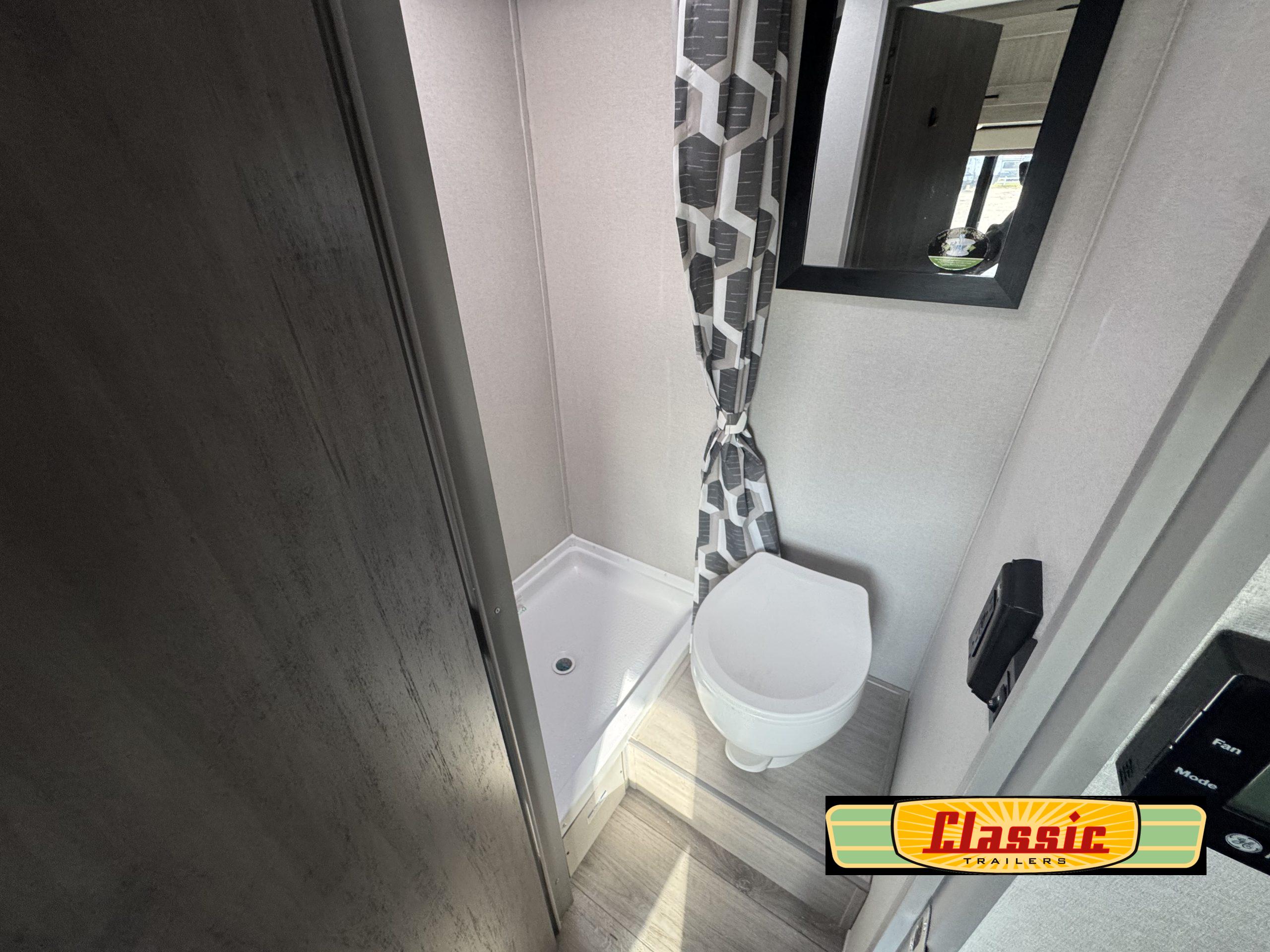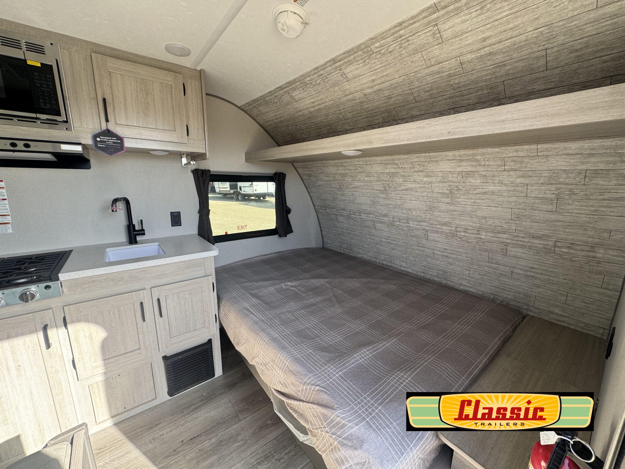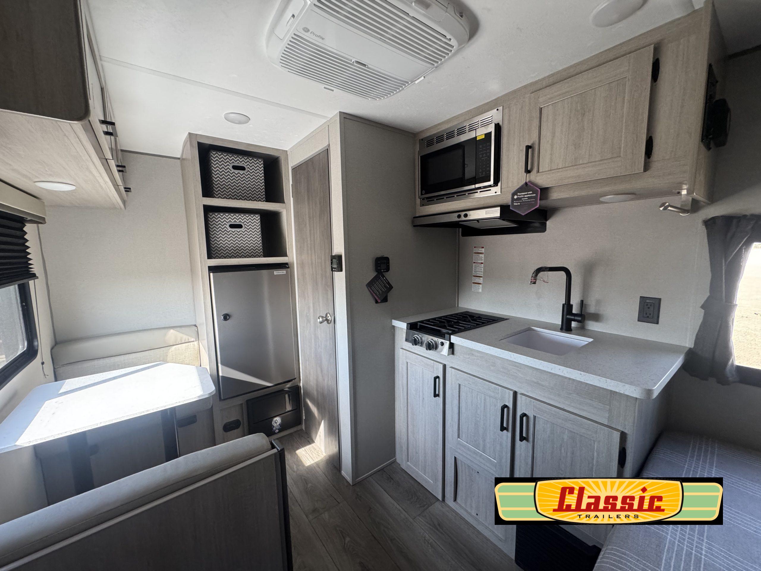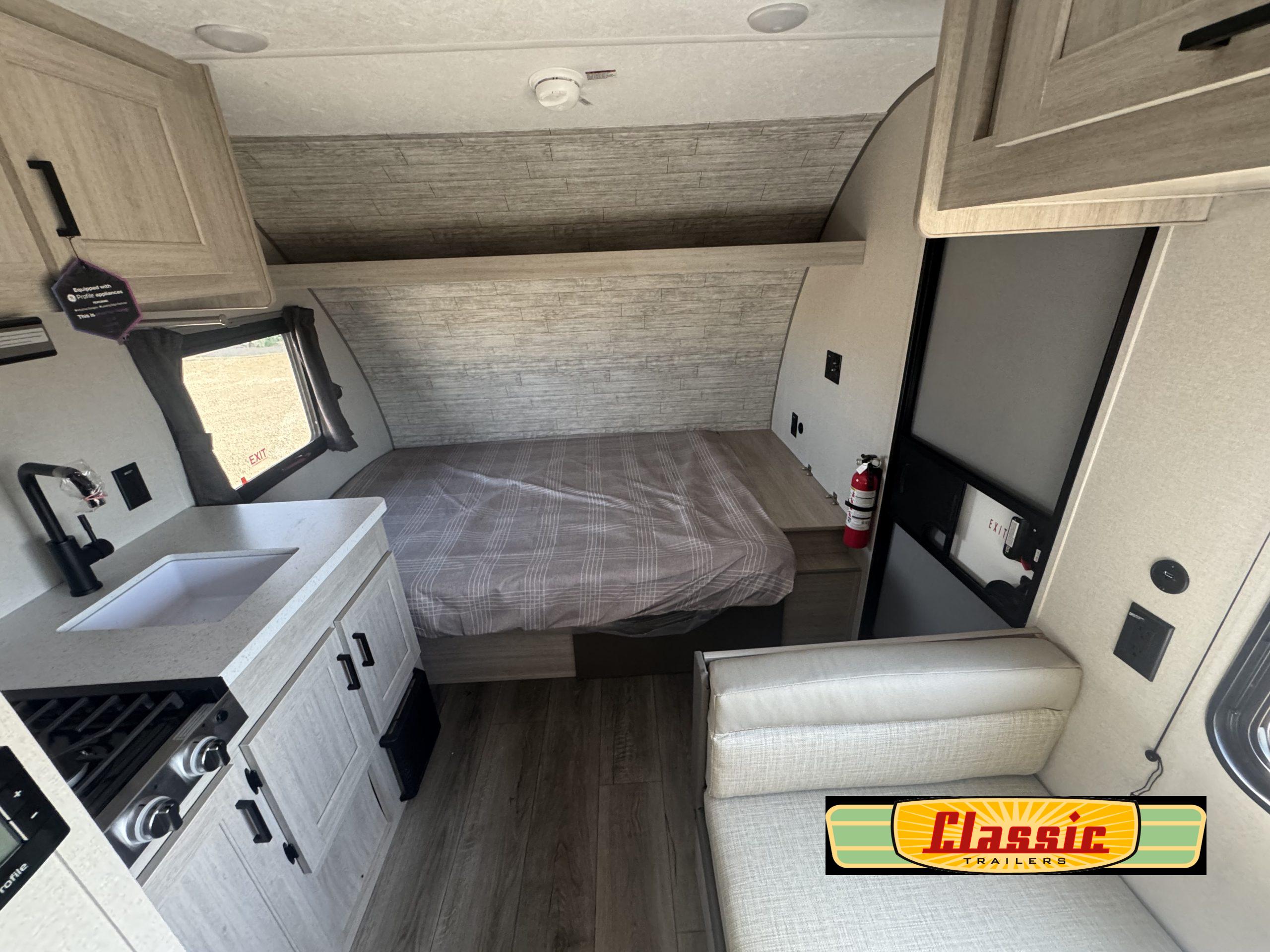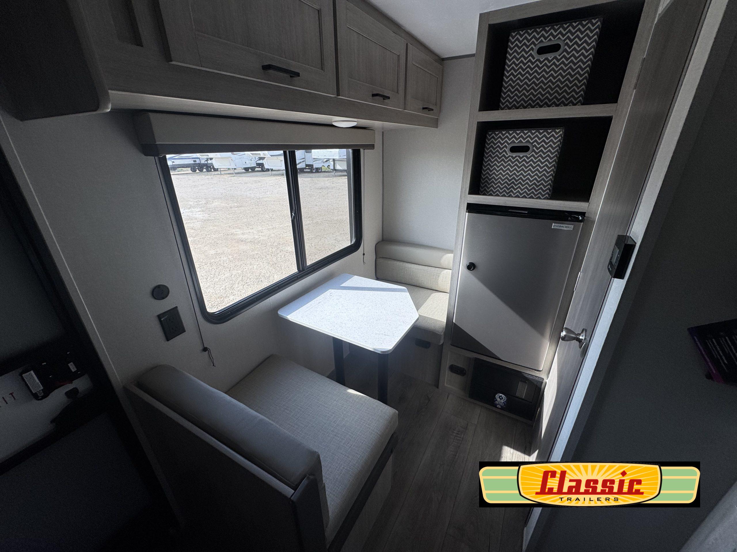Lightweight camping is easier than you think with this travel trailer in tow! The front 54″ x 74″ queen bed will provide a great night’s rest each night, while your overnight guest takes the booth dinette. There is a handy shelf above the front bed for your belongings plus additional bedroom storage. A private bath includes a 24″ x 32″ shower and a toilet with a mirror behind it so you can freshen up each day. You’ll also find a two burner cooktop and microwave oven to make meals each day plus a 3.3 cu. ft. 12V refrigerator for food storage!