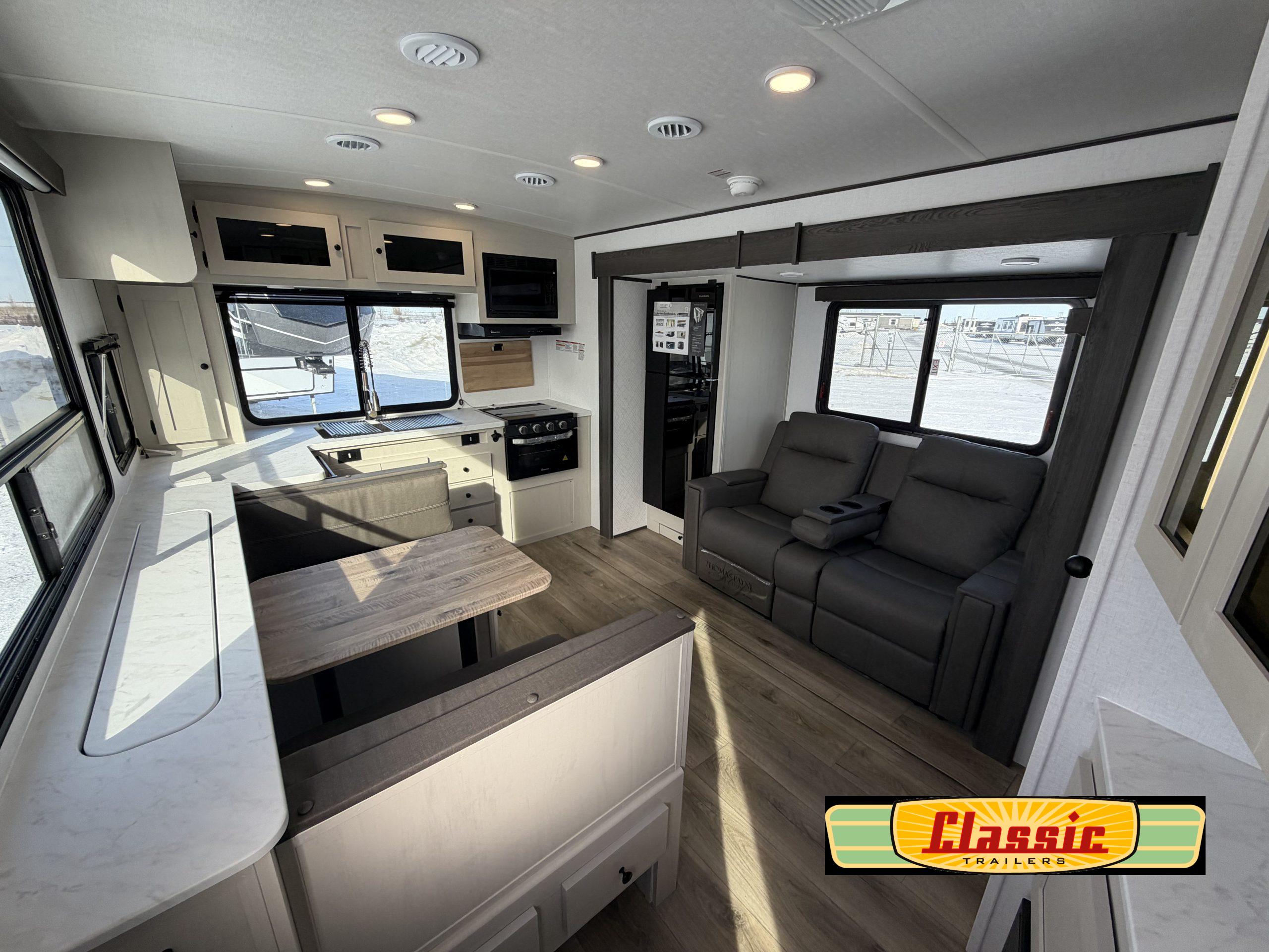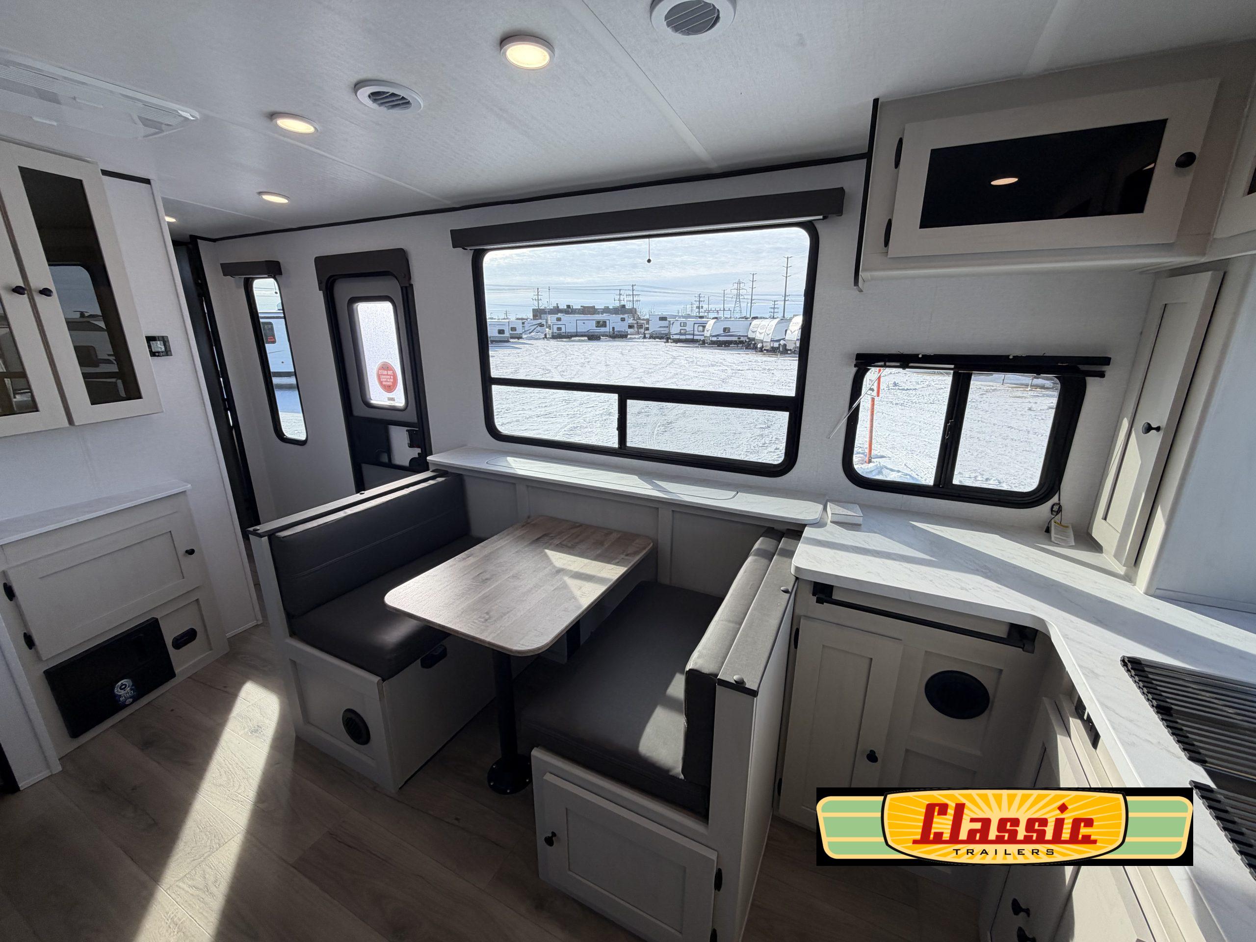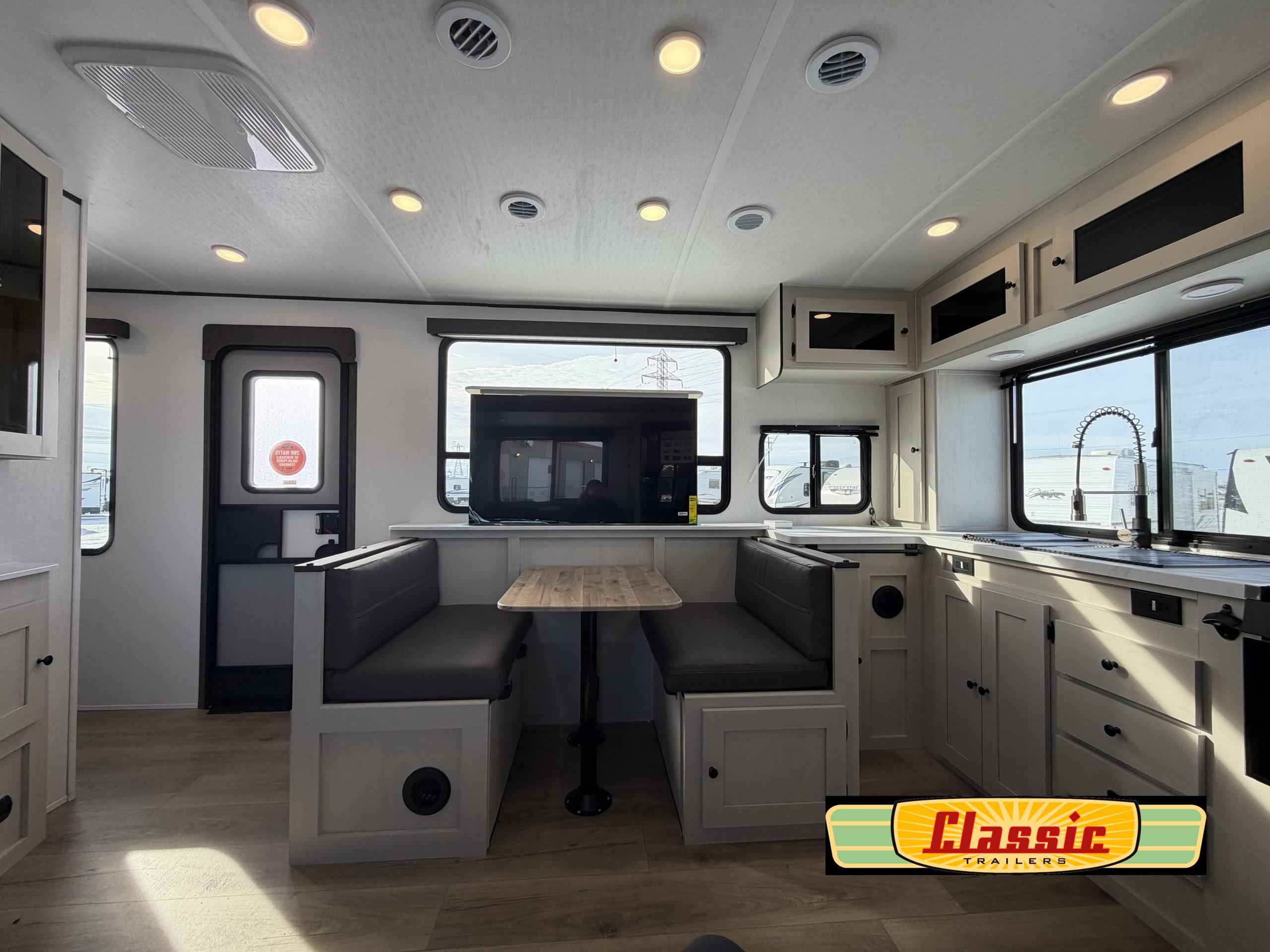Ample living and sleeping space with a 60″ × 80″ queen bed, sleeper-capable furniture, and a booth dinette layout — ideal for comfortable nights and flexible use of the living area.