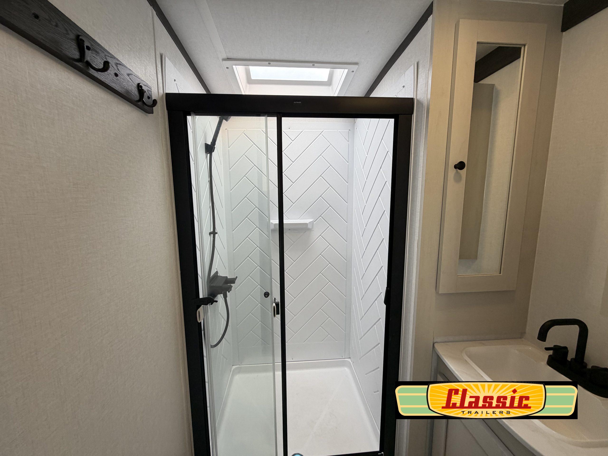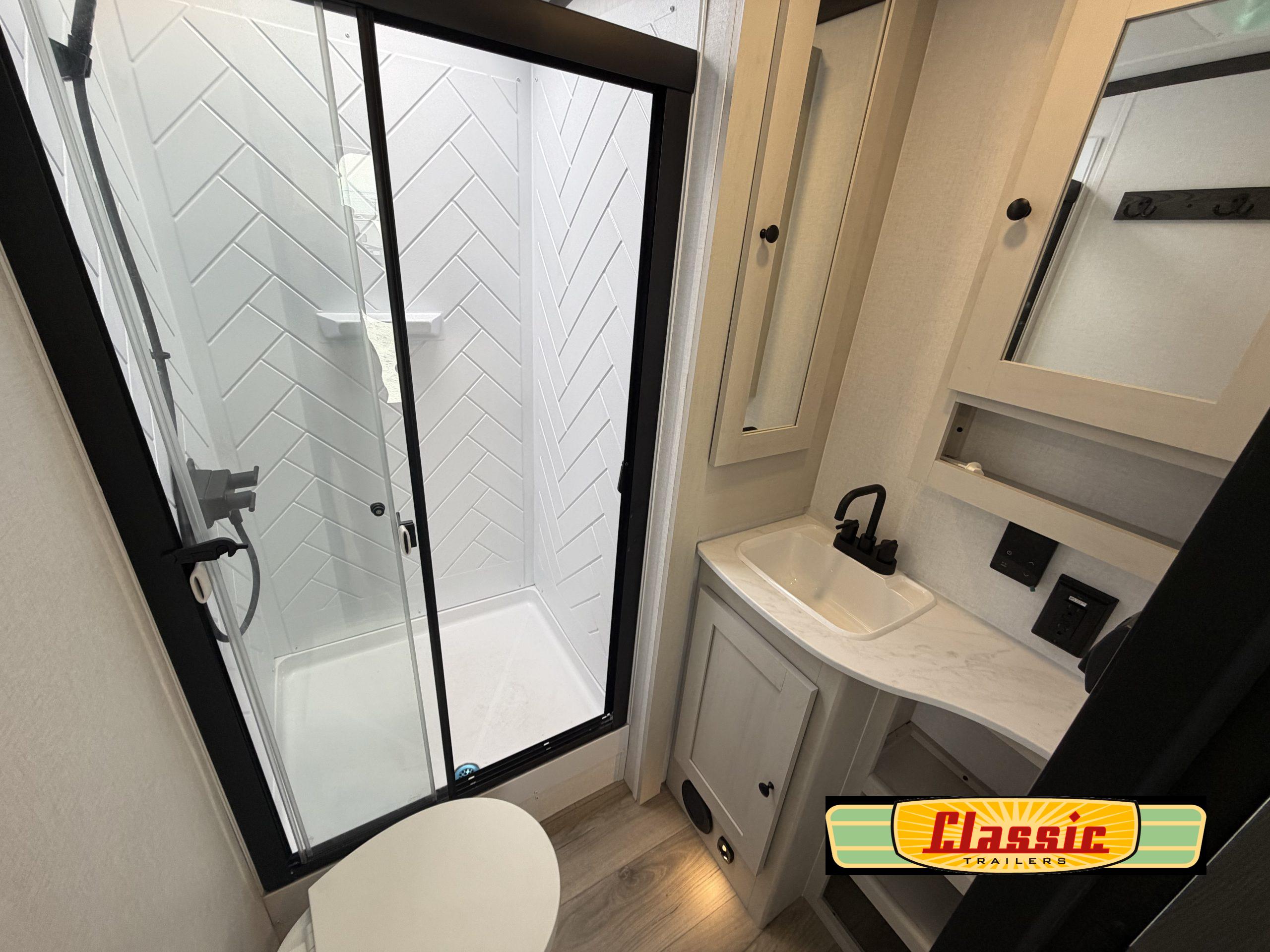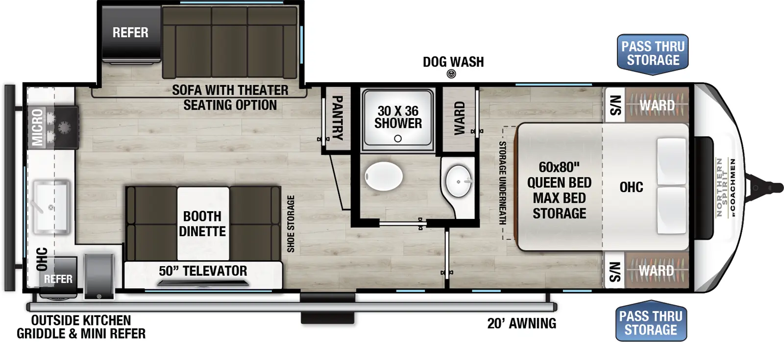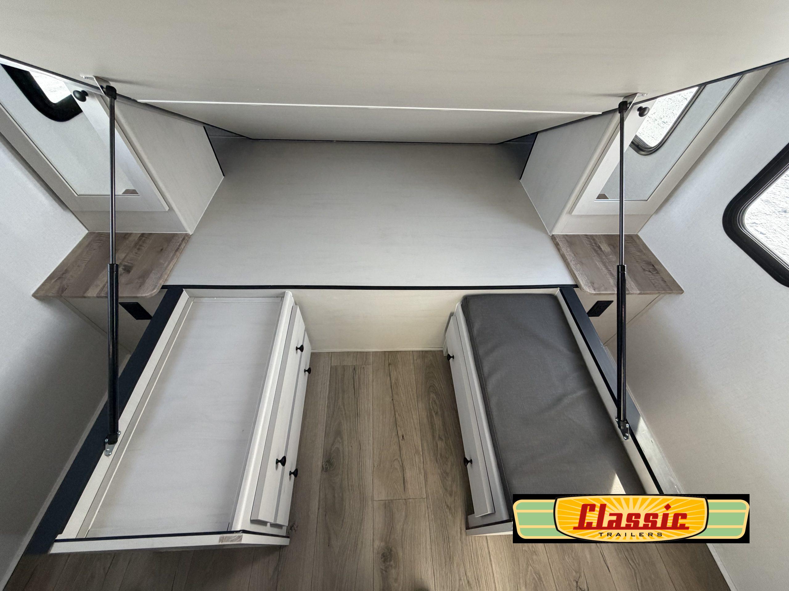 Ample living and sleeping space with a 60″ × 80″ queen bed, sleeper-capable furniture, and a booth dinette layout — ideal for comfortable nights and flexible use of the living area.
